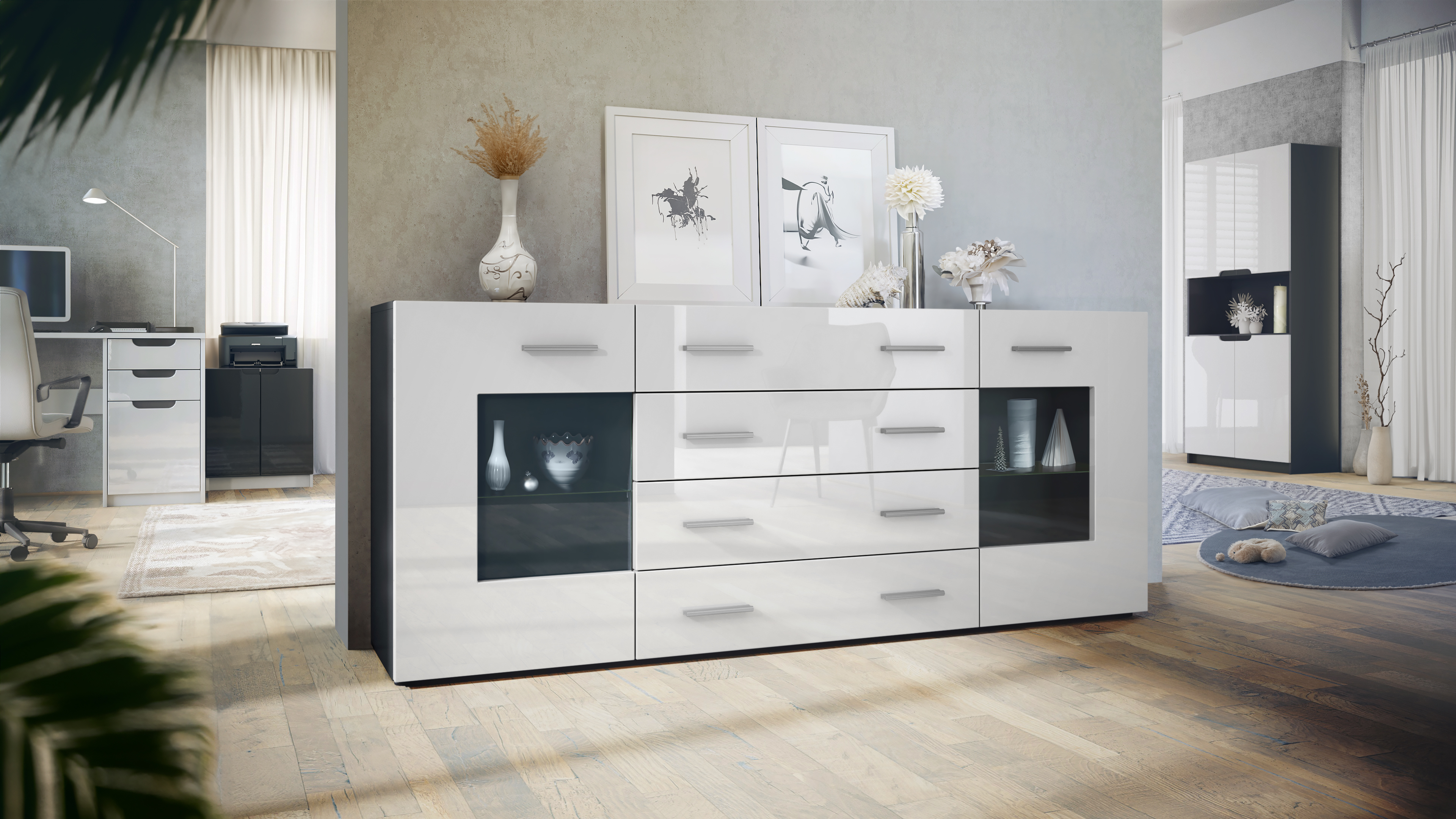Die innenliegenden Schubkästen laufen auf stabilen Metalllaufschienen und ermöglichen eine komfortable Nutzung. Die beiden Vitrinentüren mit Glaseinlegeböden verleihen dem Möbelstück eine elegante Optik und setzen Dekorationsartikel stilvoll in Szene. Silberfarbene Kunststoffgriffe runden das Design ab und harmonieren mit verschiedenen Einrichtungsstilen.