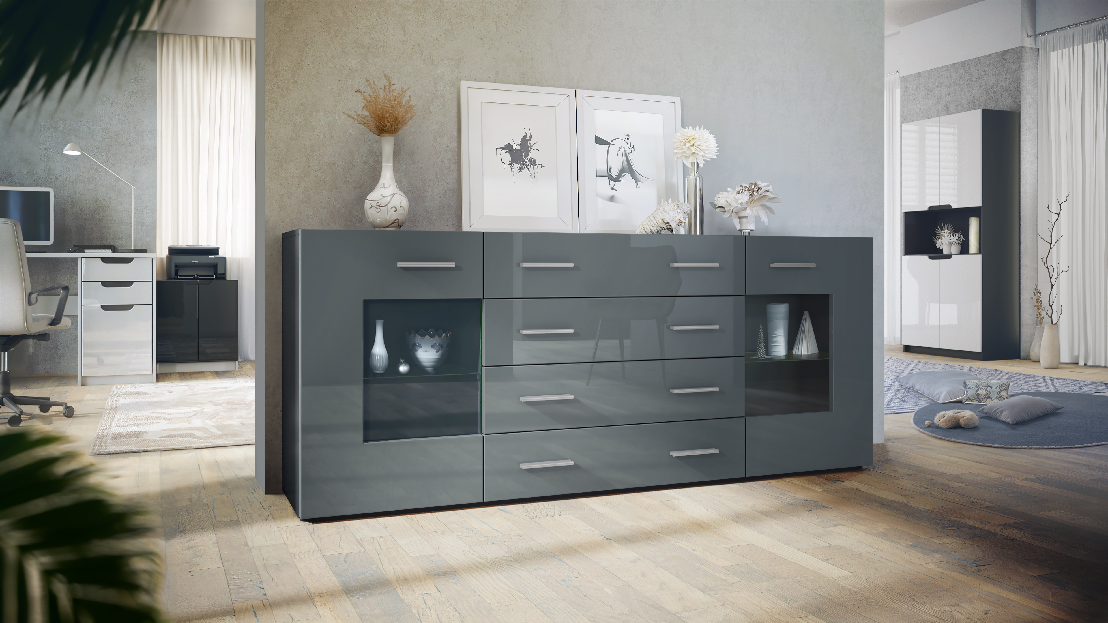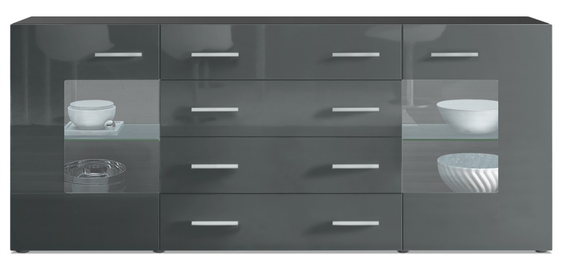 Produktinformationen "Sideboard Noah V2 4 Schubladen und 2 flexible Glaseinlegeböden Schwarz matt/Grau Hochglanz (166 x 72 x 35)"