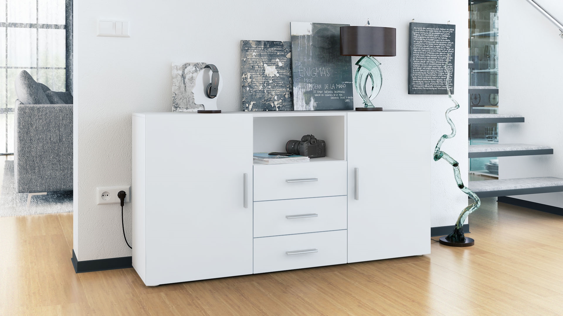 Ob als modernes Sideboard im Wohnzimmer, Kommodenschrank für's Schlafzimmer, Anrichte im Flur oder als Kommode im Kinderzimmer - die geräumige Kommode Skadu präsentiert sich als praktisches Möbelstück mit modernem Design, hergestellt in Deutschland. Der Beistellschrank ist mit zwei großen Türen, einem offenen Fach und drei leichtgängigen Schubladen ausgerüstet. Diese verlaufen dank Laufschienen aus Metall nahezu geräuschlos und sorgen für eine leichte Handhabung. Die Schubladen und Türen der Kommode sind mit dezenten, silbernen Griffen ausgestattet. Hinter den Türen befinden sich jeweils zwei geräumige Fächer mit Einlegeboden. Eine Rückwand in Holzoptik aus Hartfaserplatten ist im Lieferumfang enthalten.