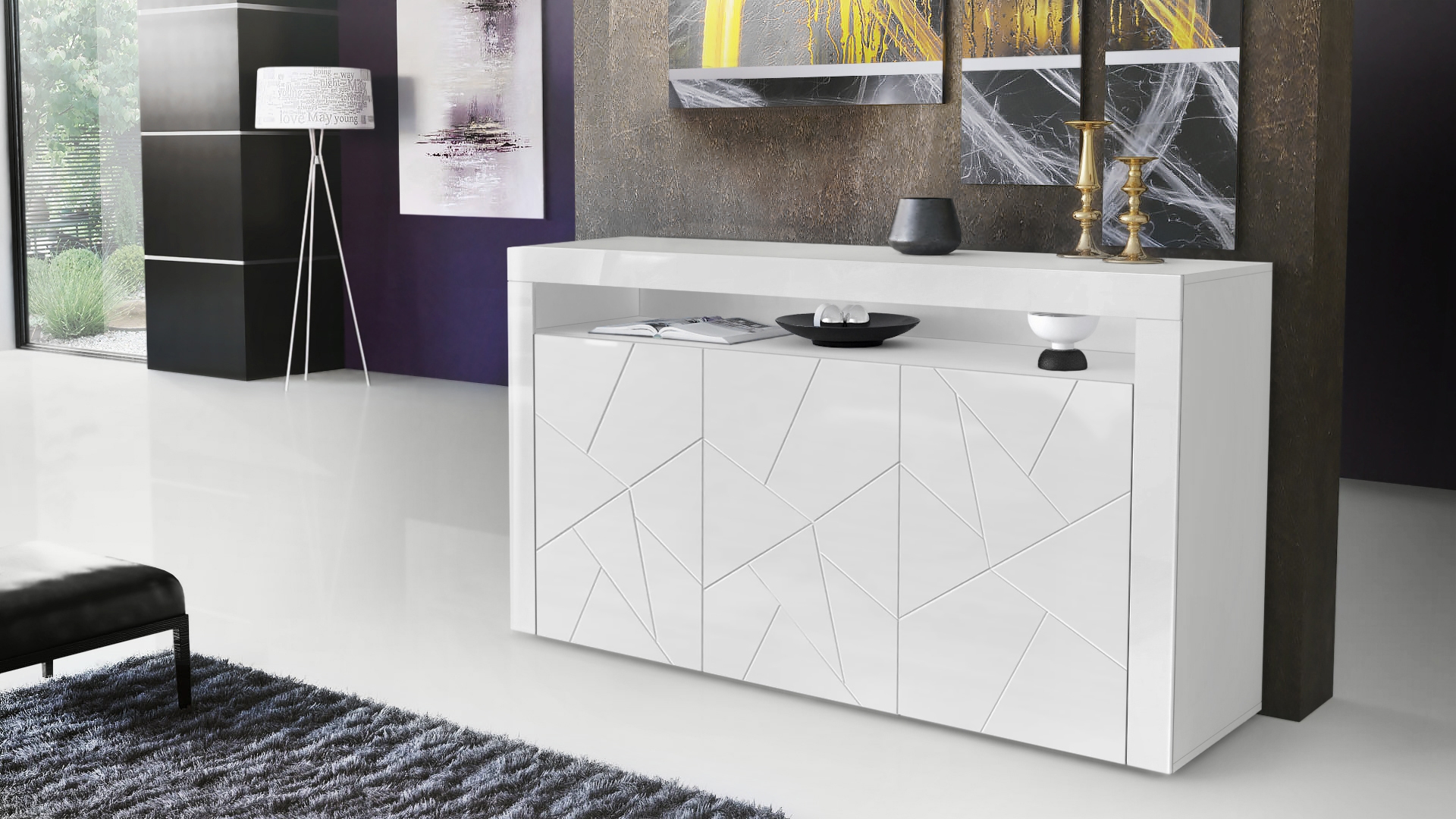 Produktinformationen "Sideboard Valencia mit 3 Türen und 1 offenem Fach Weiß matt&glänzend mit 3D Struktur (155x92x40 cm)"