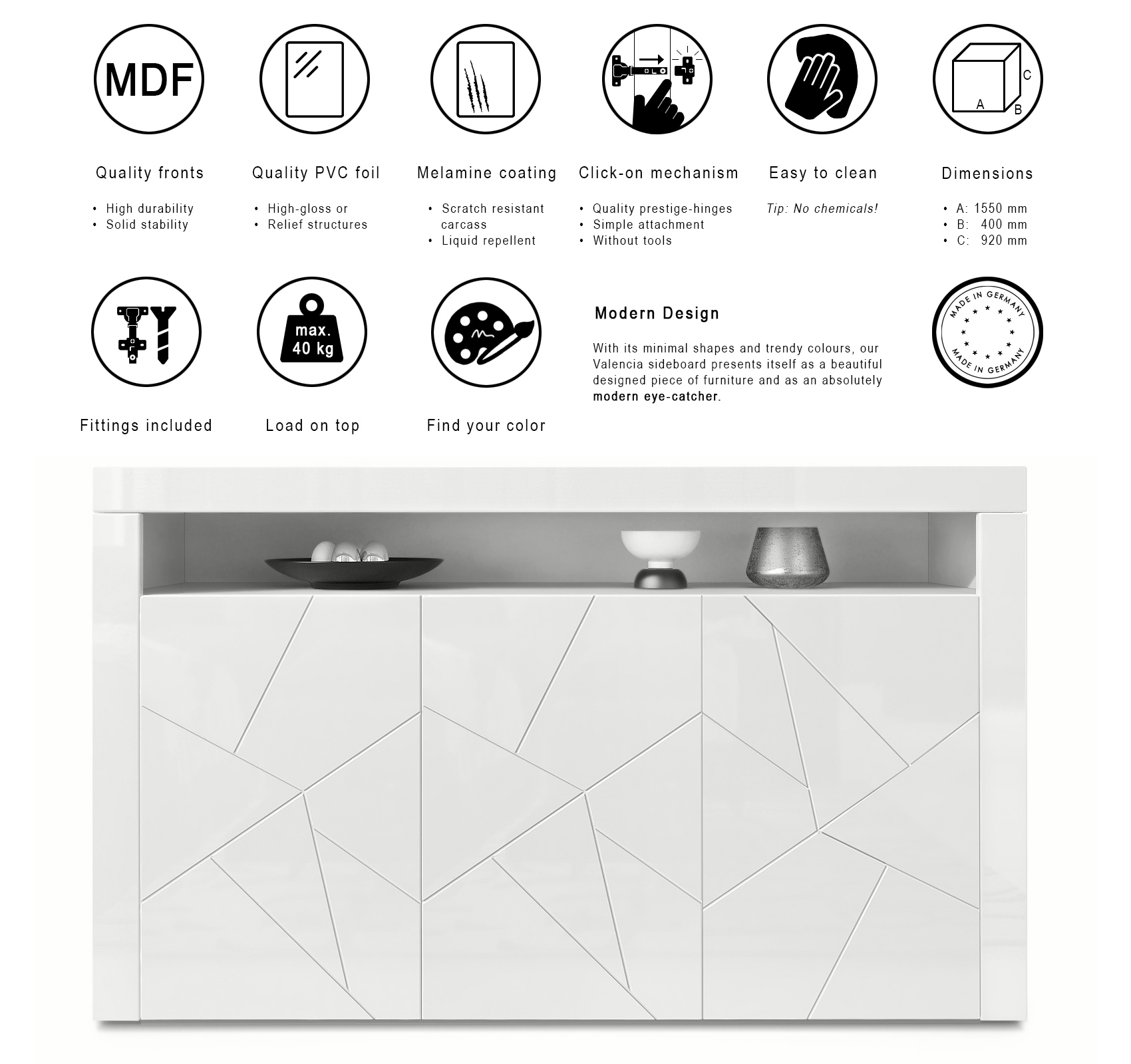 Ob als modernes Sideboard im Wohnzimmer, Kommodenschrank für's Schlafzimmer, Anrichte im Flur oder als Kommode im Kinderzimmer - das geräumige Sideboard Valenica präsentiert sich als praktisches Möbelstück mit einer breiten, umlaufenden Rahmenverblendung, hergestellt in Deutschland. Der Beistellschrank ist mit drei großen Türen und einem offenen, durchgehenden Fach darüber ausgerüstet. Hinter den Türen befinden sich je zwei geräumige Fächer mit Einlegeboden. Die Türen lassen sich ganz bequem durch praktische Überstände öffnen. Eine Rückwand in Holzoptik aus Hartfaserplatten ist im Lieferumfang enthalten.