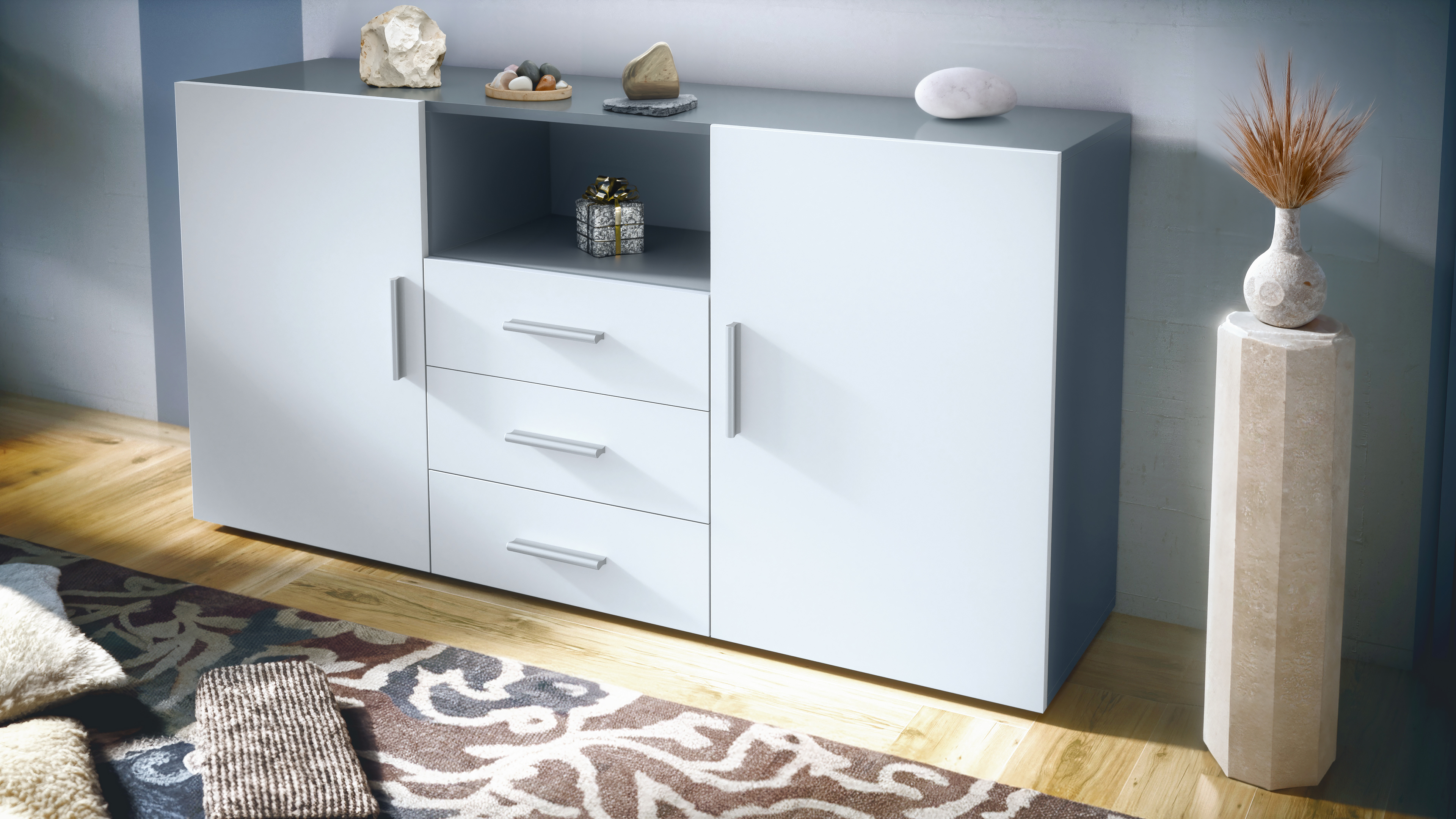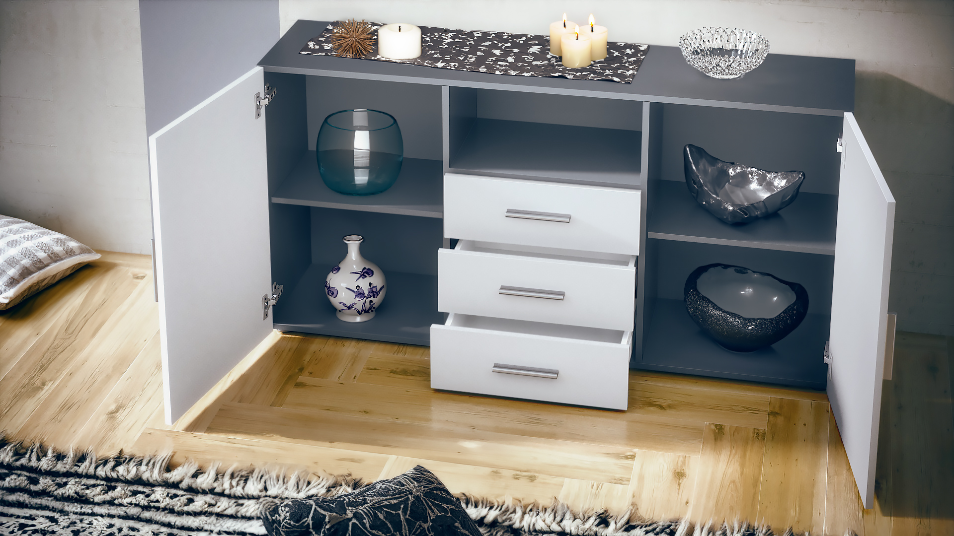 Produktinformationen "Skadu Sideboard Anthrazit mit 2 Türen, 3 Schubladen und 1 offenem Fach Anthrazit matt/Weiß matt (138,5 x 71,5 x 35 cm)"