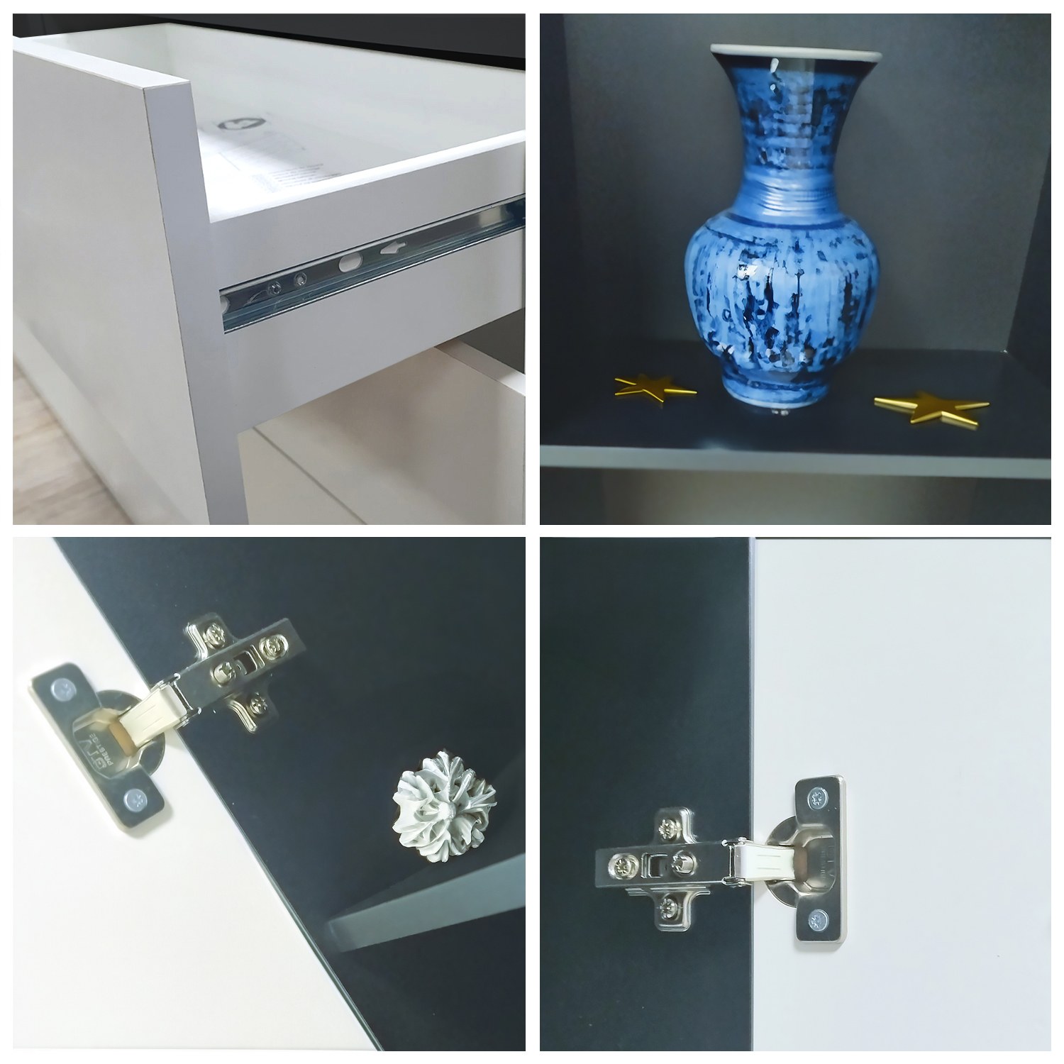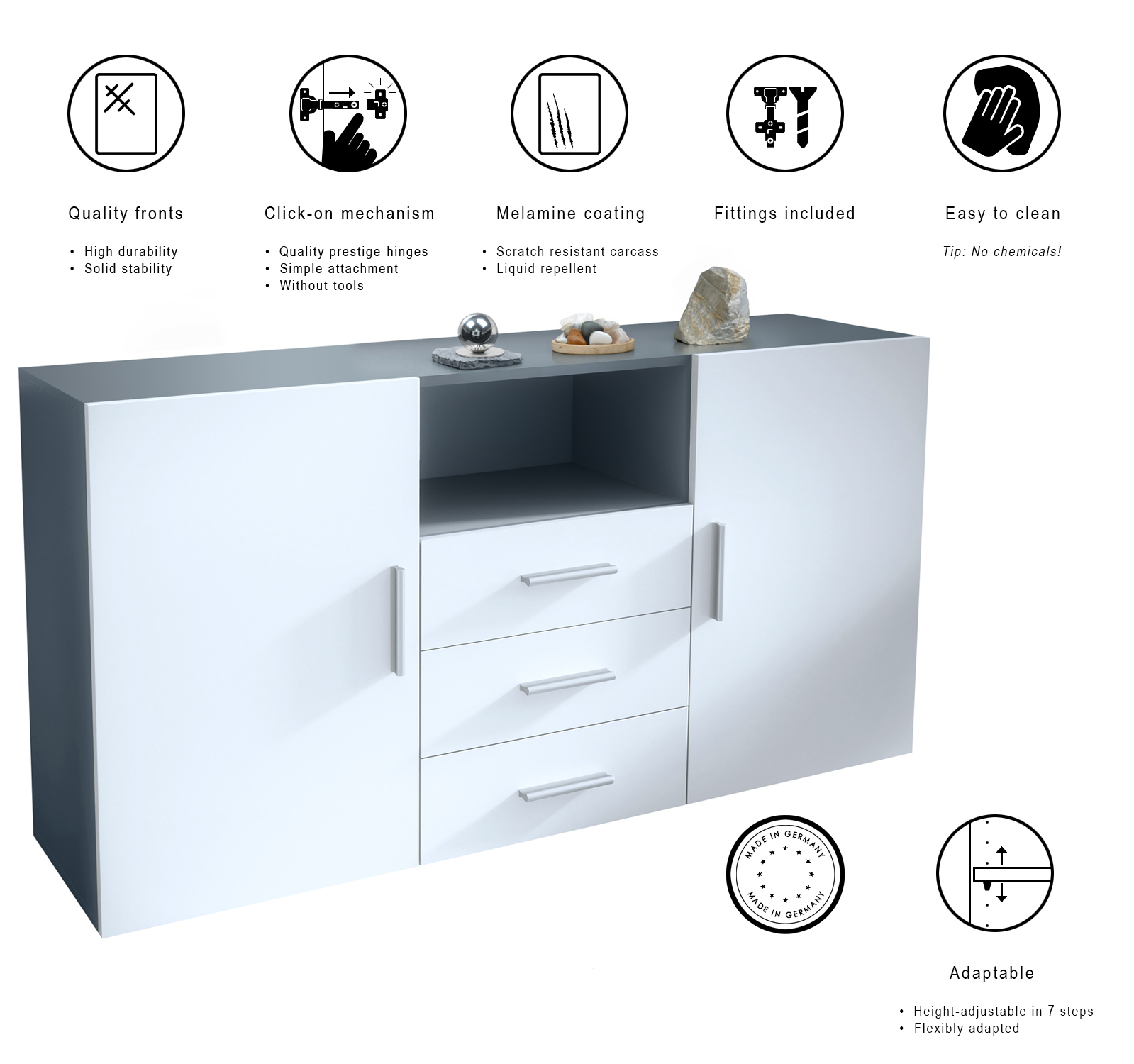 Durch das schlichte, moderne Design lässt sich die Kommode mit vielen verschiedenen Einrichtungsstilen kombinieren und sowohl als Wohnzimmerschrank, Kommode im Schlafzimmer oder als TV-Sideboard einsetzen. Für eine besondere Eleganz sorgen die Fronten der Türen- und Schubladenkommode. Durch die Oberflächenbeschichtung erhalten Sie ein besonders pflegeleichtes Produkt. Für die Reinigung können Sie auf Chemie verzichten - es reicht ein leicht angefeuchtetes Tuch, um die wasserfeste Oberfläche angemessen zu reinigen.