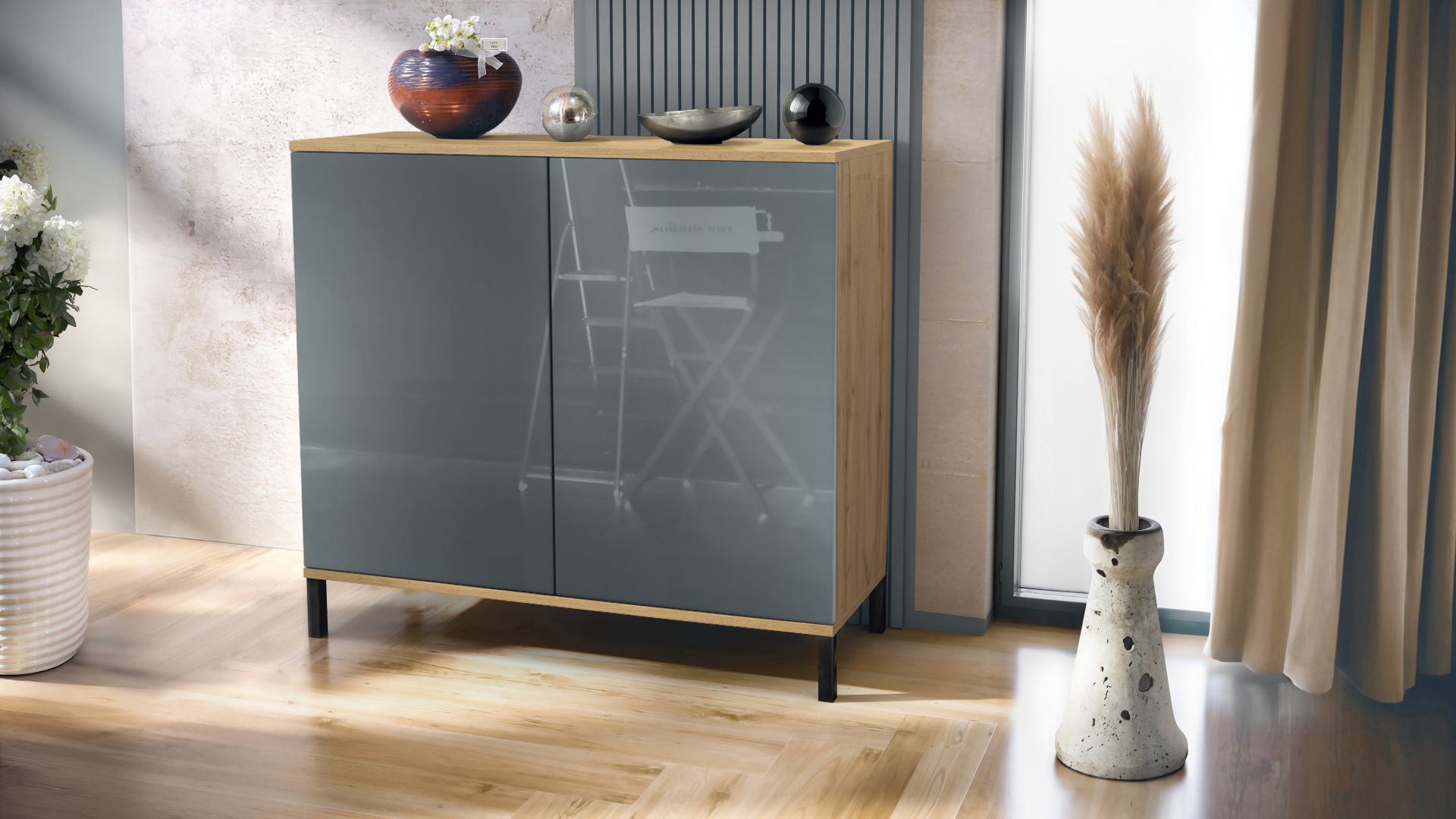 Produktinformationen "Skadu V3 Kommode Eiche Evoke mit 2 großen Türen Eiche Evoke / Grau Hochglanz (92,5 x 83.5 x 35)"