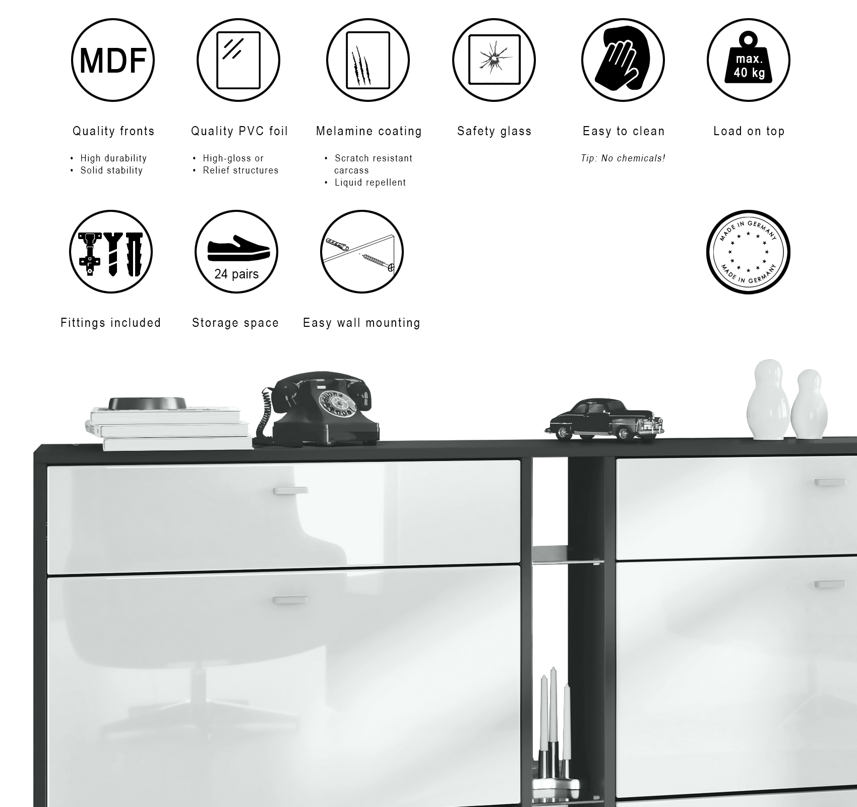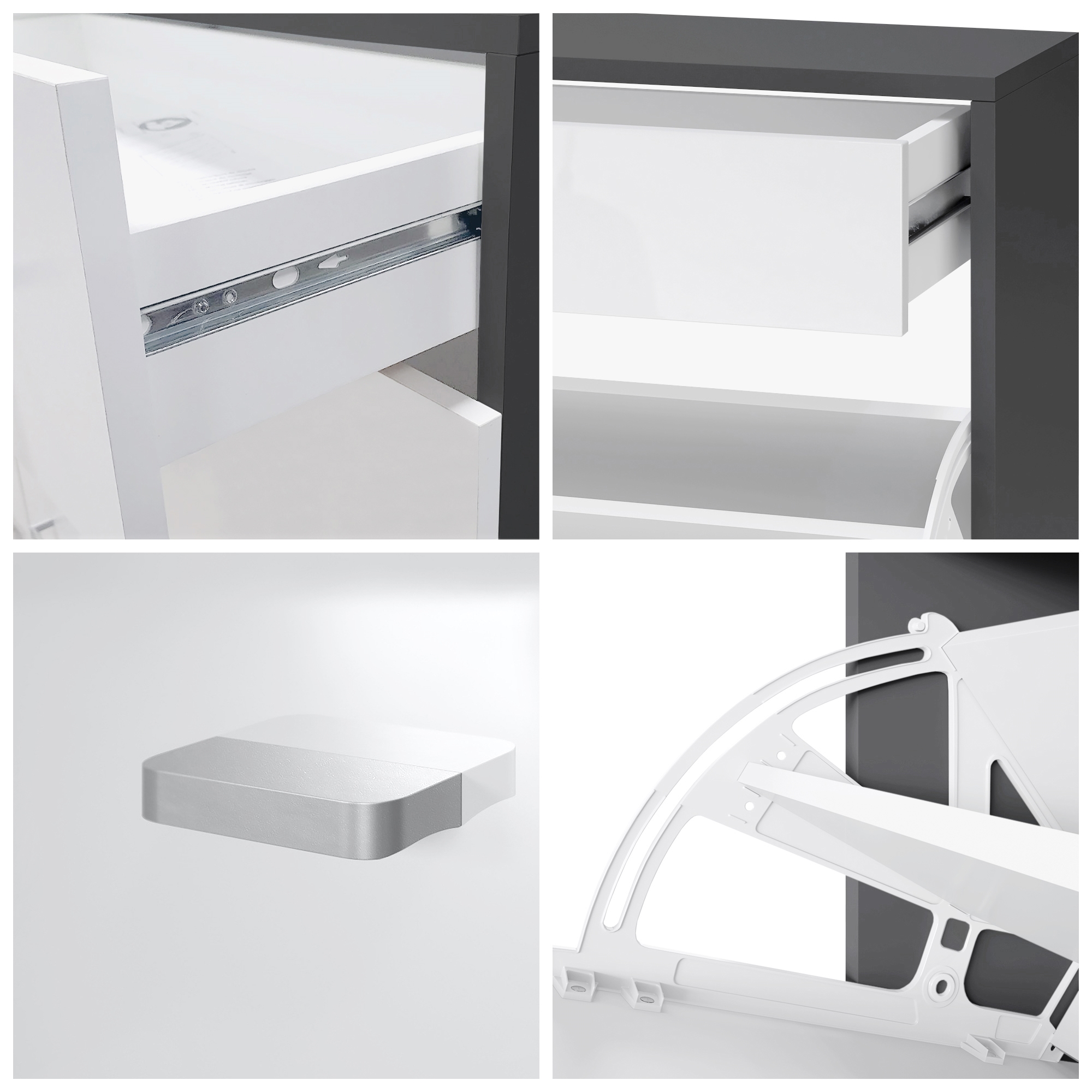 Die Schubkästen laufen auf kugelgelagerten Metallführungen. Zur Gewährleistung der Standsicherheit wird das Möbelstück mit Beschlägen an der Wand fixiert. Die im Lieferumfang enthaltene detaillierte Aufbauanleitung führt Sie Schritt für Schritt durch die Montage.