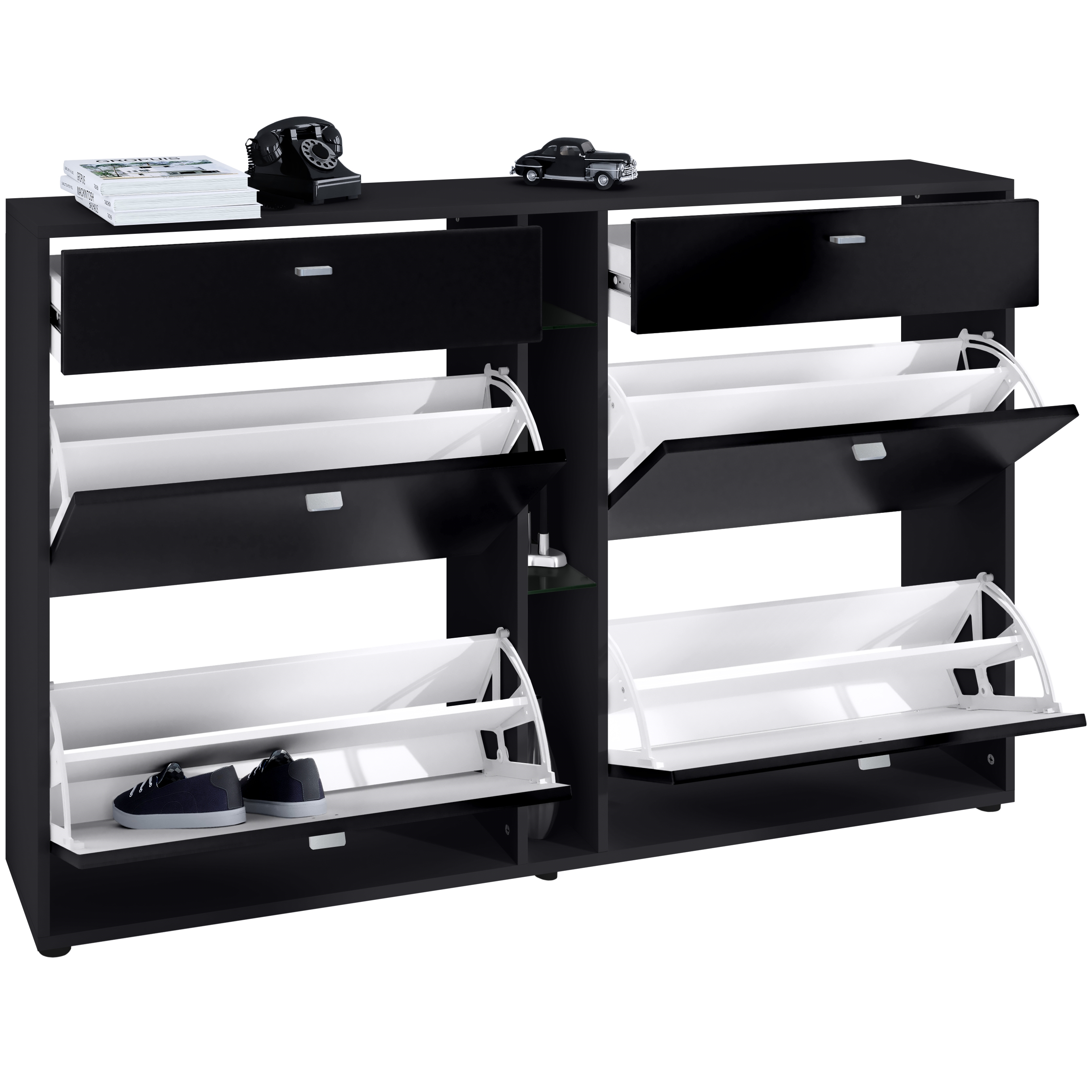 Der Schuhkipper hat vier Klappen, hinter denen sich je zwei Fächer befinden. Pro Fach lassen sich bis zu 3 Paar Schuhe unterbringen. Die Tiefe von 28 cm sorgt dafür, dass auch für etwas höhere Schuhe ausreichend Stauraum verfügbar ist. Nutzen Sie die 4 Klappen, um Ihre Schuhe nach Art – z.B. Pumps, Sandalen, Stiefel und Sportschuhe – oder nach Jahreszeit zu sortieren. So müssen Sie nie wieder unnötig lange nach ihren Lieblingsschuhen suchen.