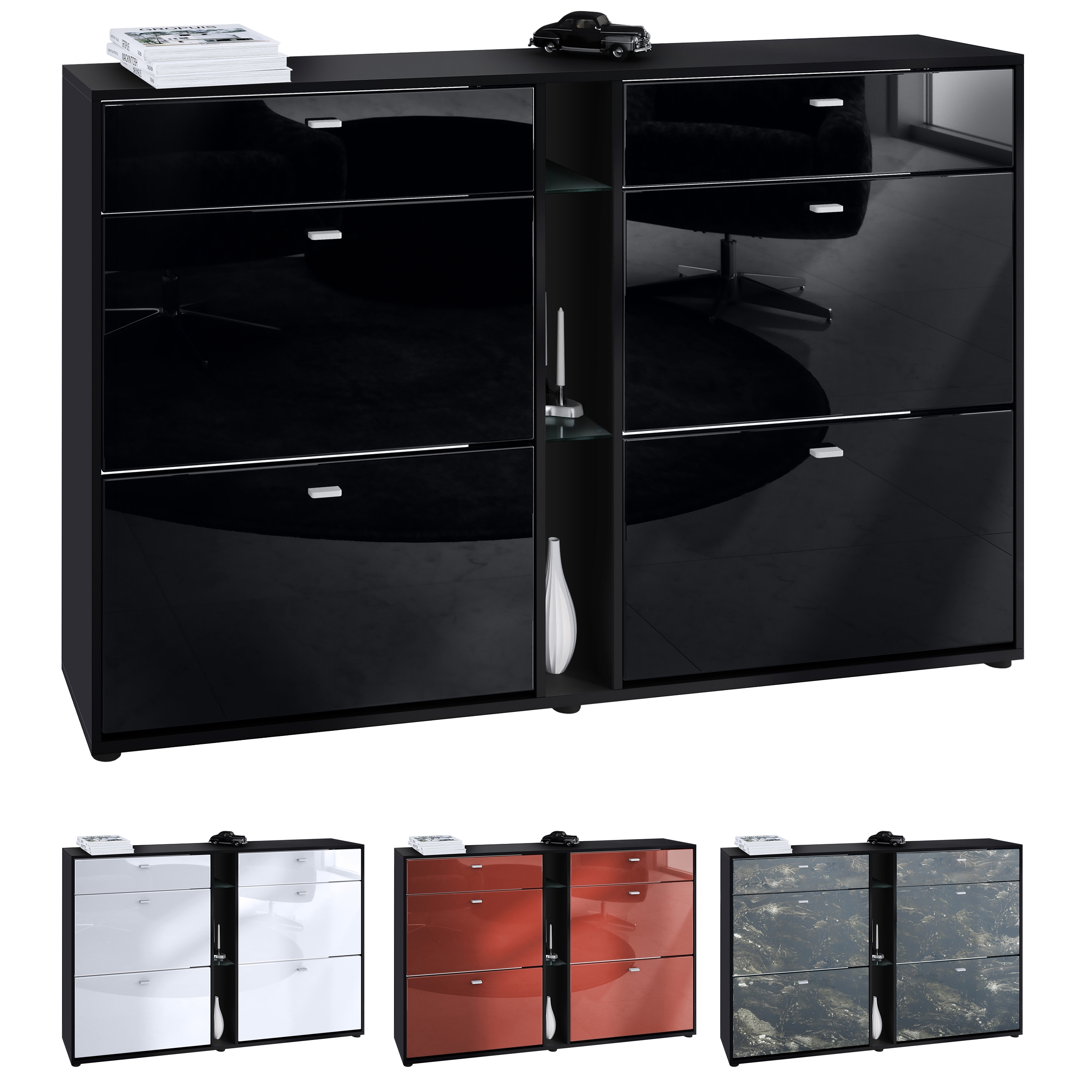 Mittig zwischen den zwei linken und zwei rechten Klappen befinden sich zwei pfiffige offene Glasablagen, welche mit einer optionalen LED-Beleuchtung ausgestattet werden können.