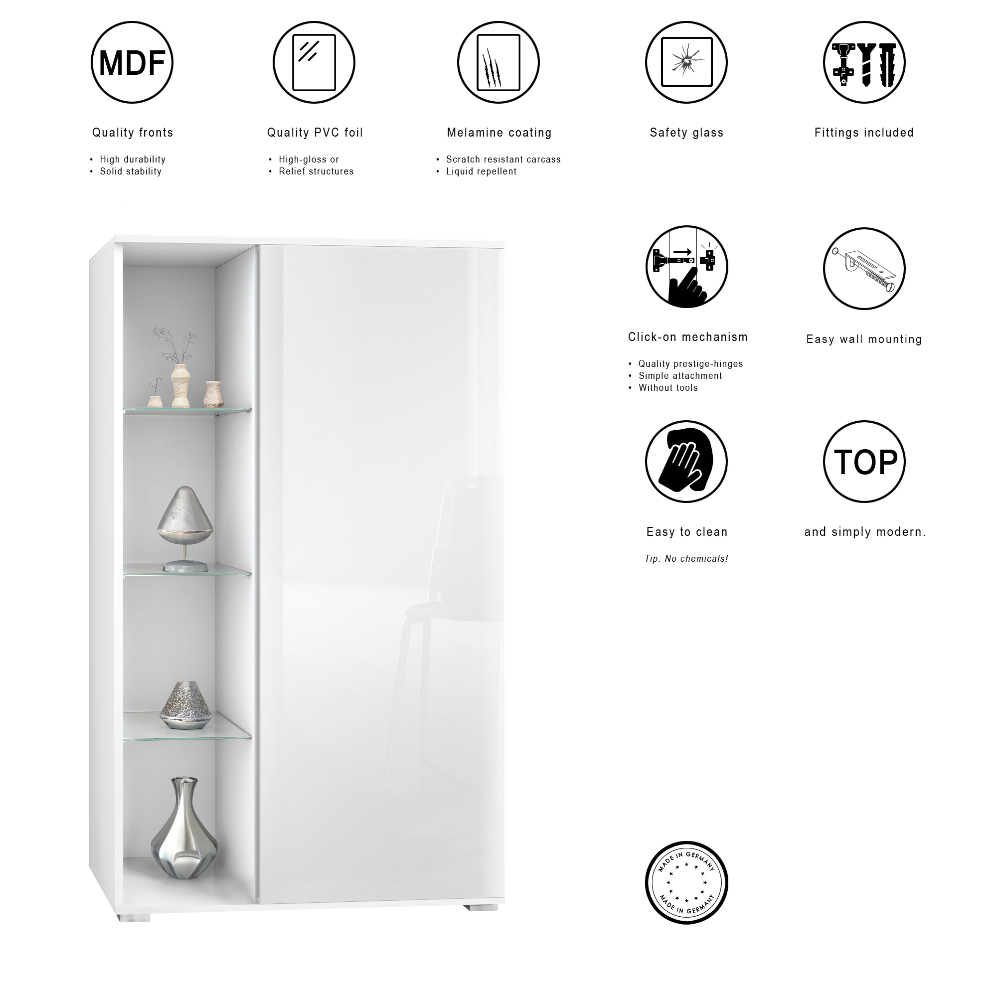 Mit der praktischen Griffmulde lässt sich die Tür mühelos öffnen, während die Klick-Scharniere eine einfache Montage garantieren. Das verwendete Sicherheitsglas sorgt für zusätzliche Sicherheit und Langlebigkeit, damit Ihre wertvollen Gegenstände einen sicheren Platzt finden.