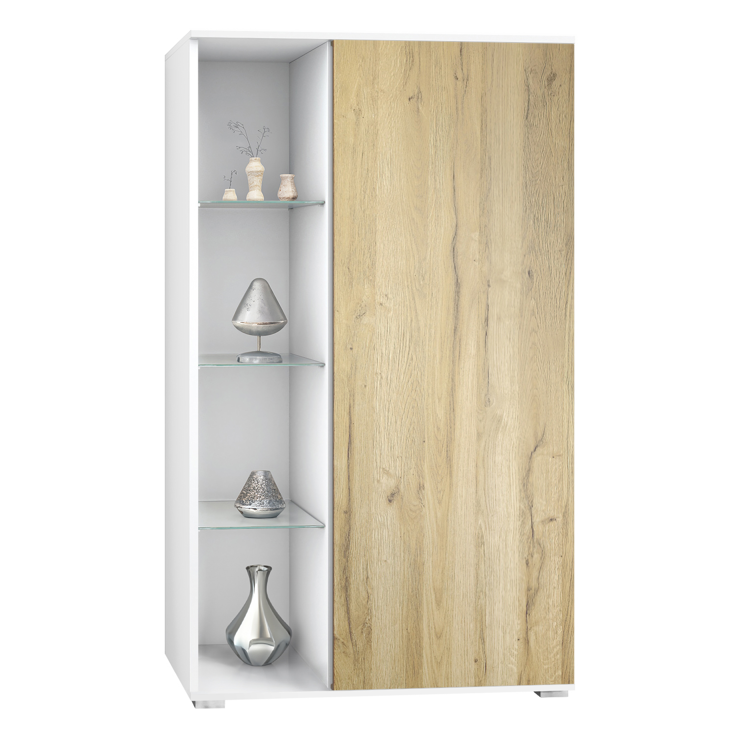 Diese Vitrine besticht durch ihre Flexibilität: Sie können selbst entscheiden, ob die offenen Fächer links oder rechts positioniert werden sollen und ob die Tür sich nach links oder rechts öffnen soll. Diese Anpassungsfähigkeit ermöglicht es Ihnen, die Vitrine perfekt an Ihre Raumgestaltung anzupassen.