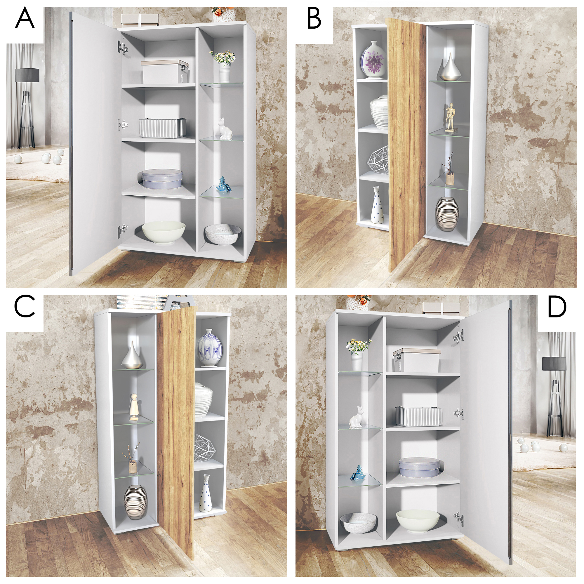 Diese Vitrine besticht durch ihre Flexibilität: Sie können selbst entscheiden, ob die offenen Fächer links oder rechts positioniert werden sollen und ob die Tür sich nach links oder rechts öffnen soll. Diese Anpassungsfähigkeit ermöglicht es Ihnen, die Vitrine perfekt an Ihre Raumgestaltung anzupassen.