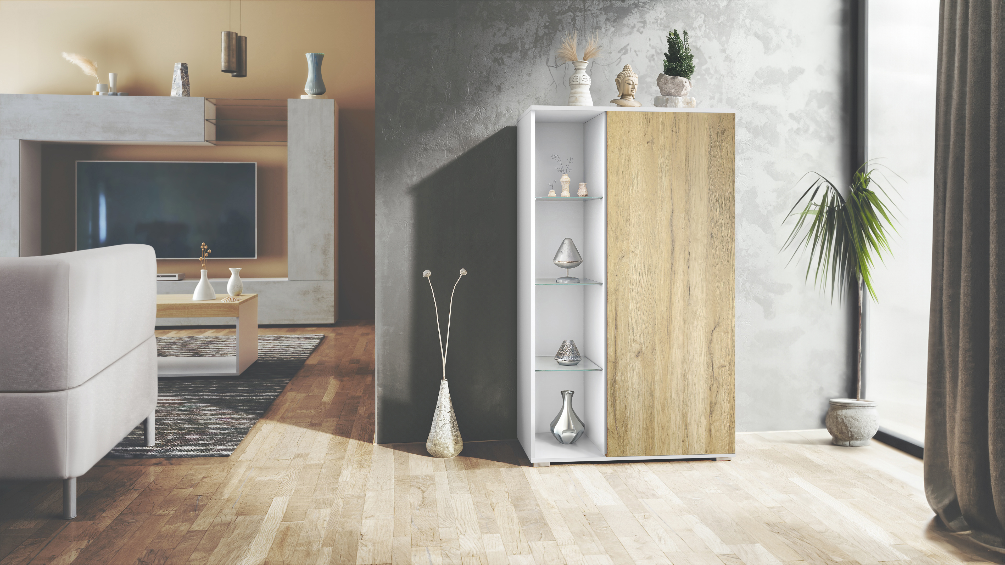 Die Davos Vitrine bietet Qualität und flexible Anpassungsmöglichkeiten in einem eleganten Design. Mit einem robusten Korpus aus hochwertiger Spanplatte und einer strapazierfähigen MDF-Tür ist sie eine ideale Wahl für stilvolle Wohnräume.