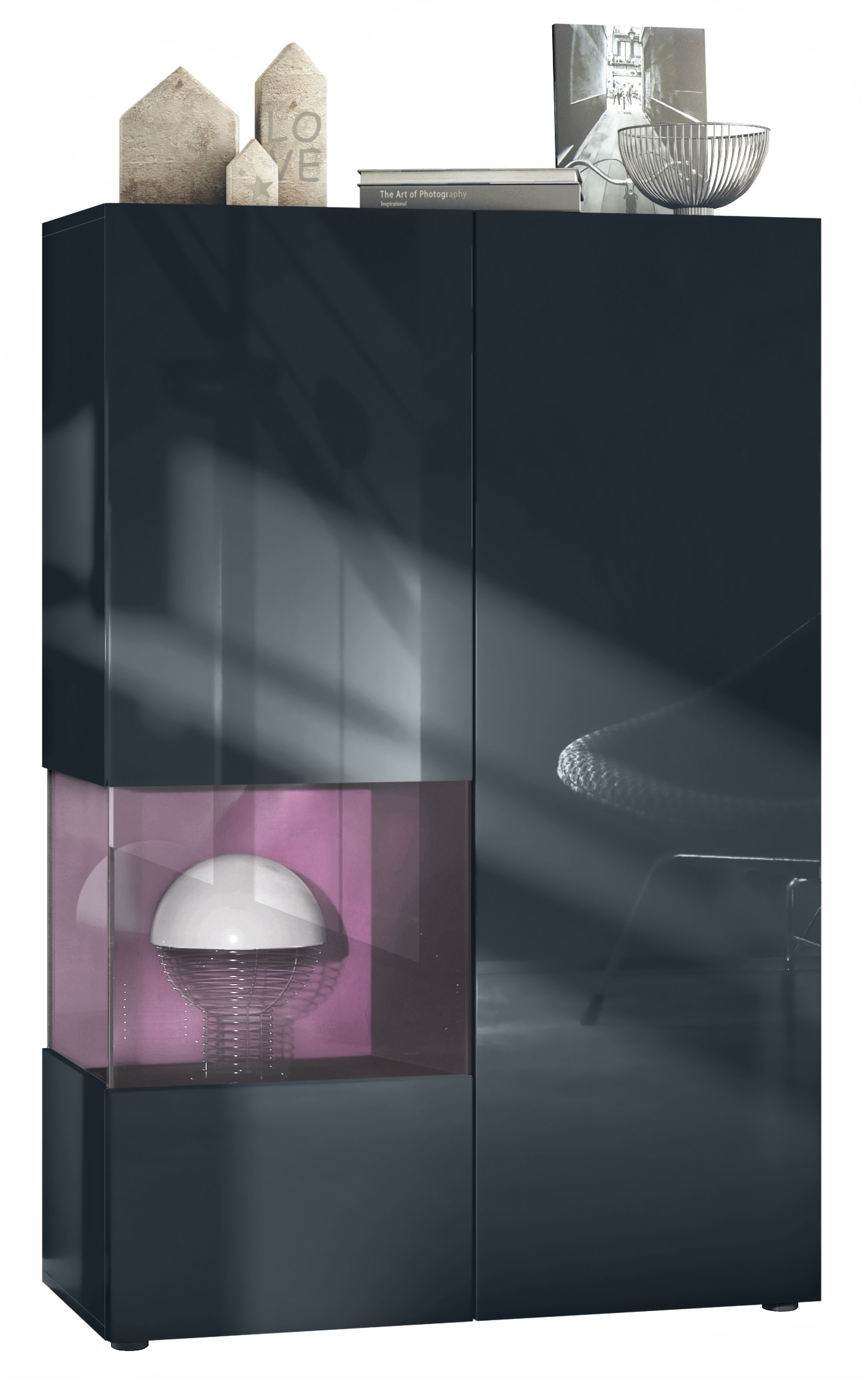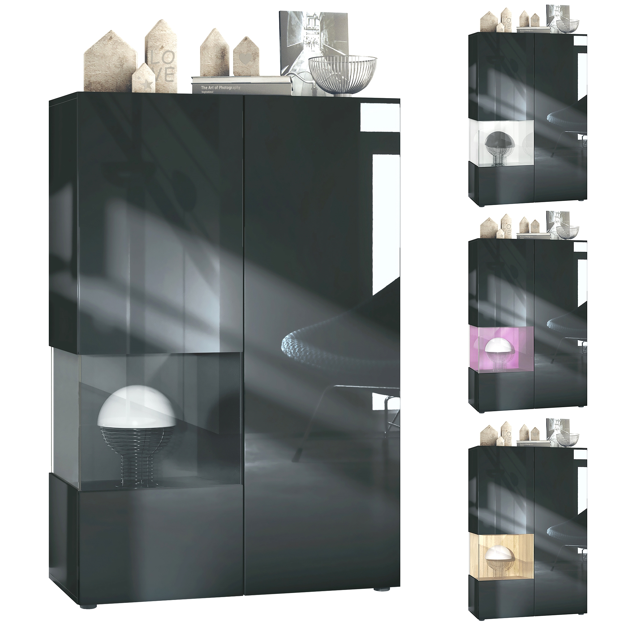 Der Vitrinenschrank Morena V2 eignet sich perfekt für jeden Wohnraum und ist dazu noch ein echter Eye-Catcher. Die geräumige Vitrine präsentiert sich als praktisches Möbelstück mit modernem Design, hergestellt in Deutschland. Die Glasvitrine ist mit zwei Türen ausgestattet, hinter denen sich insgesamt 7 Fächer verbergen. Eine der Türen ist mit einem dekorativen Einsatz aus ESG-Sicherheitsglas versehen, durch den man das sich farblich vom Rest der Vitrine abhebende Fach sehen kann. Dieses kreativ eingesetzte farbige Fach sorgt in Kombination mit den hochglänzenden schwarzen Türen für eine besondere Eleganz. Der Cube ist in vielen verschiedenen Farbvarianten erhältlich. Das Glasfenster kann optional mit einer LED-Beleuchtung mit weißem Licht bestückt werden. Der Vitrinenschrank ist mit einer Rückwand in Holzoptik aus Hartfaserplatten ausgestattet.