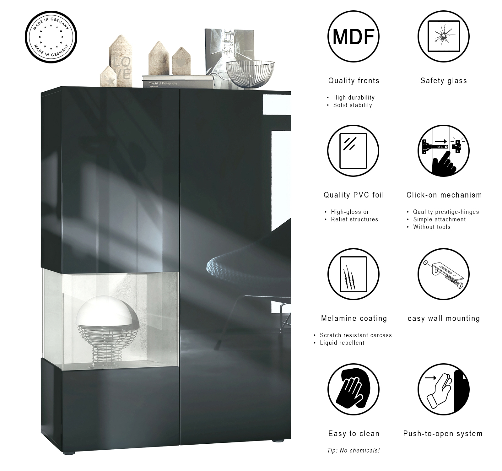 Durch das schlichte, moderne Design lässt sich der Vitrinenschrank mit vielen verschiedenen Einrichtungsstilen kombinieren und sowohl als Vitrine im Wohnzimmer, Flur oder im Gästezimmer einsetzen. Durch die Oberflächenbeschichtung erhalten Sie ein besonders pflegeleichtes Produkt. Für die Reinigung können Sie auf Chemie verzichten - es reicht ein leicht angefeuchtetes Tuch, um die wasserfeste Oberfläche angemessen zu reinigen.