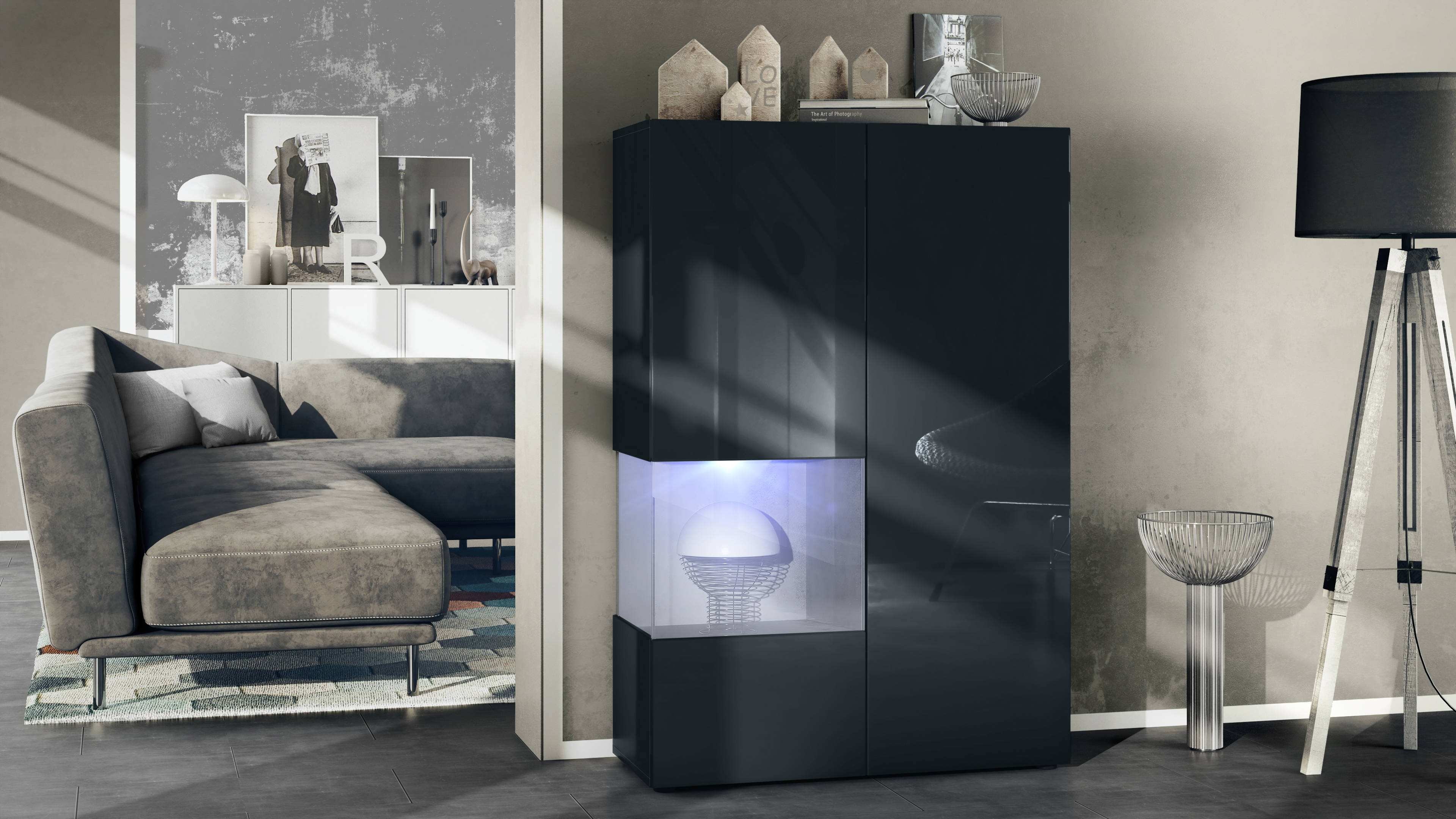 Der Vitrinenschrank Morena V2 eignet sich perfekt für jeden Wohnraum und ist dazu noch ein echter Eye-Catcher. Die geräumige Vitrine präsentiert sich als praktisches Möbelstück mit modernem Design, hergestellt in Deutschland. Die Glasvitrine ist mit zwei Türen ausgestattet, hinter denen sich insgesamt 7 Fächer verbergen. Eine der Türen ist mit einem dekorativen Einsatz aus ESG-Sicherheitsglas versehen, durch den man das sich farblich vom Rest der Vitrine abhebende Fach sehen kann. Dieses kreativ eingesetzte farbige Fach sorgt in Kombination mit den hochglänzenden schwarzen Türen für eine besondere Eleganz. Der Cube ist in vielen verschiedenen Farbvarianten erhältlich. Das Glasfenster kann optional mit einer LED-Beleuchtung mit weißem Licht bestückt werden. Der Vitrinenschrank ist mit einer Rückwand in Holzoptik aus Hartfaserplatten ausgestattet.