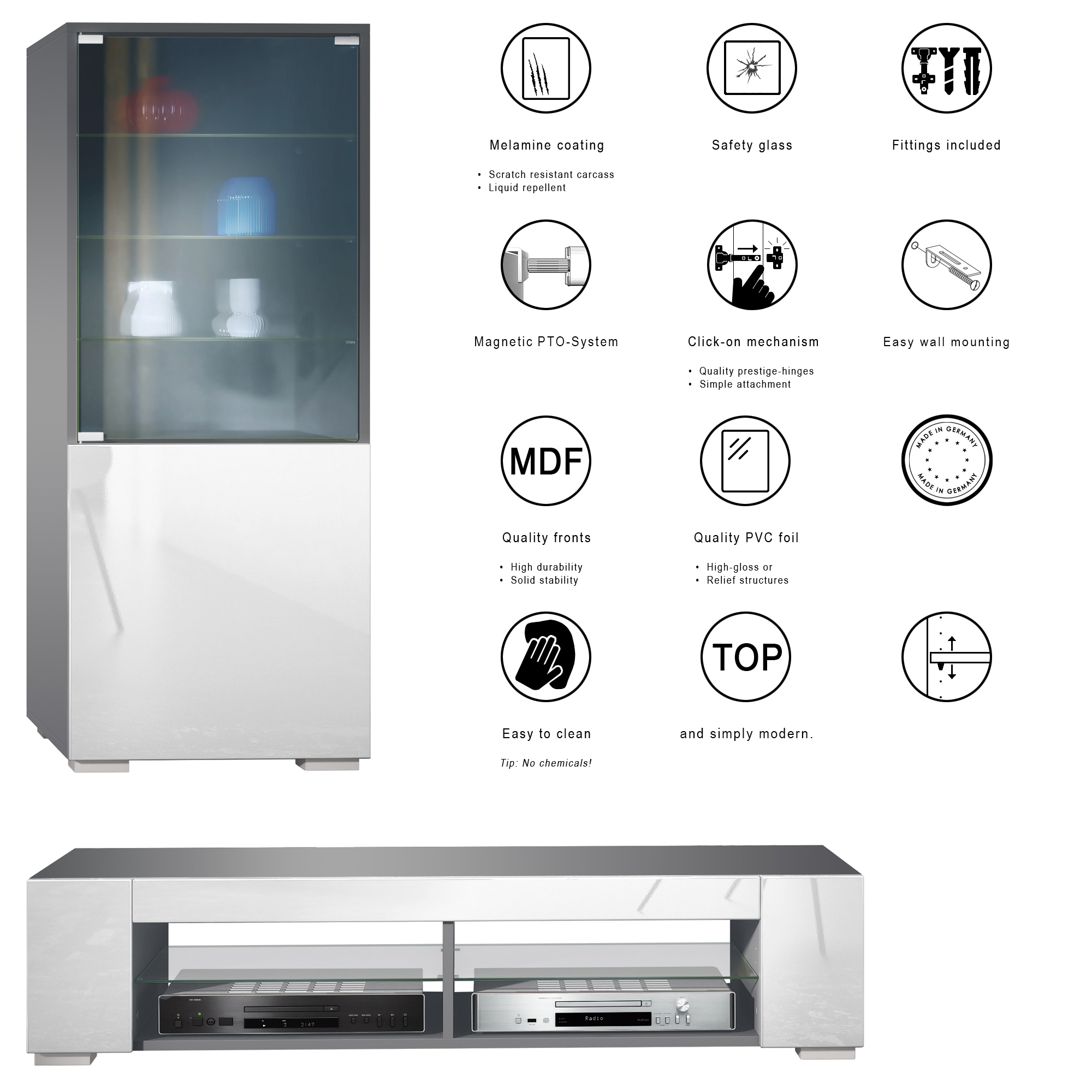 Inklusive LED-Clips: Die Glasböden werden durch die im Lieferumfang enthaltenen LED-Clips stilvoll beleuchtet, um eine angenehme Atmosphäre zu schaffen und Ihre Geräte sowie Dekoration gekonnt in Szene zu setzen. Die Nevada Wohnwand vereint modernes Design, Funktionalität und deutsche Handwerkskunst – eine stilvolle Bereicherung für Ihr Zuhause.Maße TV-Lowboard:
