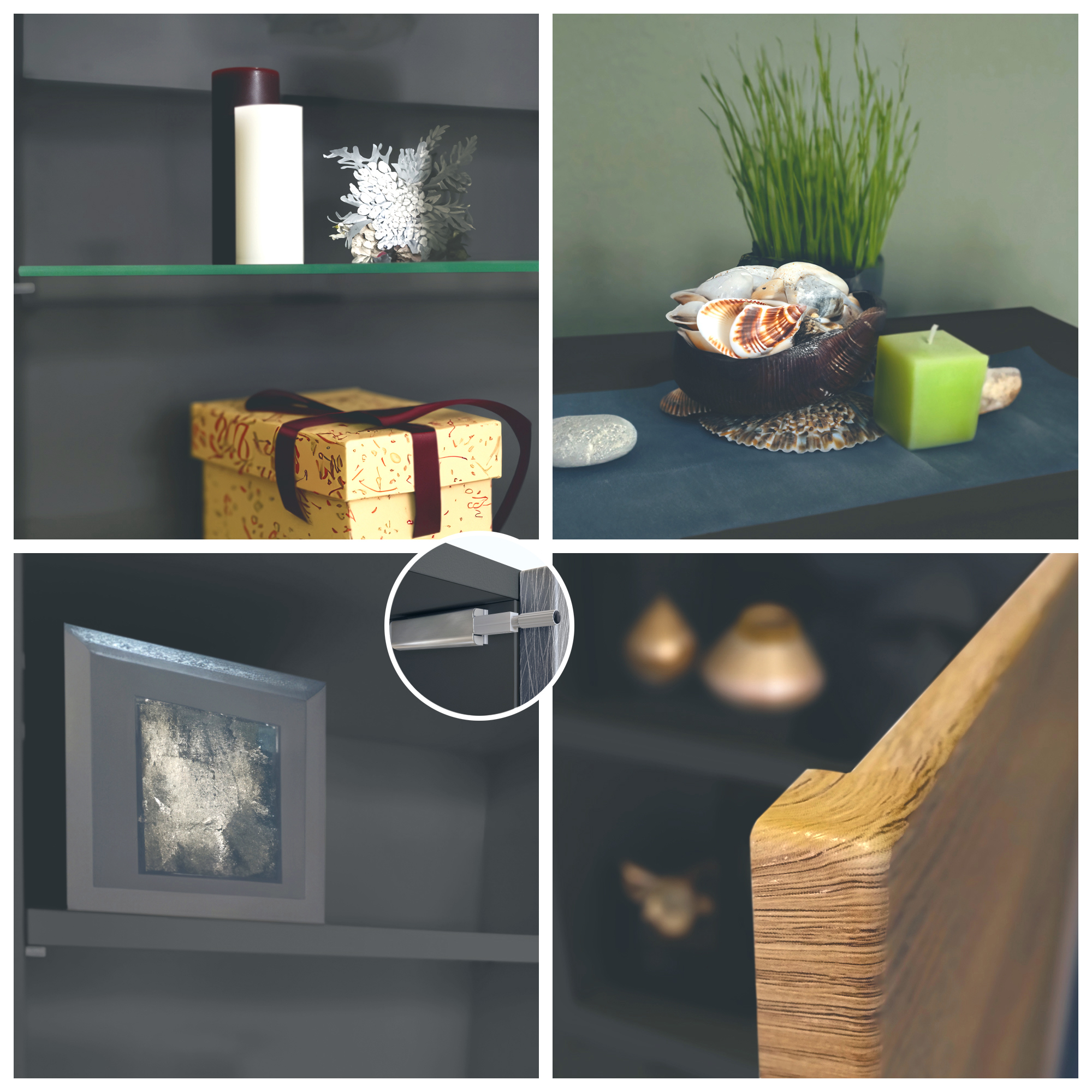 Der Vitrinenschrank bietet großzügigen Stauraum und setzt Ihre Dekorationen hinter einer Glastür perfekt in Szene. Die untere Tür ist in verschiedenen Farben erhältlich und verleiht Ihrem Raum eine persönliche Note. Die Türen sind flexibel montierbar und dank der Push-to-Open-Funktion lässt sich die Glastür mühelos öffnen. Ein Magnet sorgt für sicheren Halt, während die MDF-Tür mit einer Griffmulde ausgestattet ist.