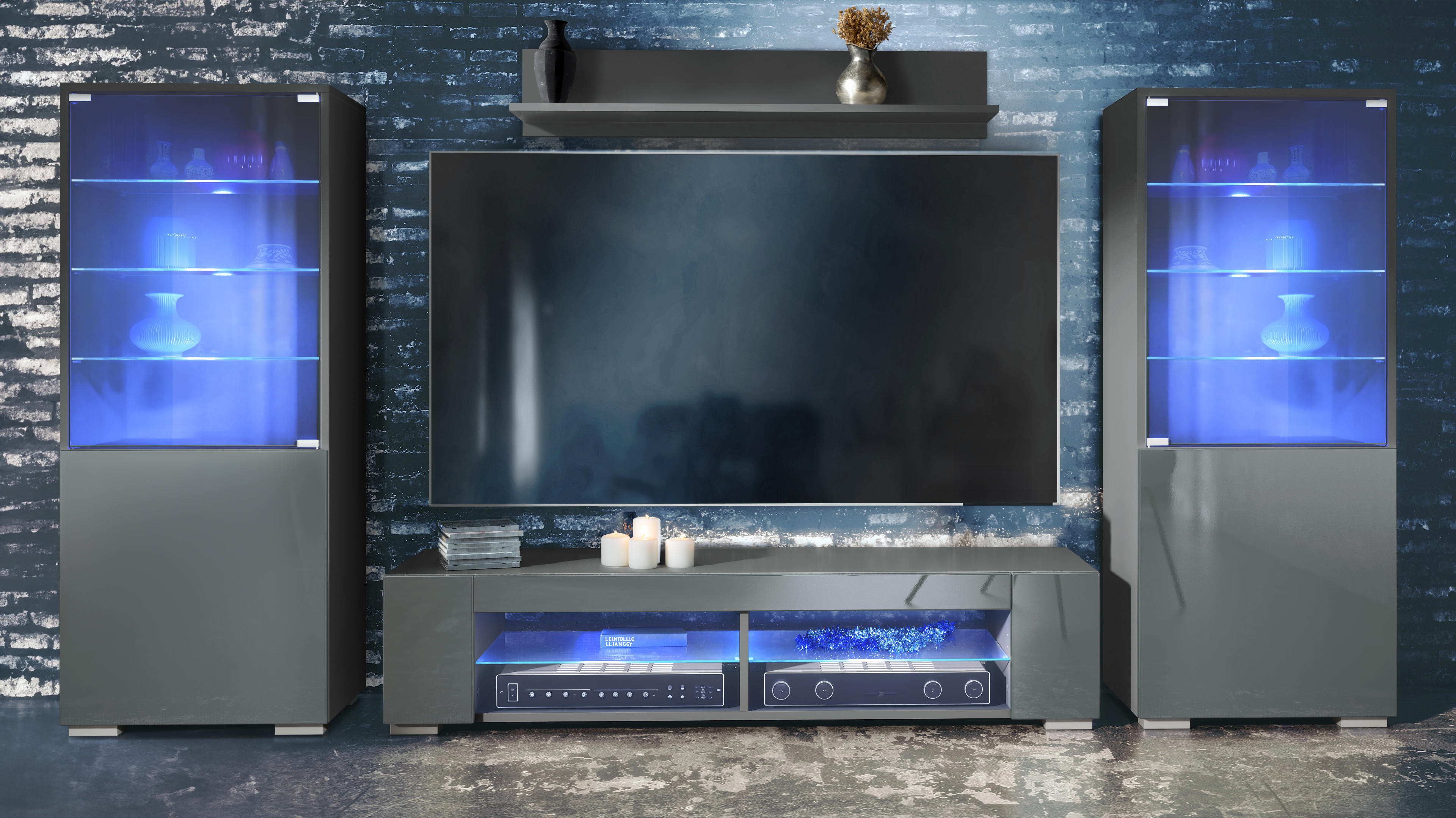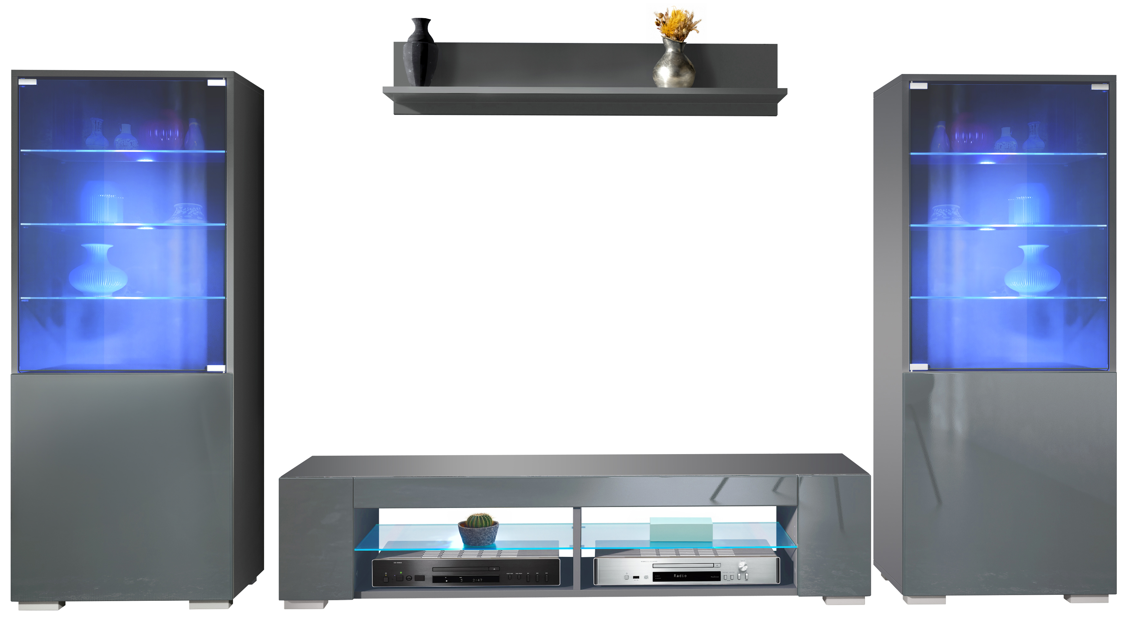 Produktinformationen "Wohnwand 4-tlg. Nevada V2 Anthrazit LED bestehend aus 2 Vitrinen, 1 TV-Board und 1 Wandregal inkl. LED Anthrazit matt/Grau Hochglanz (304,5 x 141 x 39 cm)"