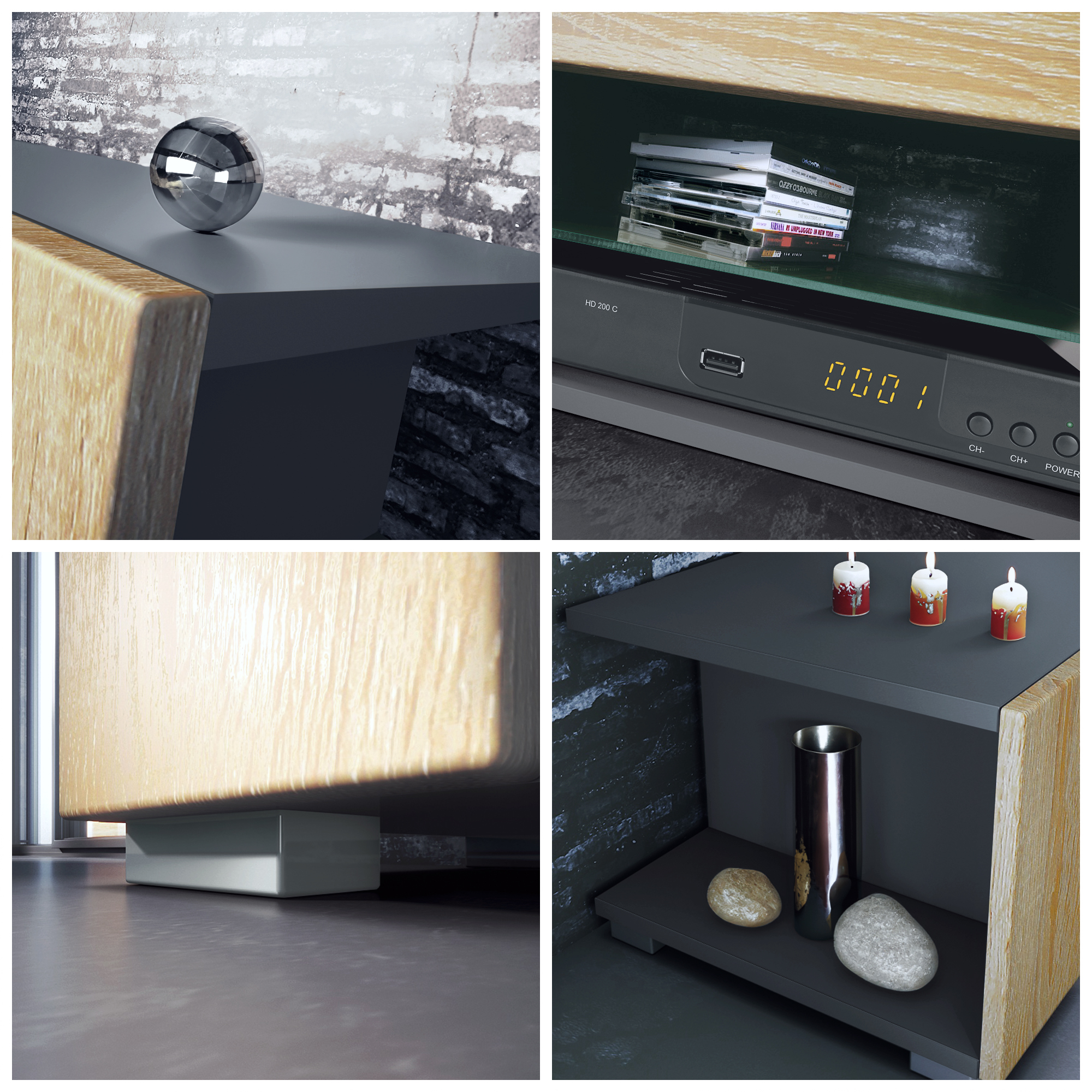 Das TV-Board überzeugt durch modernes Design und Funktionalität. Es bietet eine große Fläche für Fernseher, vier offene Fächer und zwei Glasböden für Unterhaltungselektronik. Das offene Rückwand-Design sorgt für eine ordentliche Kabelverlegung.