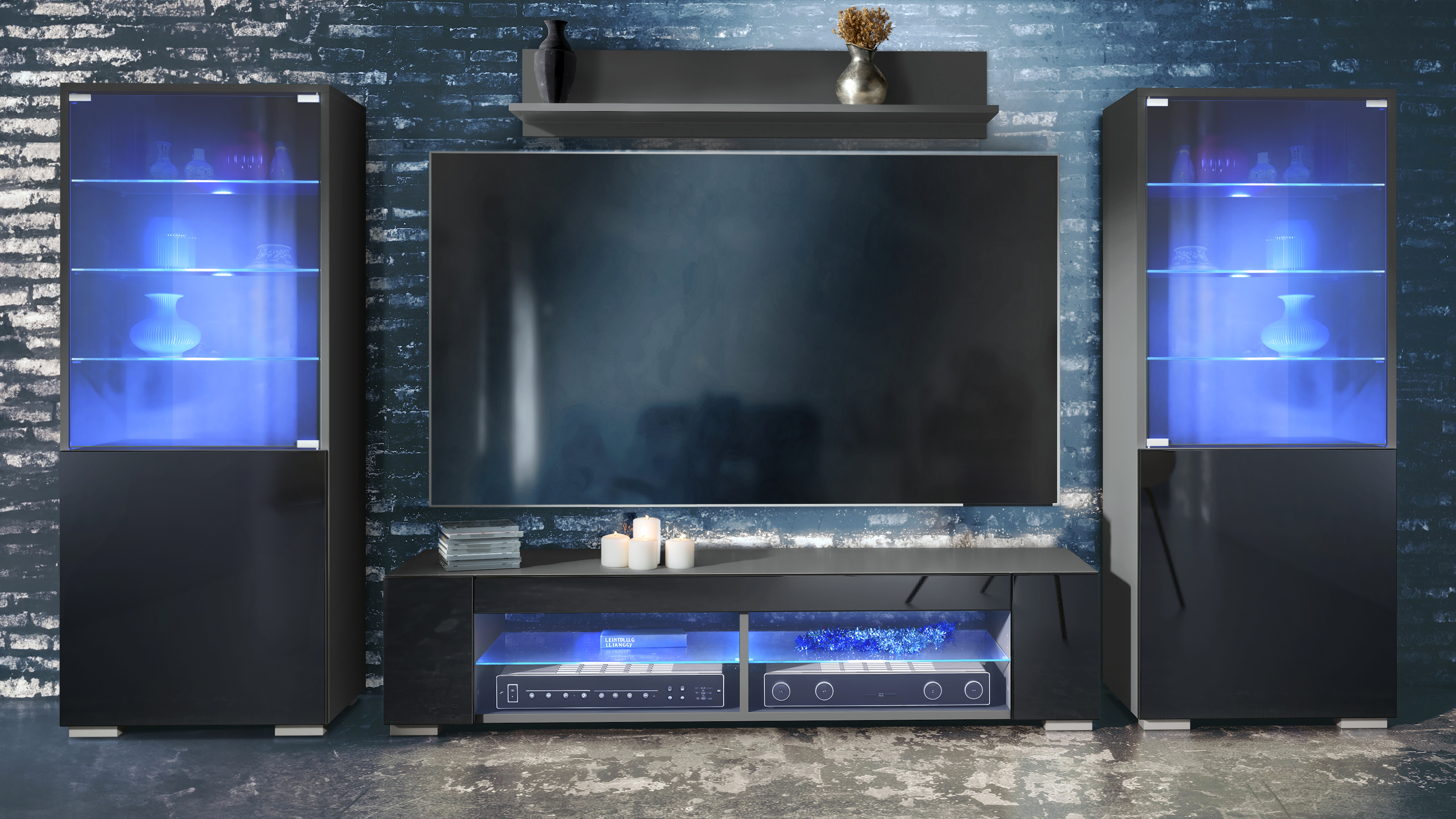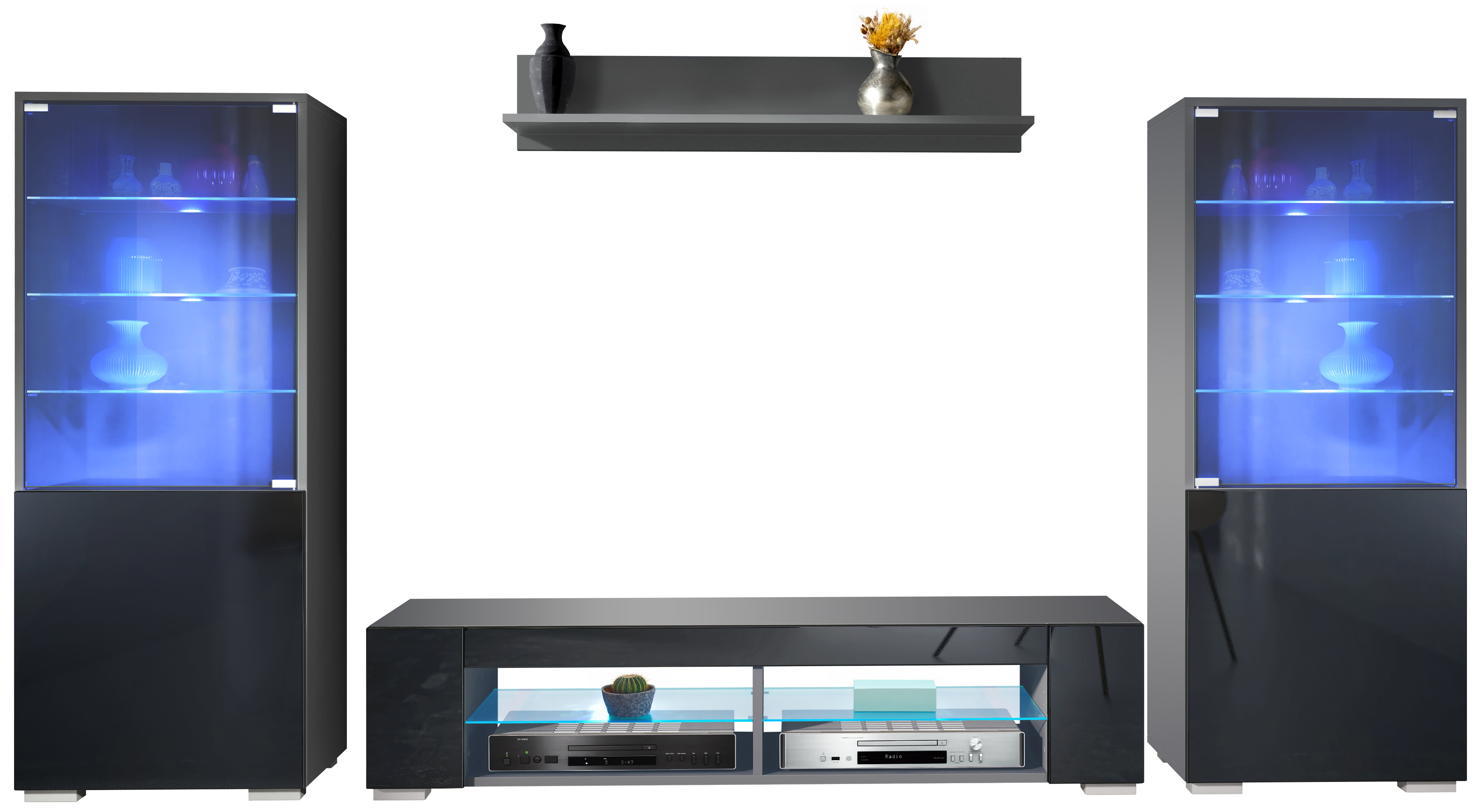 Wohnwand 4-tlg. Nevada V2 Anthrazit LED bestehend aus 2 Vitrinen, 1 TV-Board und 1 Wandregal inkl. LED Anthrazit matt/Schwarz Hochglanz (304,5 x 141 x 39 cm)