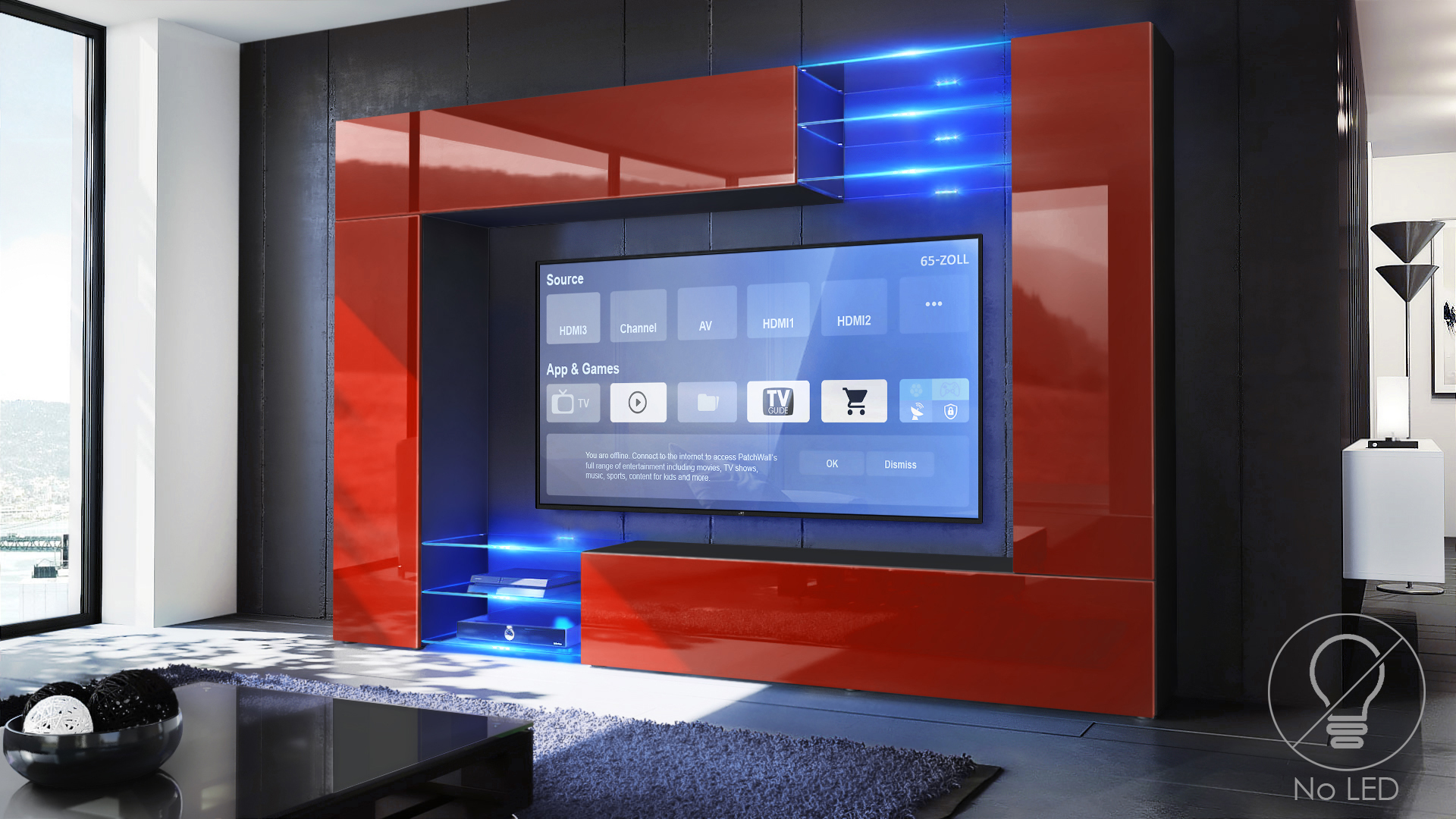 Produktinformationen "Wohnwand Mirage 4-tlg. 2 Klappen und 6 offenen Glasablagen Schwarz matt/Bordeaux Hochglanz (262 x 183 x 39 cm)"