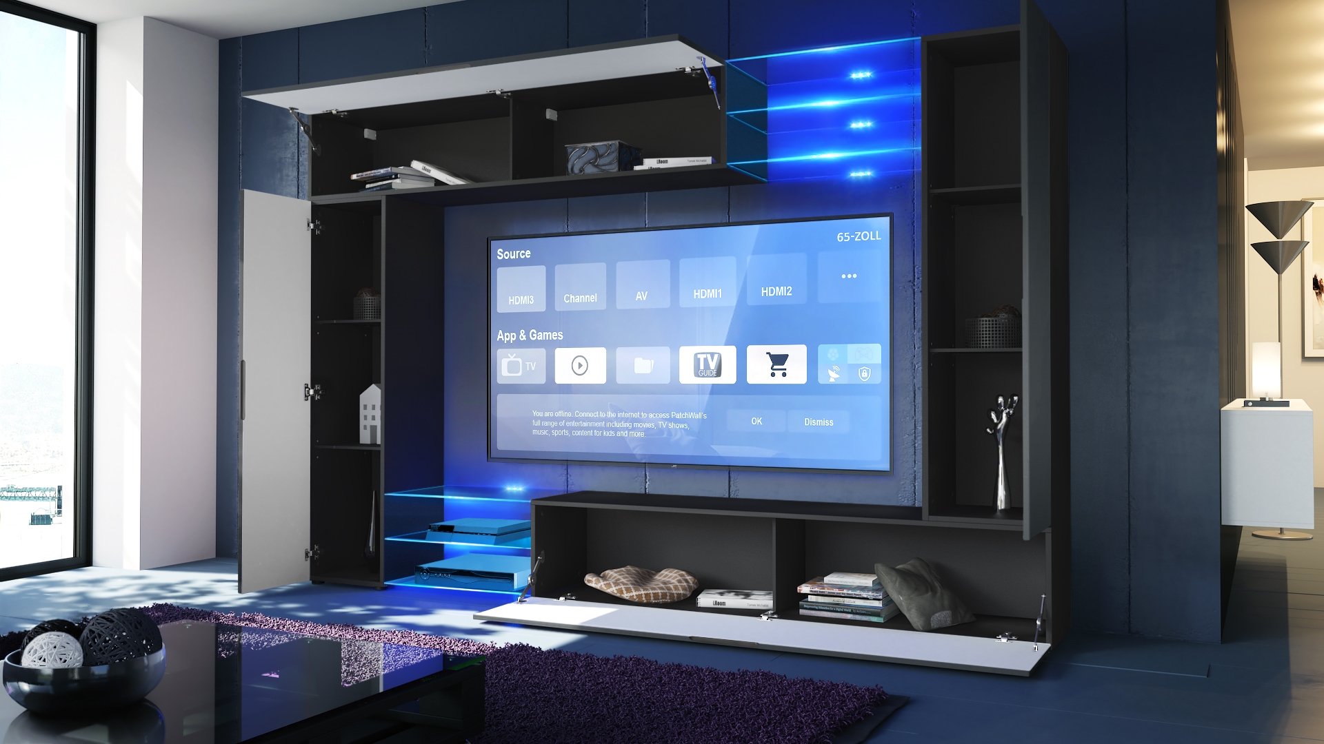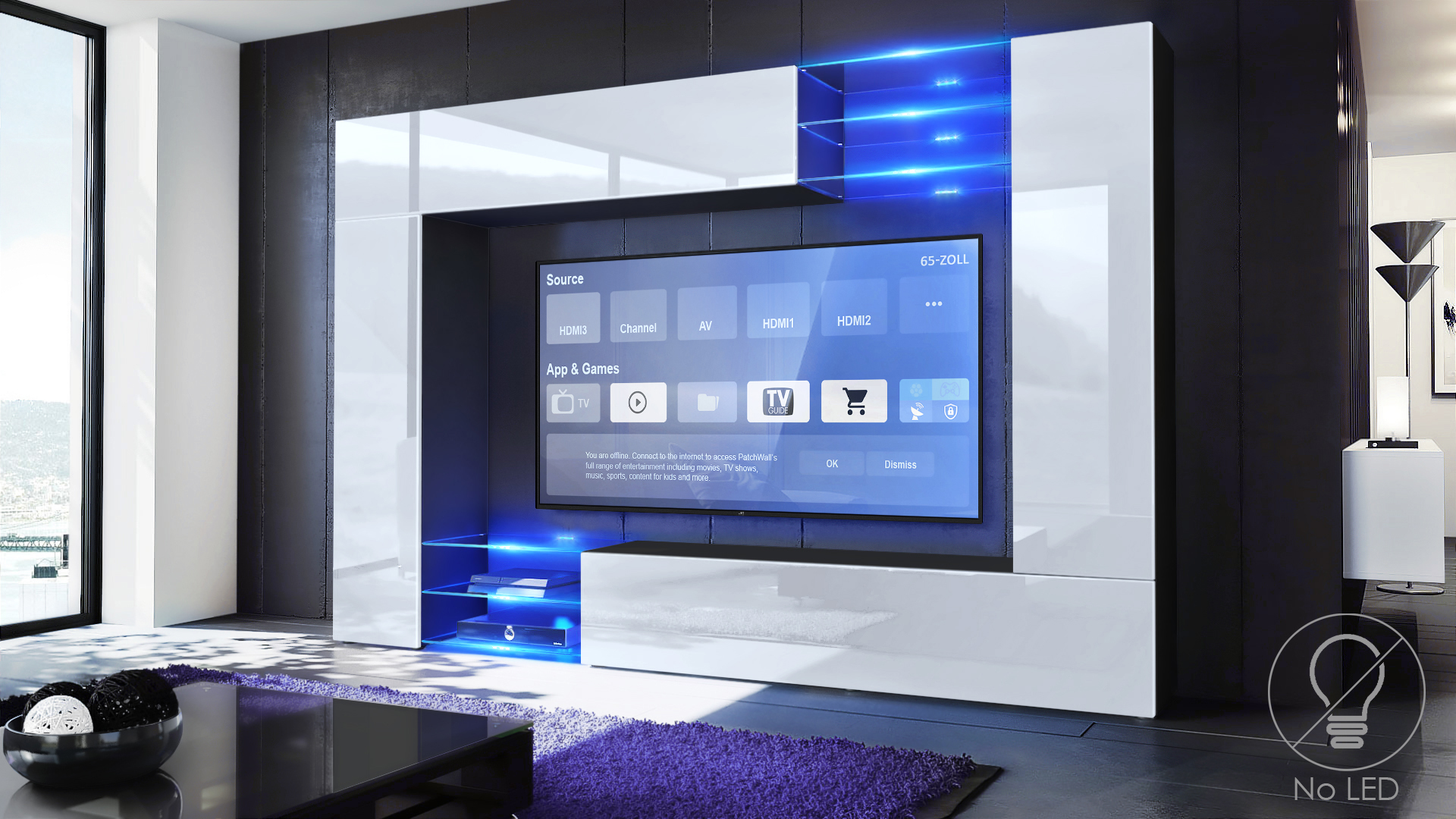 Die moderne Wohnwand Mirage präsentiert sich als praktisches Möbelstück für Ihren Wohnbereich, hergestellt in Deutschland. Die Wohnwand fürs Wohnzimmer ist mit zwei Türen, zwei Klappen und sechs Glaseinlegeböden ausgerüstet. Hinter den Türen befinden sich je drei Fächer mit Einlegeböden und hinter den Klappen je zwei Fächer. Die Klappen und Türen lassen sich ganz bequem durch praktische Überstände öffnen und bieten ausreichend Platz für allerlei Gegenstände. Der große Oberboden der TV-Wand bietet auch für größere Fernseher ausreichend Platz. Eine Rückwand in Holzoptik aus Hartfaserplatten, sowie eine Wandhalterung sind im Lieferumfang enthalten und sorgen für zusätzliche Stabilität. Die Glasregale des TV-Unterschranks können optional mit einer LED-Beleuchtung versehen werden.