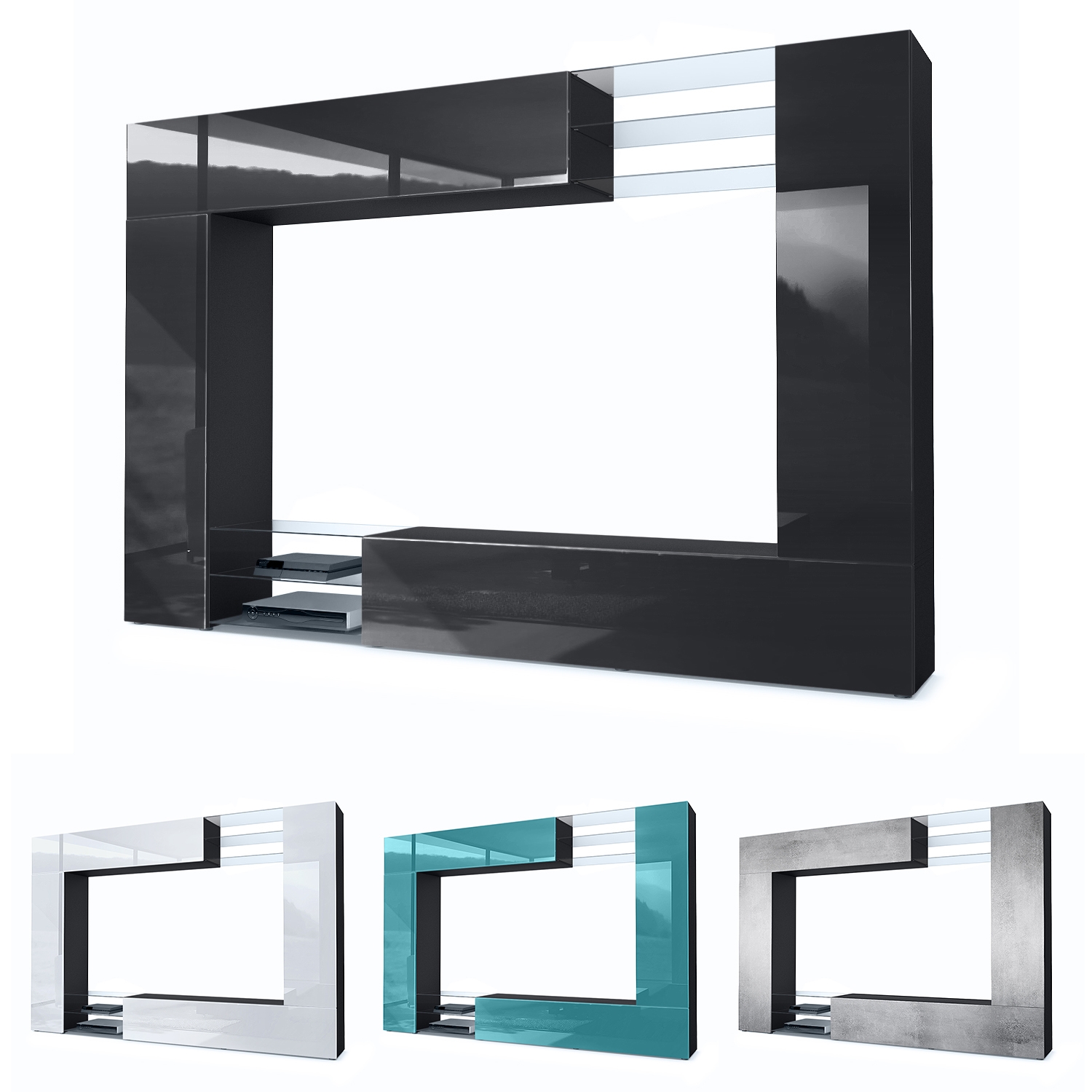 Produktinformationen "Wohnwand Mirage 4-tlg. 2 Klappen und 6 offenen Glasablagen Schwarz matt/Weiß Hochglanz (262 x 183 x 39 cm)"