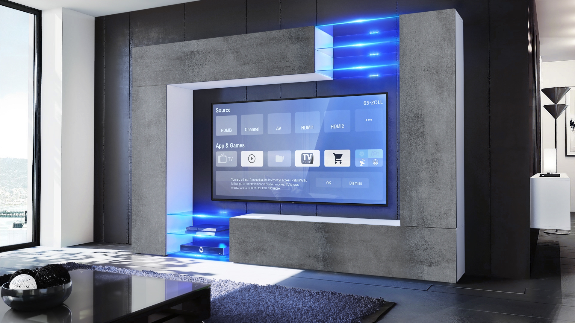 Die moderne Wohnwand Mirage präsentiert sich als praktisches Möbelstück für Ihren Wohnbereich, hergestellt in Deutschland. Die Wohnwand fürs Wohnzimmer ist mit zwei Türen, zwei Klappen und sechs Glaseinlegeböden ausgerüstet. Hinter den Türen befinden sich je drei Fächer mit Einlegeböden und hinter den Klappen je zwei Fächer. Die Klappen und Türen lassen sich ganz bequem durch praktische Überstände öffnen und bieten ausreichend Platz für allerlei Gegenstände. Der große Oberboden der TV-Wand bietet auch für größere Fernseher ausreichend Platz. Eine Rückwand in Holzoptik aus Hartfaserplatten, sowie eine Wandhalterung sind im Lieferumfang enthalten und sorgen für zusätzliche Stabilität. Die Glasregale des TV-Unterschranks können optional mit einer LED-Beleuchtung versehen werden.