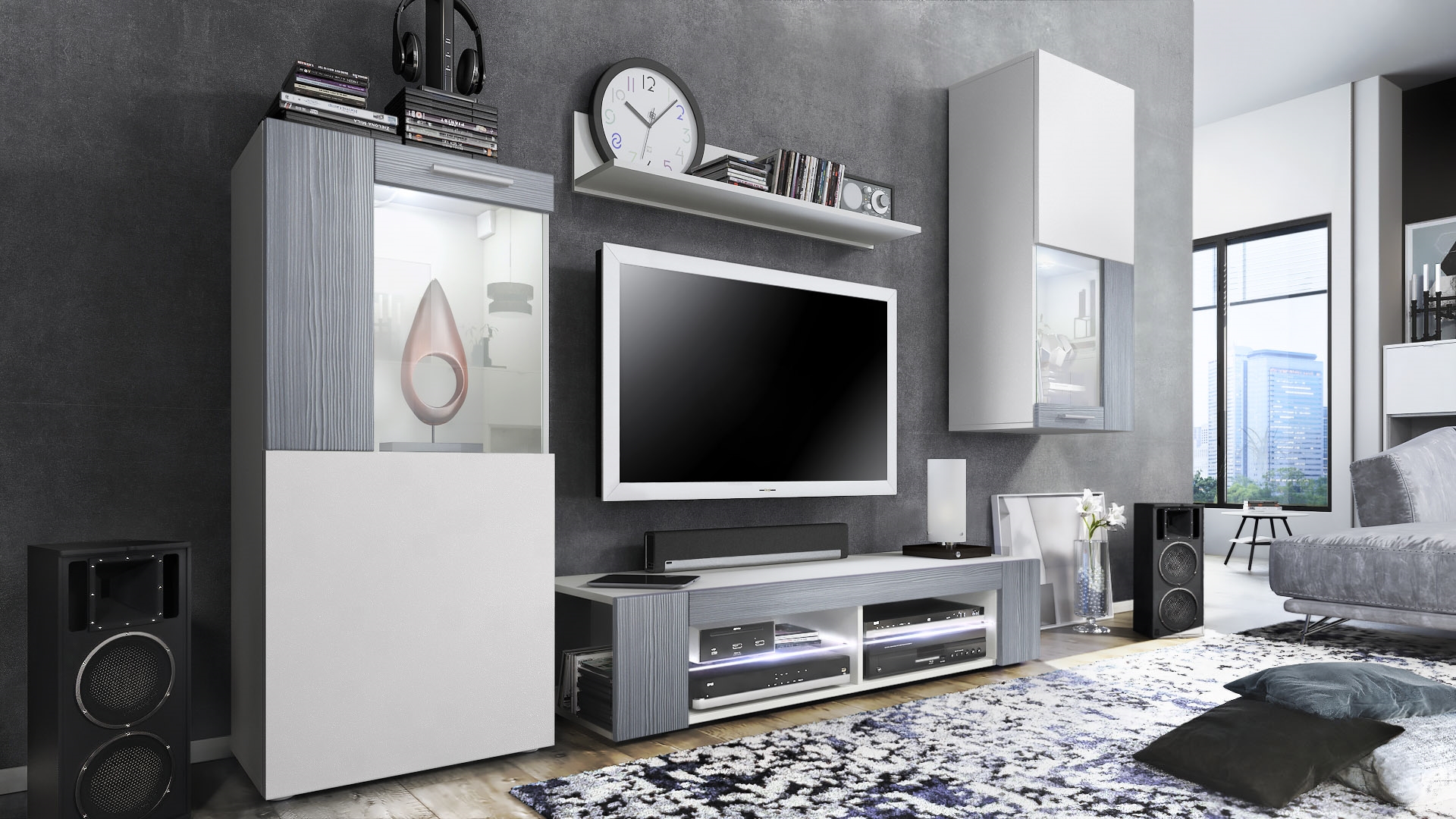 Die moderne Wohnwand Movie besteht aus einem TV-Board, zwei Vitrinen und einem praktischen Wandregal, hergestellt in Deutschland. Alle vier Möbelstücke lassen sich individuell zusammenstellen und bieten grenzenlose Gestaltungsmöglichkeiten für Ihr Wohnzimmer, egal ob hängend, stehend oder verteilt im Raum. Das Lowboard ist mit zwei offenen Fächern, zwei Glasböden und zwei seitlich versteckten Fächern ausgerüstet. Die Glasvitrinen bieten durch zwei Fächer und einen zusätzlichen Boden extra Stauraum. Beide Vitrinen lassen sich sowohl hängend, als auch stehend platzieren. Zusätzlich enthalten ist ein Wandregal. Die Glasböden des TV-Unterschranks und der Vitrinen können optional mit einer LED-Beleuchtung versehen werden. Damit alles problemlos angeschlossen werden kann, wurde bei dem TV-Fernsehboard auf eine Rückwand verzichtet. Die Vitrinen enthalten eine Rückwand in Holzoptik aus Hartfaserplatten.