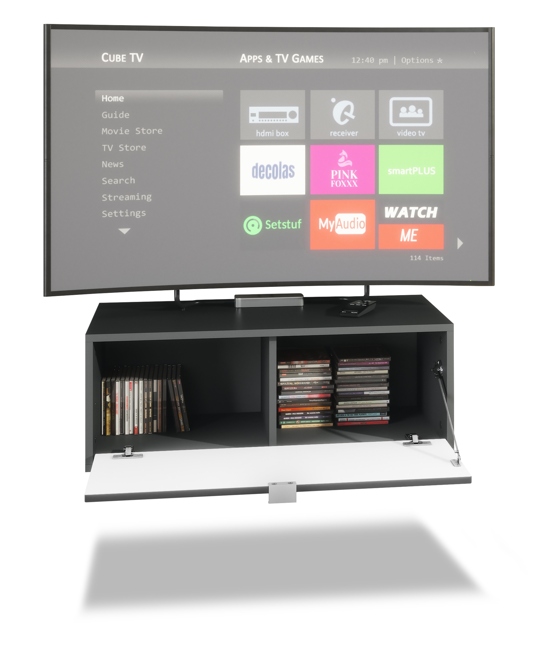 Auf dem Möbelstück selbst kann man nach Belieben verschiedene Sachen platzieren: Nutzt man das Hängeelement z.B. als TV Board, so bietet sich die Oberfläche für Receiver, Spielkonsolen und DVDs an. Ansonsten bringt es durch sein subtiles Design auch Deko-Elemente wie Vasen, Windlichter oder Skulpturen hervorragend zur Geltung.