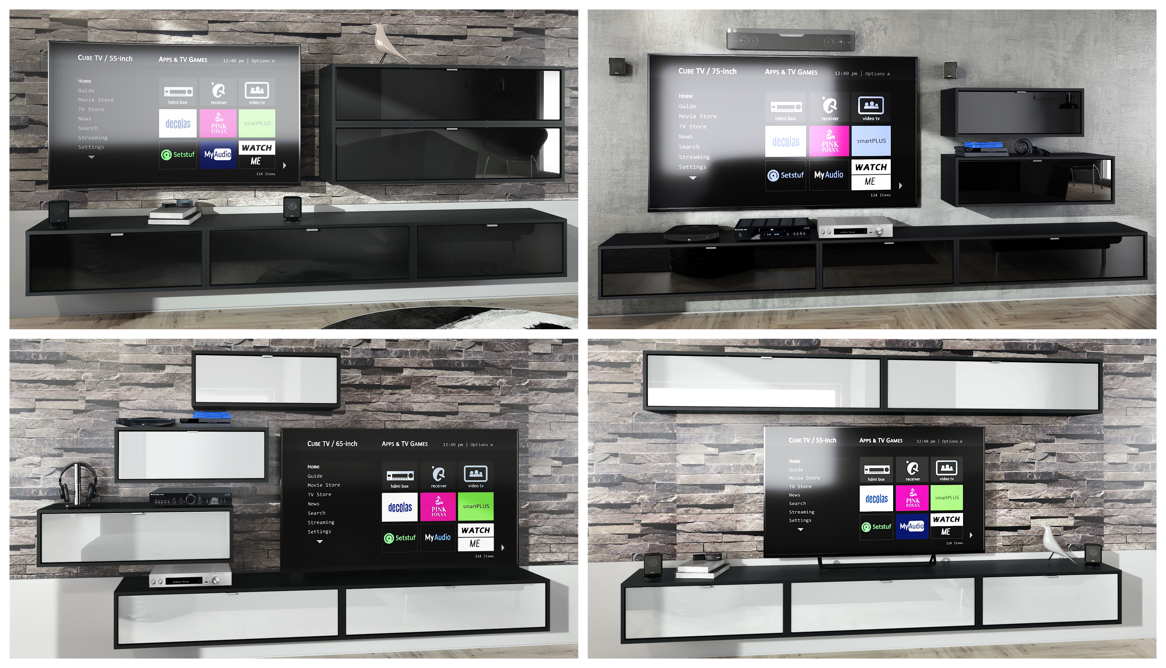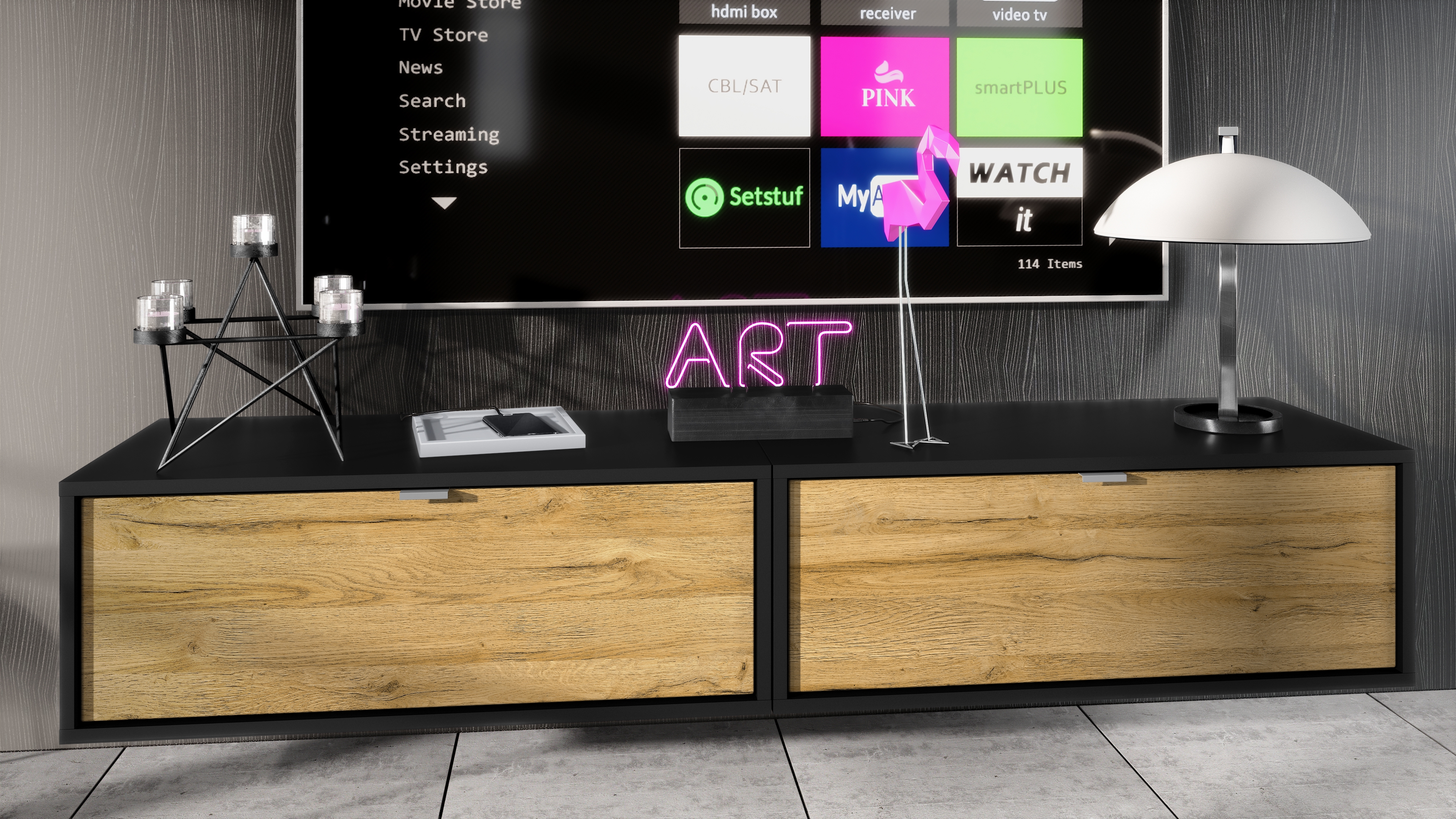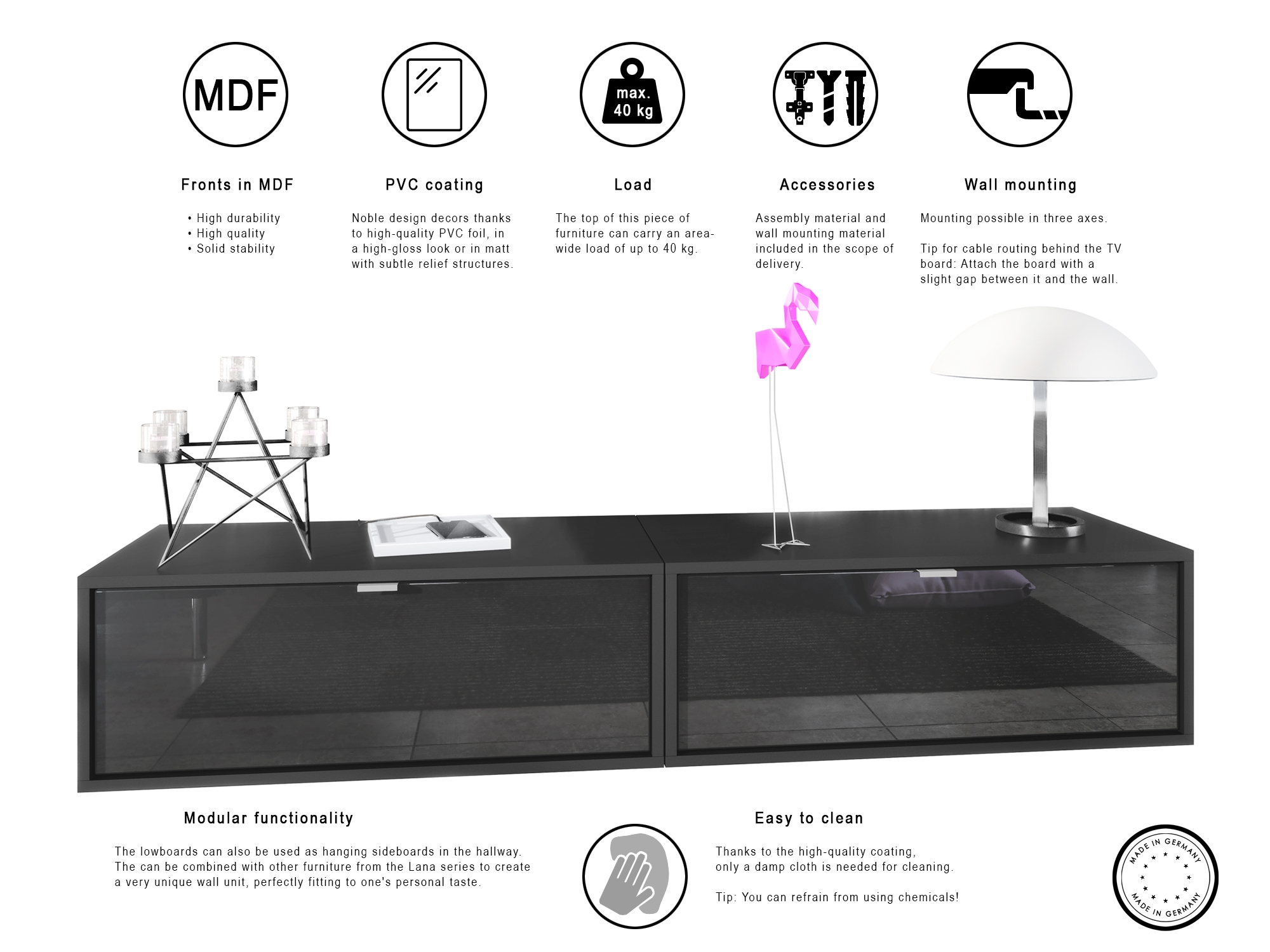 Der Korpus des TV Boards hat die Farbe Schwarz matt. Um dem Möbelstück einen futuristischen Stil zu verleihen, wird es hängend an der Wand befestigt. So kann man es nahezu überall im Haus anbringen. Dies ist gerade dann praktisch, wenn auf dem Boden nicht genügend Platz für stehende Möbel verfügbar ist.