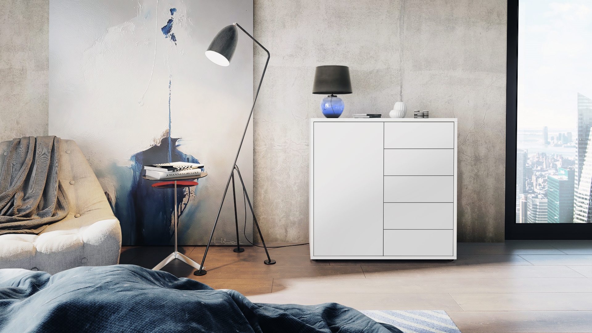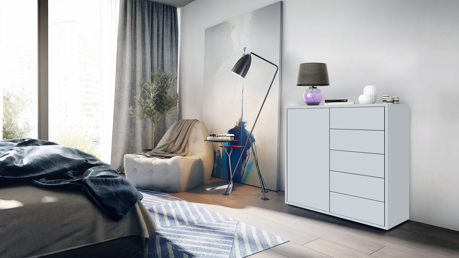 Durch das schlichte, moderne Design lässt sich die Kommode mit vielen verschiedenen Einrichtungsstilen kombinieren und sowohl als Wohnzimmerschrank, Kommode im Schlafzimmer oder als TV-Sideboard einsetzen. Für eine besondere Eleganz sorgen die Fronten der Türen- und Schubladenkommode, erhältlich in vielen verschiedenen Farbvarianten, die Ihnen eine Vielzahl an Kombinationsmöglichkeiten bieten. Durch die Oberflächenbeschichtung erhalten Sie ein besonders pflegeleichtes Produkt. Für die Reinigung können Sie auf Chemie verzichten - es reicht ein leicht angefeuchtetes Tuch, um die wasserfeste Oberfläche angemessen zu reinigen.