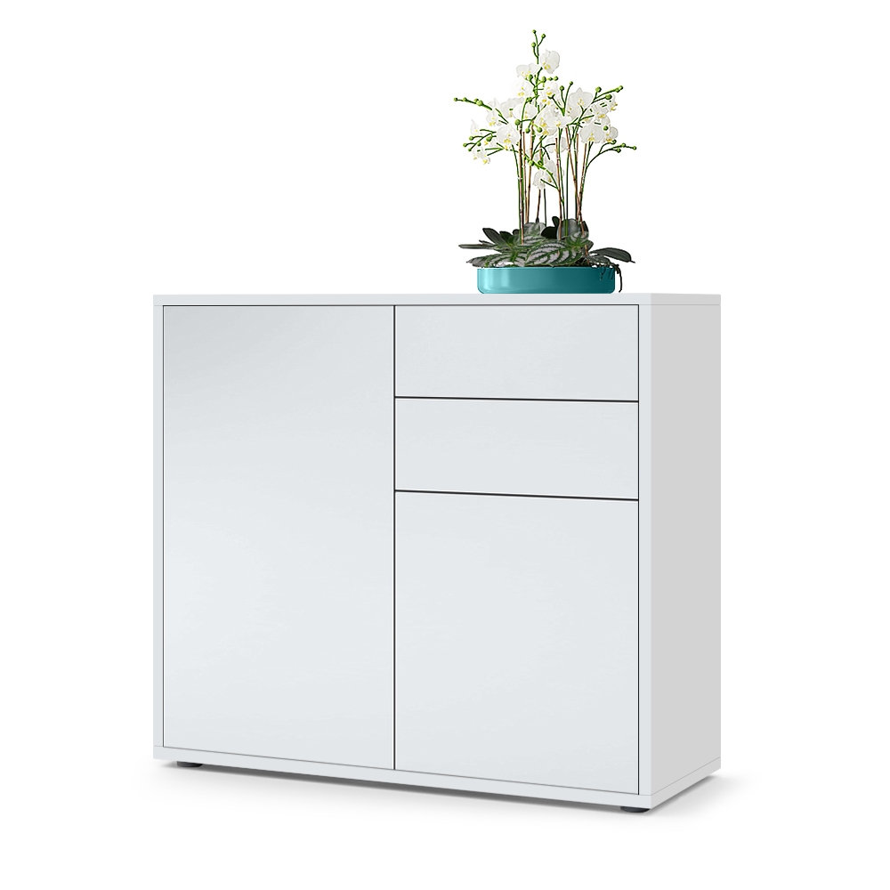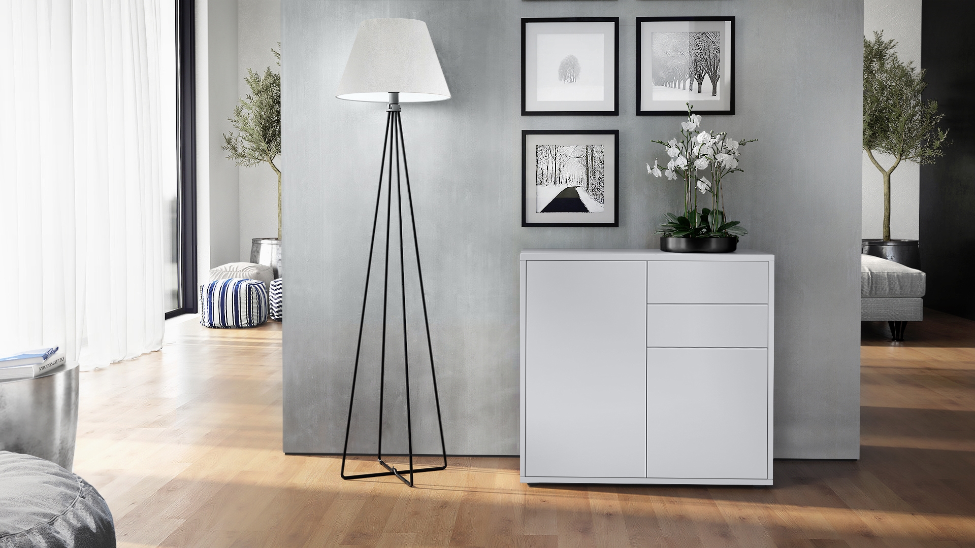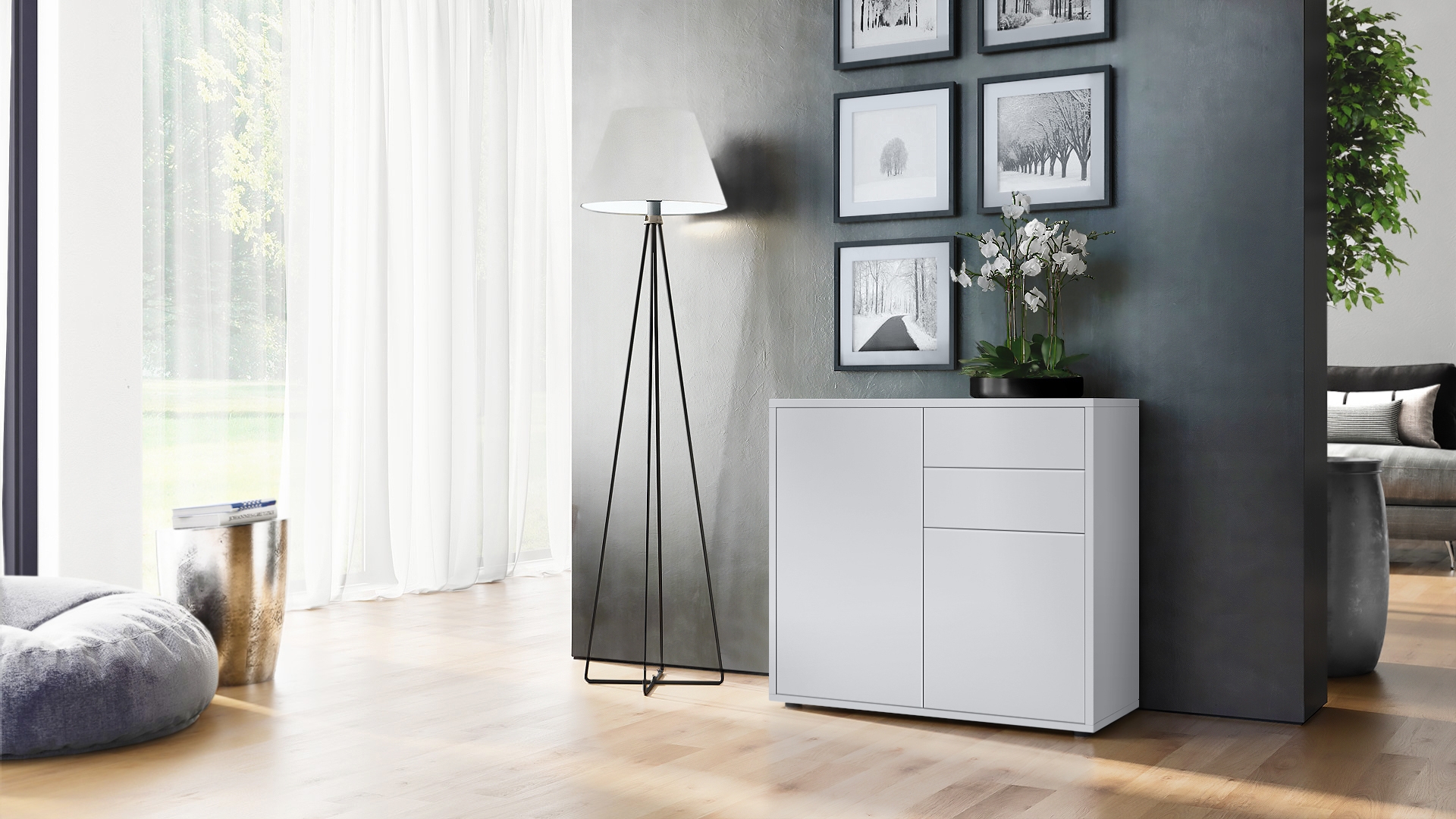 Durch das schlichte, moderne Design lässt sich die Kommode mit vielen verschiedenen Einrichtungsstilen kombinieren und sowohl als Wohnzimmerschrank, Kommode im Schlafzimmer oder als TV-Sideboard einsetzen. Für eine besondere Eleganz sorgen die Fronten der Türen- und Schubladenkommode, erhältlich in vielen verschiedenen Farbvarianten, die Ihnen eine Vielzahl an Kombinationsmöglichkeiten bieten. Durch die Oberflächenbeschichtung erhalten Sie ein besonders pflegeleichtes Produkt. Für die Reinigung können Sie auf Chemie verzichten - es reicht ein leicht angefeuchtetes Tuch, um die wasserfeste Oberfläche angemessen zu reinigen.