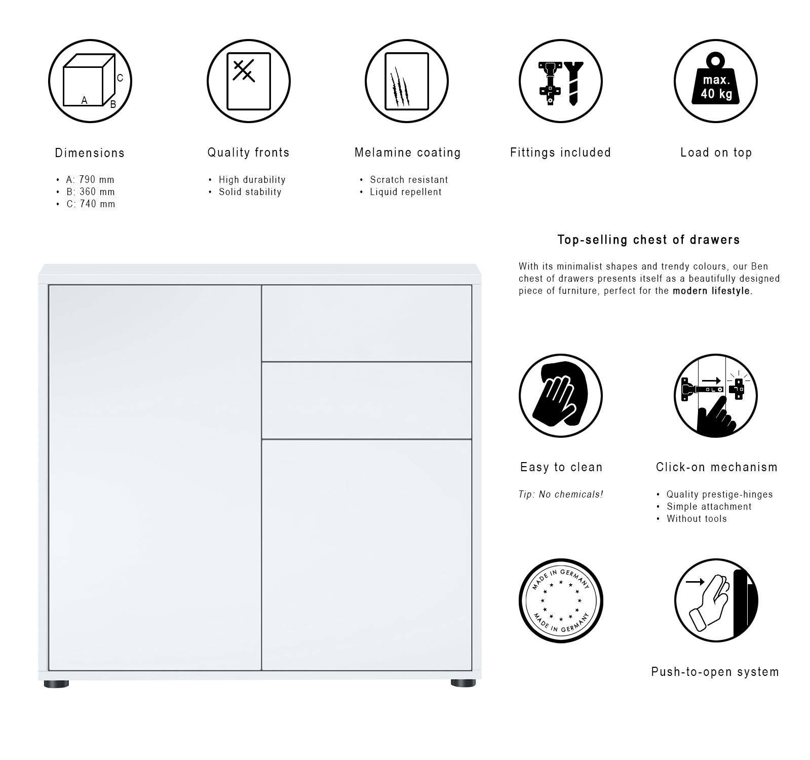 Ob als modernes Sideboard im Wohnzimmer, Kommodenschrank für's Schlafzimmer, Anrichte im Flur oder als Kommode im Kinderzimmer – die geräumige Kommode Ben präsentiert sich als praktisches Möbelstück mit modernem Design, hergestellt in Deutschland. Der Beistellschrank ist mit einer großen Tür, einer kleinen Tür und zwei leichtgängigen Schubladen ausgerüstet. Die Schubkästen verlaufen dank Laufschienen aus Metall nahezu geräuschlos und sorgen für eine leichte Handhabung. Hinter den Türen befinden sich jeweils zwei geräumige Fächer mit Einlegeboden. Die Türen und Schubladen sind mit unserem Push-to-Open-System ausgestattet. Eine Rückwand in Holzoptik aus Hartfaserplatten ist im Lieferumfang enthalten.