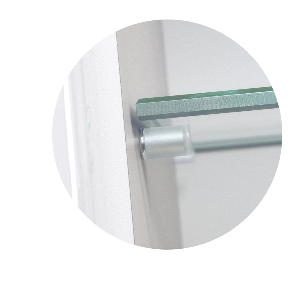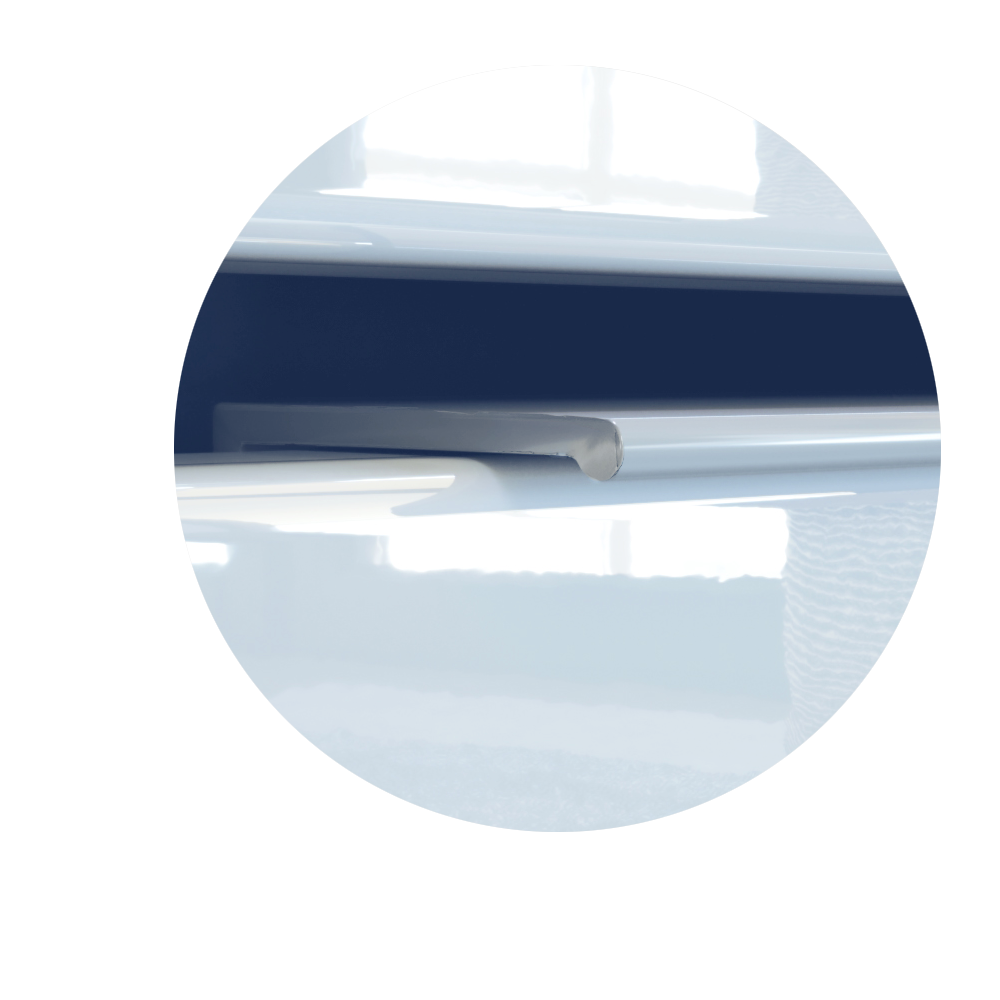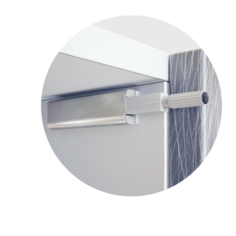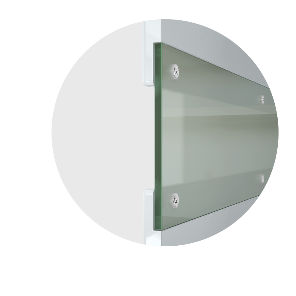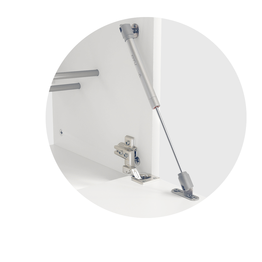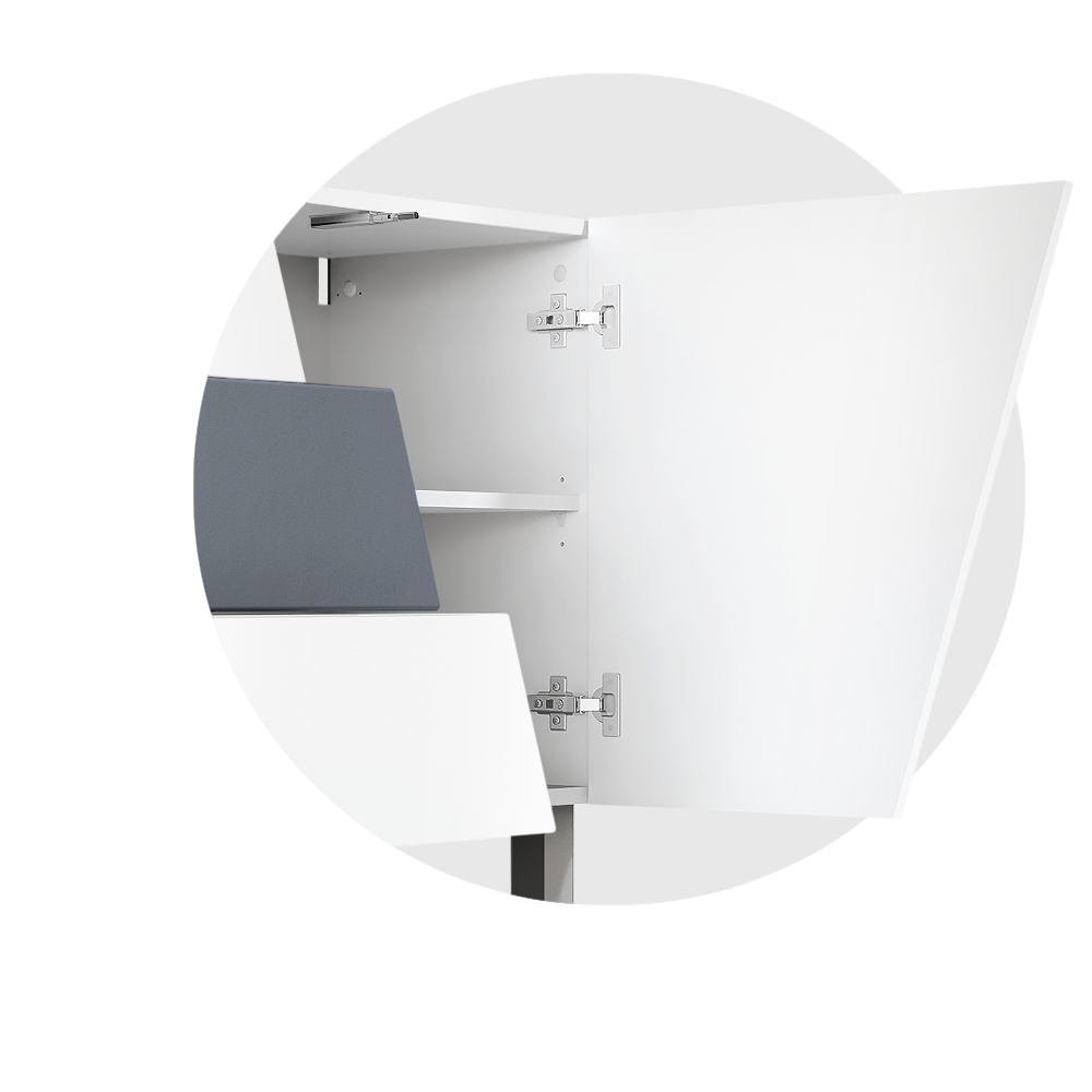 Das intelligente Push-to-Open-System ermöglicht müheloses Bedienen ohne Griffe. Hinter den Türen finden Sie großzügige Fächer mit individuell verstellbaren Einlegeböden, die für eine optimale Organisation Ihrer Gegenstände sorgen.