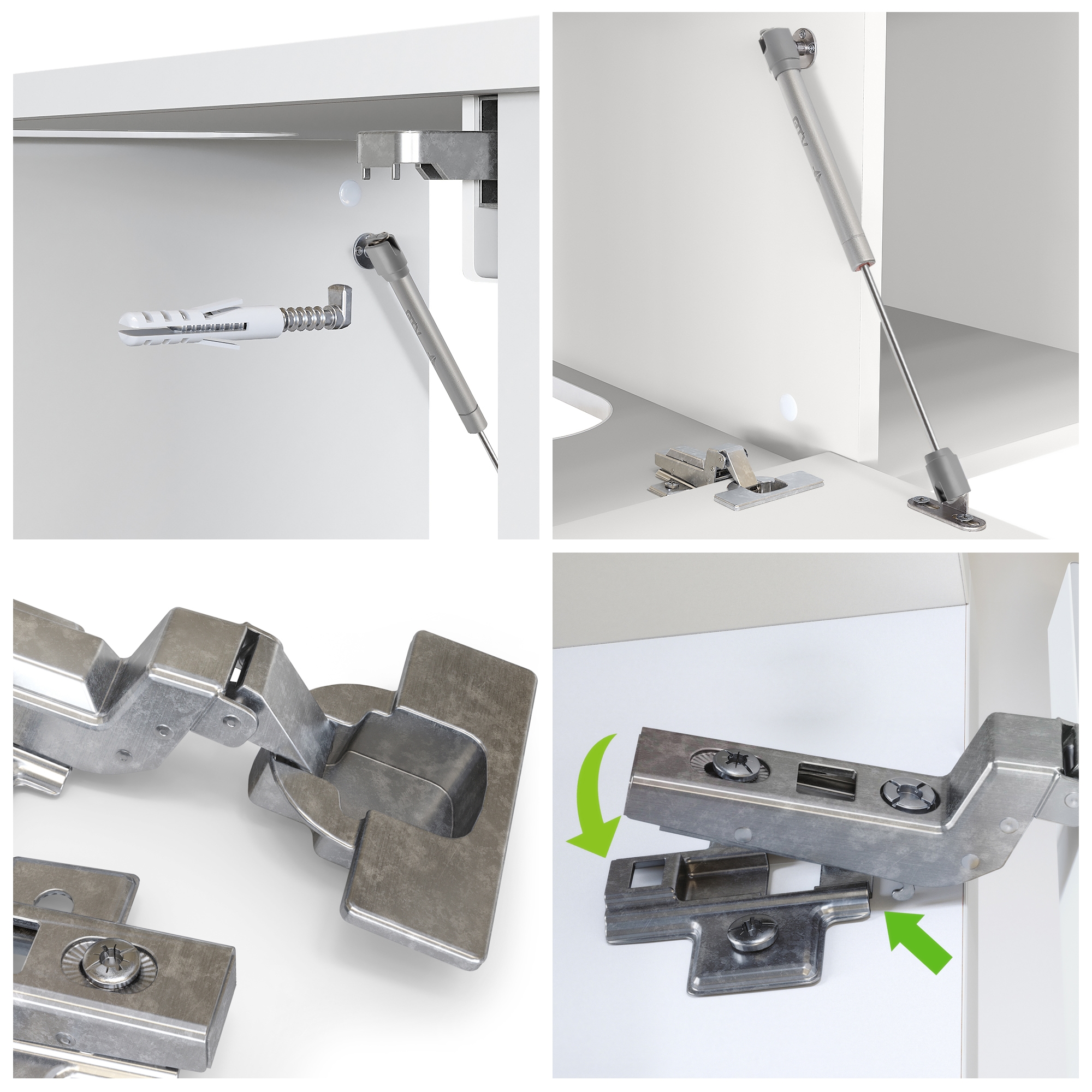Die moderne grifflose Klappe und die Tür sind einschlagend ca. 1cm zurückgesetzt und mit einem Push-to-Open-System ausgestattet. Das Montagezubehör ist aus Metall und sorgt für eine stabile Montage. Eine einfache bebilderte Aufbauanleitung bietet reichlich Unterstützung bei der Selbstmontage.