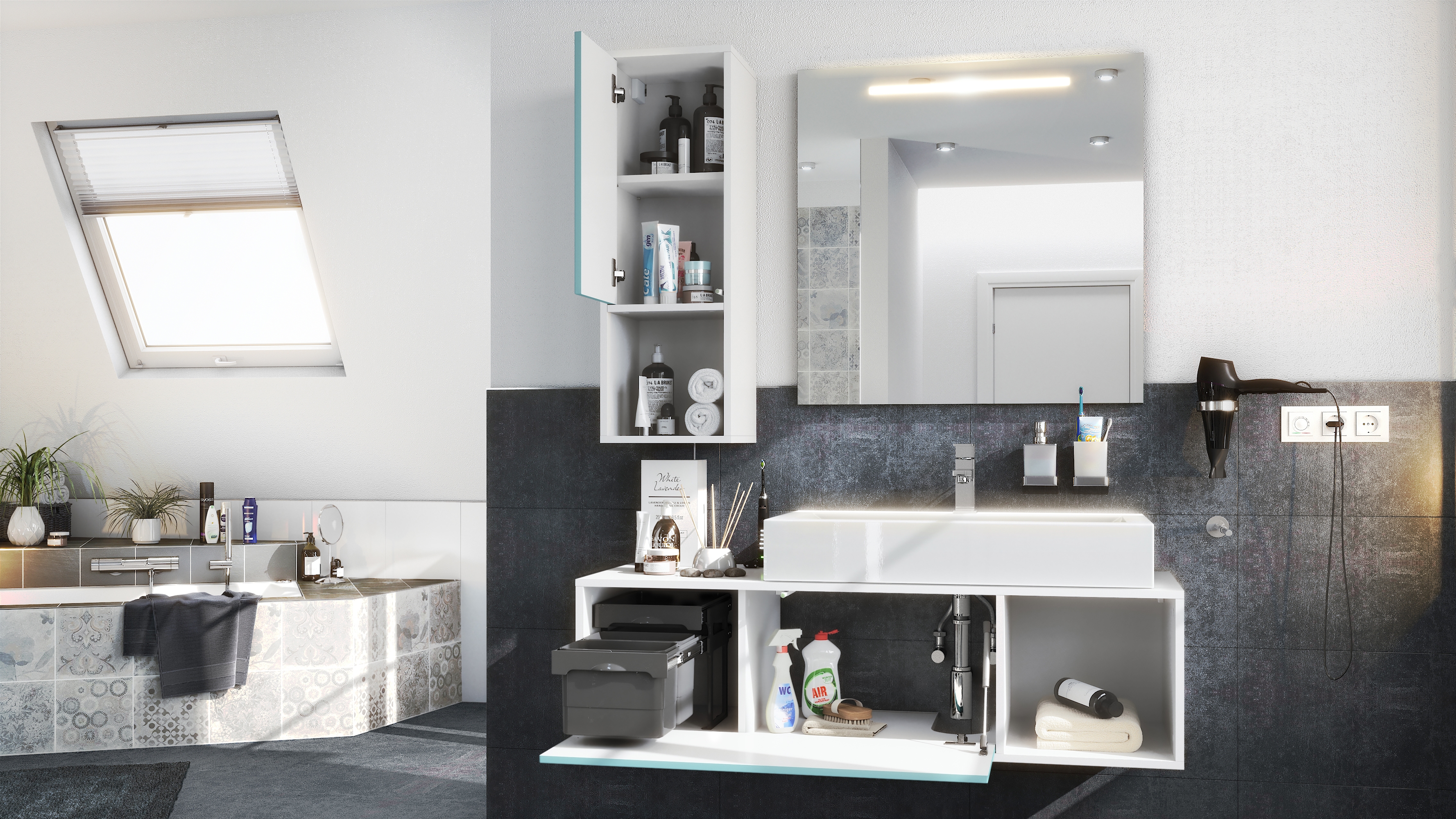 Stellmaße der Badmöbel wie abgebildet in cm (BxHxT): 126,5 x 195 x 46