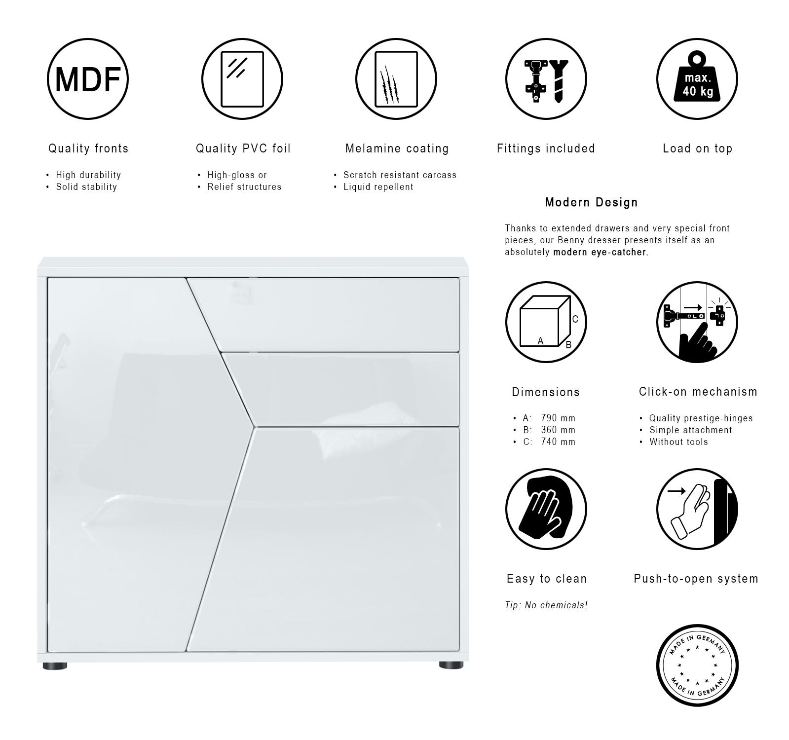 Ob als modernes Sideboard im Wohnzimmer, Kommodenschrank für's Schlafzimmer oder als Anrichte im Flur - die geräumige Kommode Benny präsentiert sich als praktisches Möbelstück mit modernem Design, hergestellt in Deutschland. Der Beistellschrank ist mit einer großen Tür, einer kleinen Tür und zwei leichtgängigen Schubladen ausgerüstet. Die Schubkästen verlaufen dank Laufschienen aus Metall nahezu geräuschlos und sorgen für eine leichte Handhabung. Hinter den Türen befinden sich jeweils zwei geräumige Fächer mit Einlegeboden. Die Türen und Schubladen sind mit unserem Push-to-Open-System ausgestattet. Eine Rückwand in Holzoptik aus Hartfaserplatten ist im Lieferumfang enthalten.