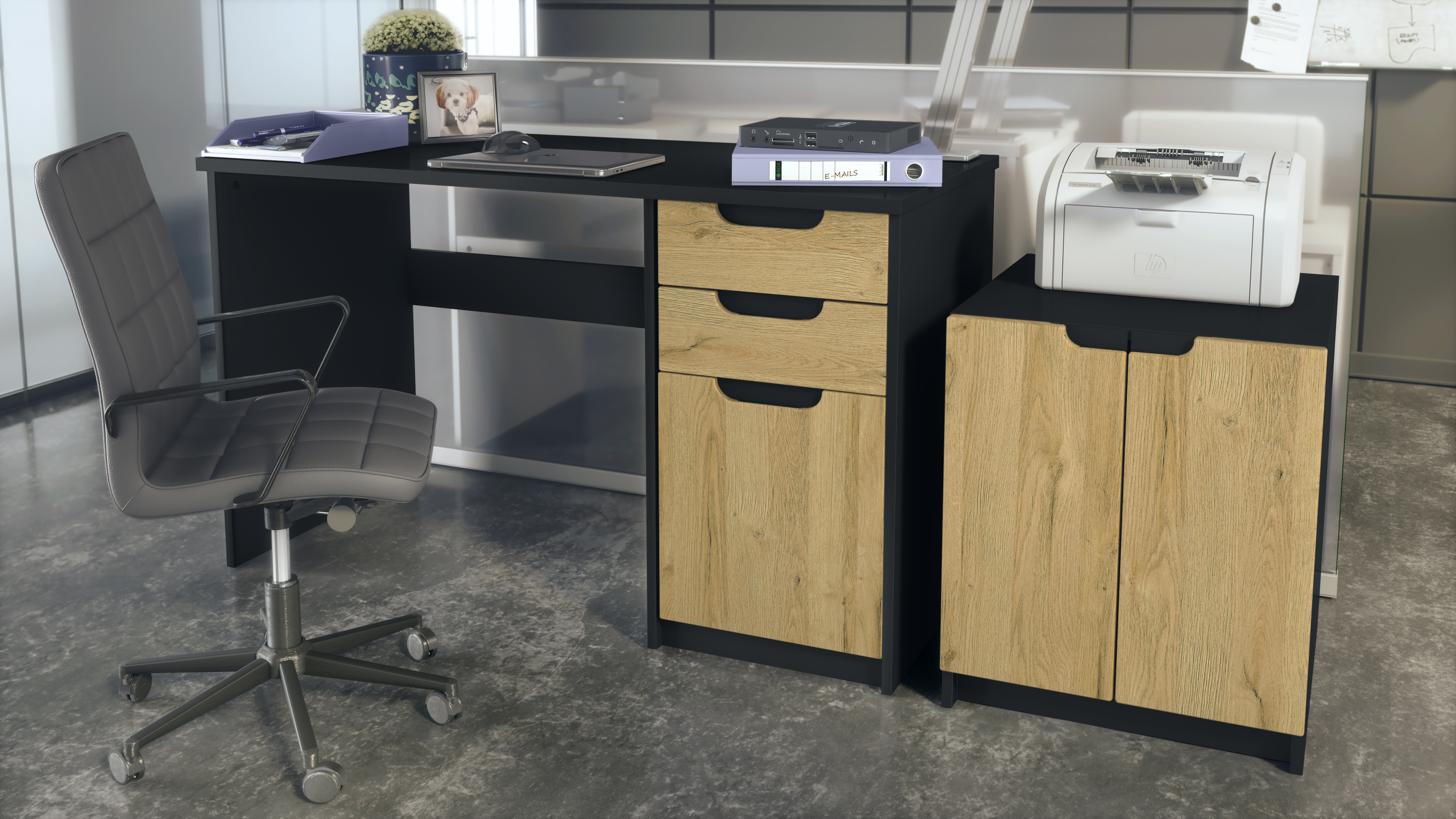 Produktinformationen "Büromöbel-Set Paris Schwarz mit 1 Schreibtisch und 1 Druckerkommode Schwarz matt / Eiche Natur"