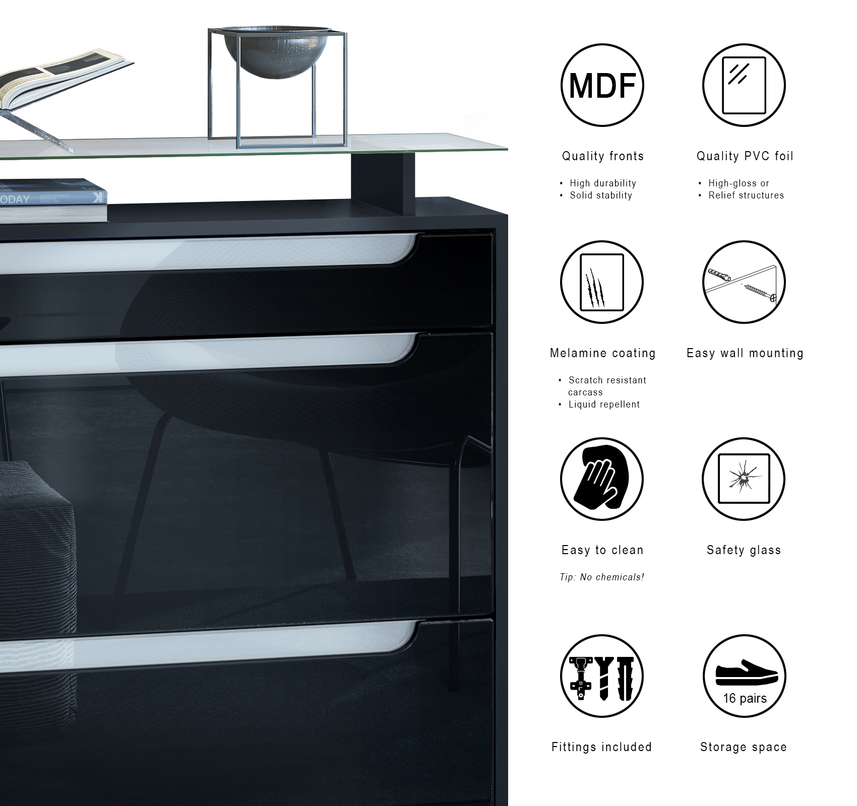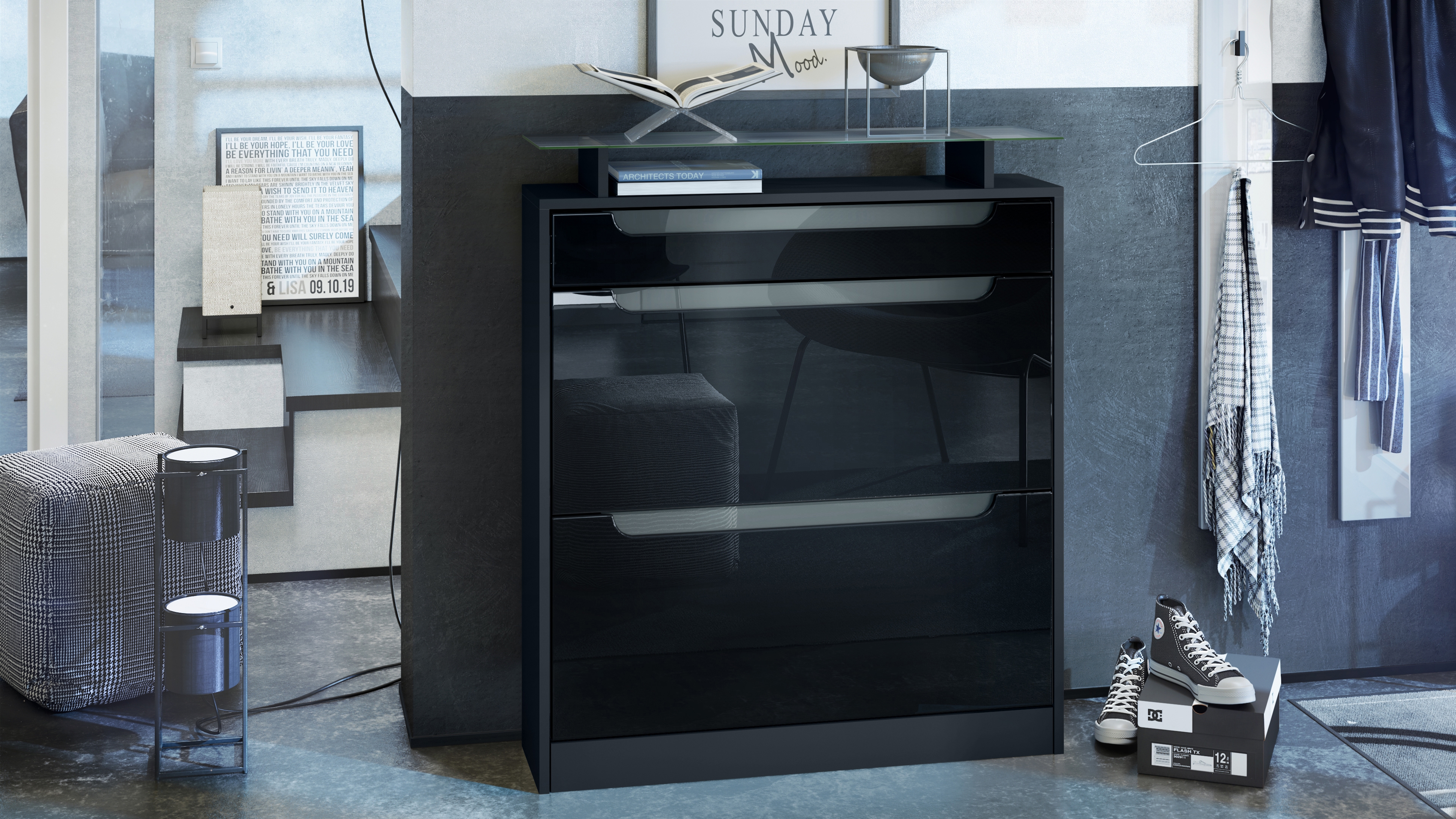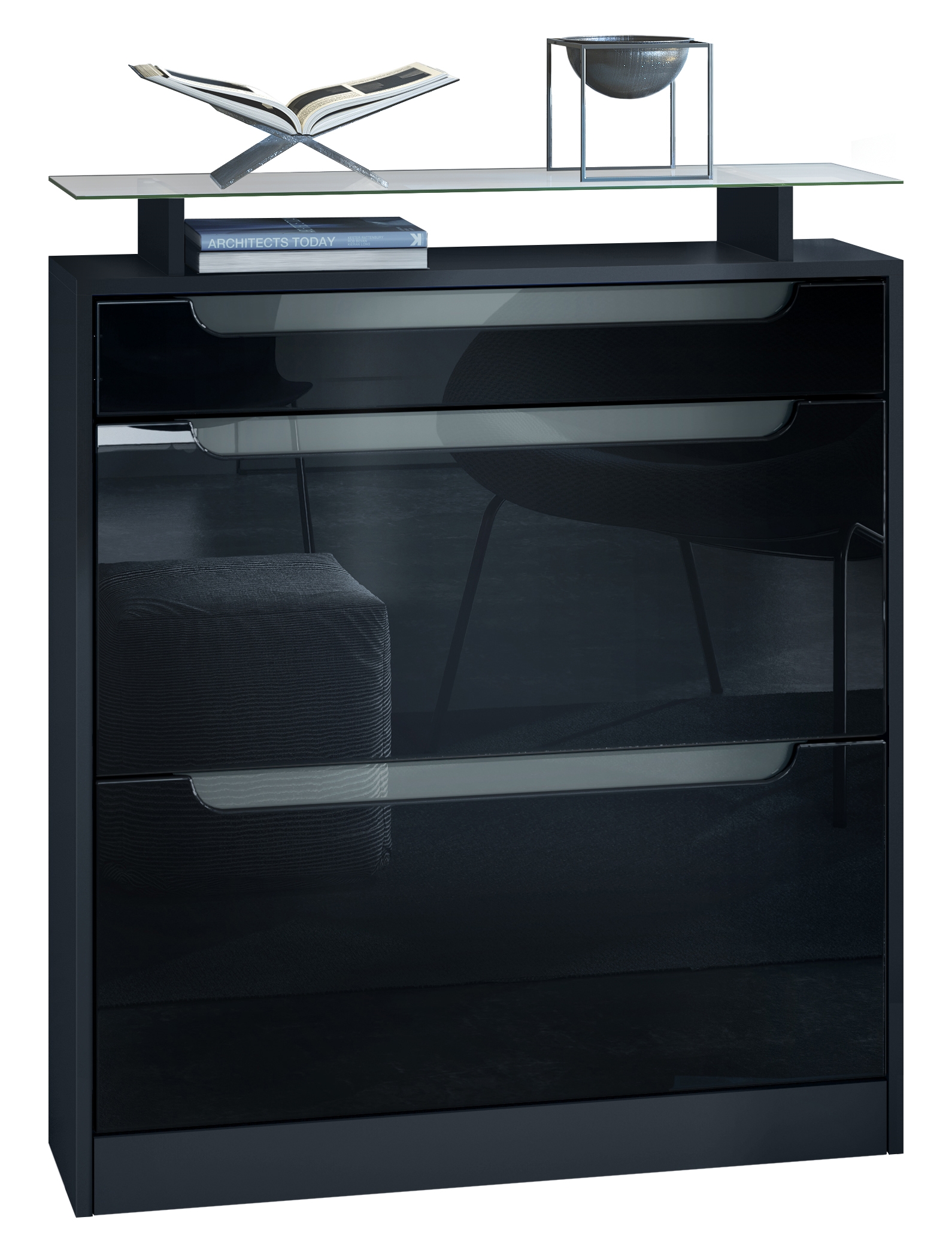 Produktinformationen "Fiesta Schuhschrank mit 2 Klappen, 1 Schublade und Glasablage Schwarz matt/Schwarz glänzend, Mulden in Grau glänzend (89x104x23 cm)"