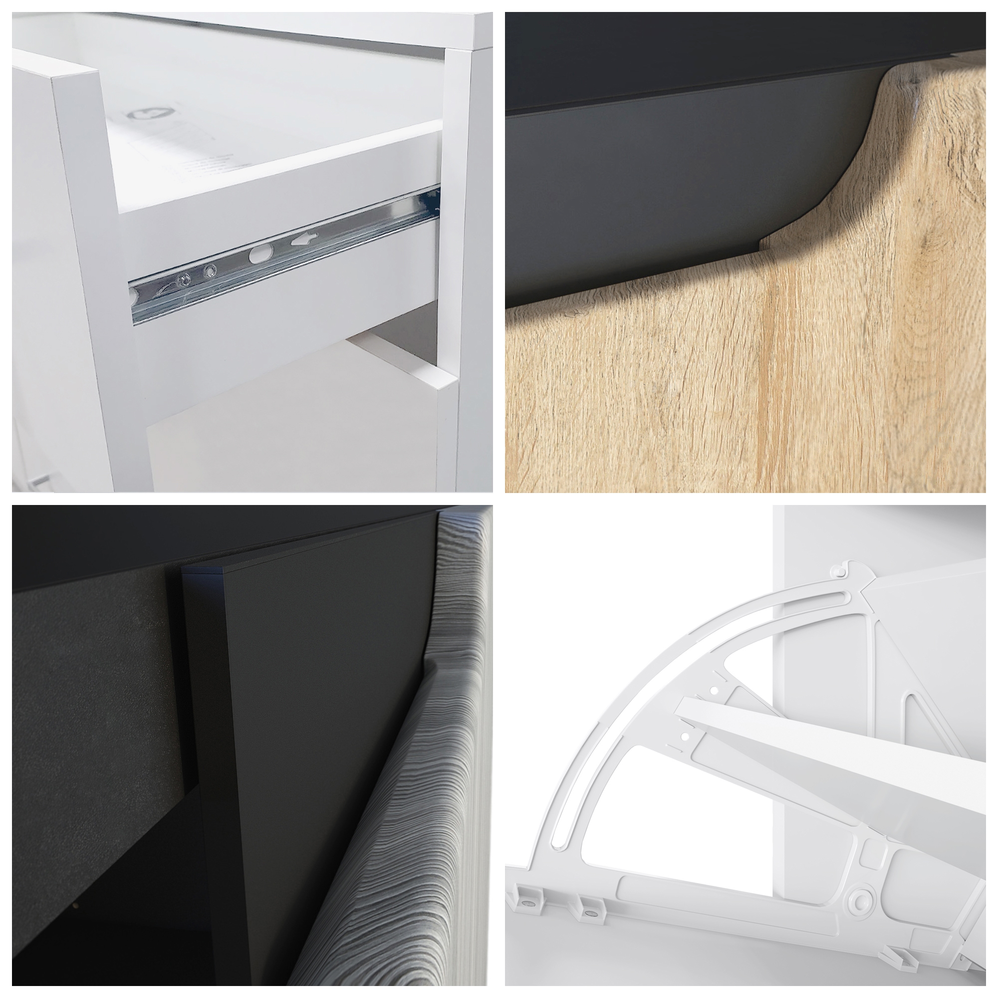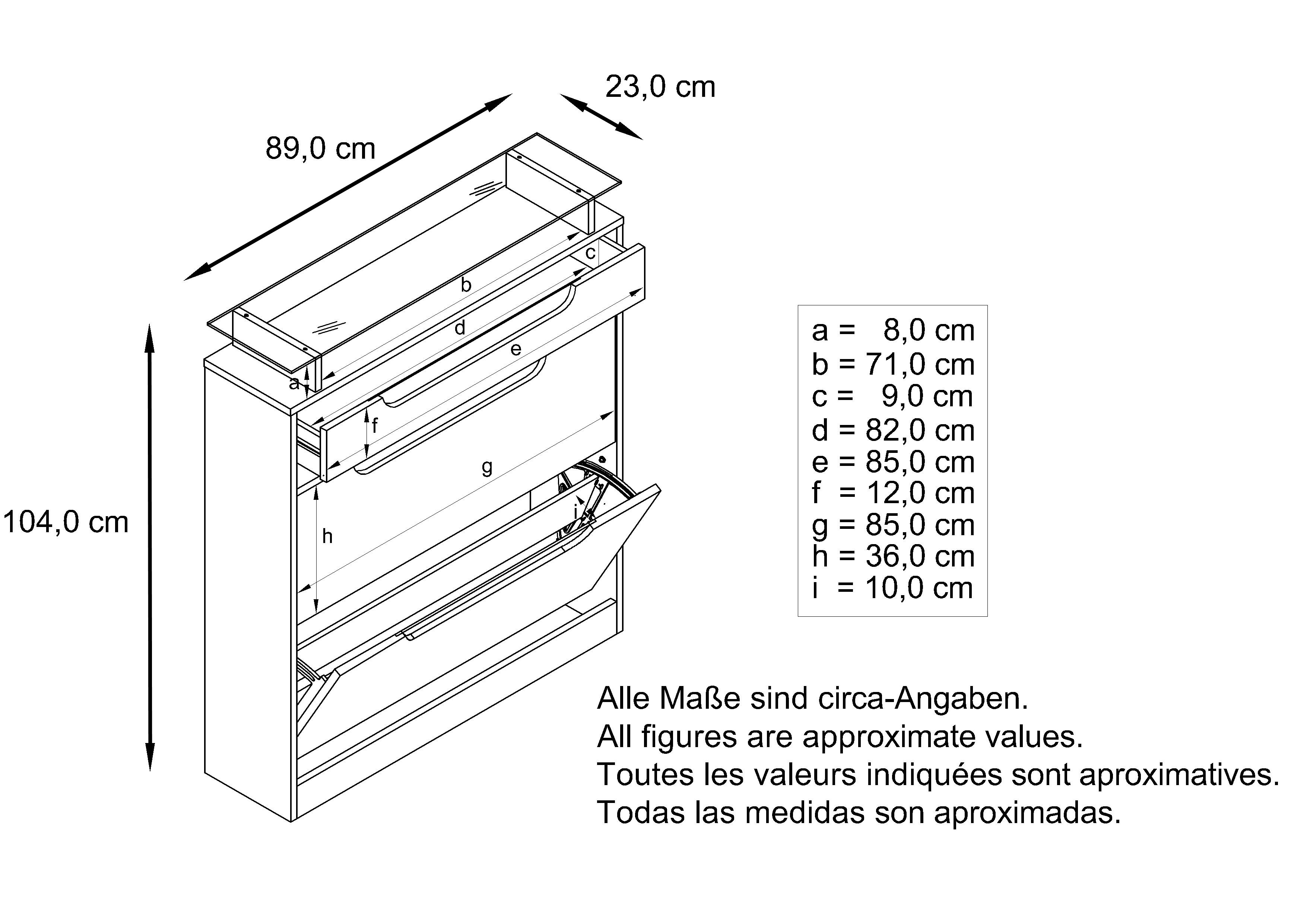 Der geräumige Standschuhschrank Fiesta präsentiert sich als praktisches Möbelstück mit modernem Design für die Diele, hergestellt in Deutschland. Das schmale Schuhregal ist mit zwei doppelreihigen Schuhkippern und mit einer leichtgängigen Schublade ausgerüstet. Diese verläuft dank Laufschienen aus Metall nahezu geräuschlos und sorgt für eine leichte Handhabung. Der Schuhorganizer ist mit praktischen Griffmulden ausgestattet und fügt sich durch die grifflose Optik schlicht in Ihren Flur ein. Zusätzlich gibt es eine aufgesetzte Glasablage für den Schuhschrank mit Schublade. Der Glasaufsatz bietet weitere Ablagefläche und lädt zum Dekorieren ein. Mit den inkludierten Beschlägen fixieren Sie das Standschuhregal, für zusätzliche Sicherheit, an der Wand. Eine Rückwand ist nicht enthalten.