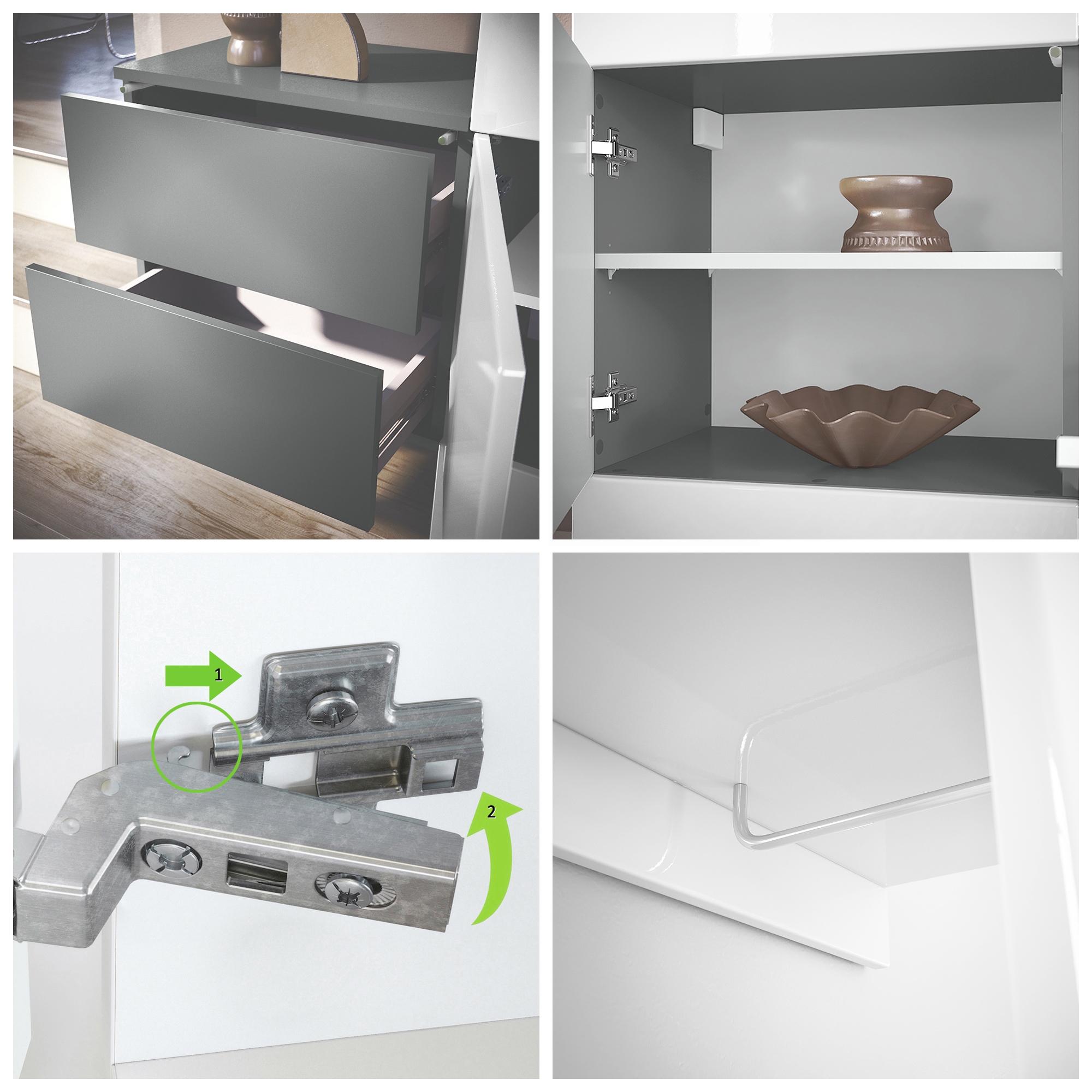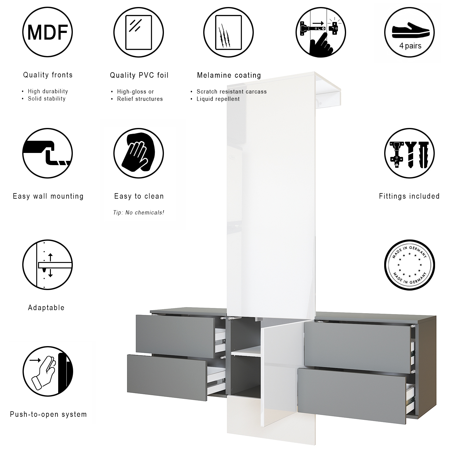 Die Schrankelemente der Garderobe sind in einem ansprechenden Anthrazit matt gehalten, das ein zeitloses und schlichtes Design verkörpert. Um die Ästhetik weiter zu betonen, wurde bewusst auf sichtbare Griffe verzichtet. Stattdessen sorgen unsere bewährten Push-to-Open-Elemente für eine elegante und funktionale Art des Öffnens der Tür und Schubladen. Die hochwertigen Metall-Montagezubehör und Laufschienen gewährleisten eine stabile und langlebige Befestigung der Elemente. Die bebilderte Montageanleitung führt Sie Schritt für Schritt durch den Aufbau und bietet Ihnen eine problemlose Selbstmontage.