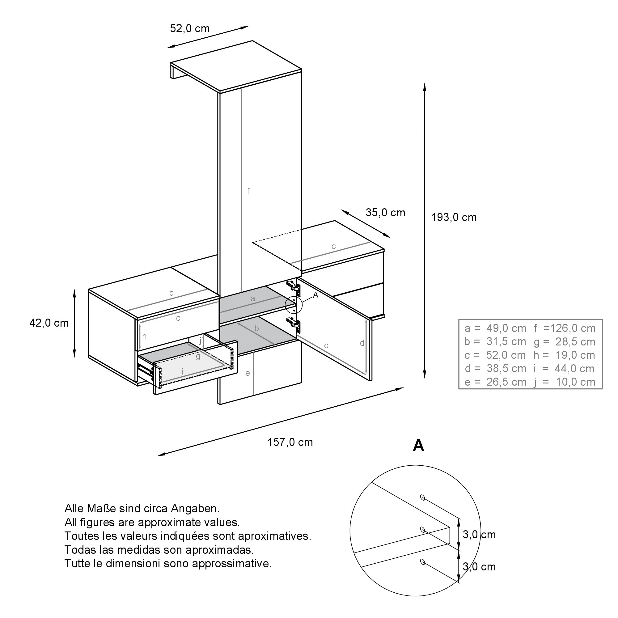 Die Gesamtmaße der Garderobe Carlton Set 3, wie aufgebaut (BxHxT), betragen 157 x 193 x 35 cm. Jeder Schubkastenschrank misst 52 x 42 x 35 cm und das Garderobenpaneel beeindruckt mit den Maßen 52 x 193 x 35 cm.