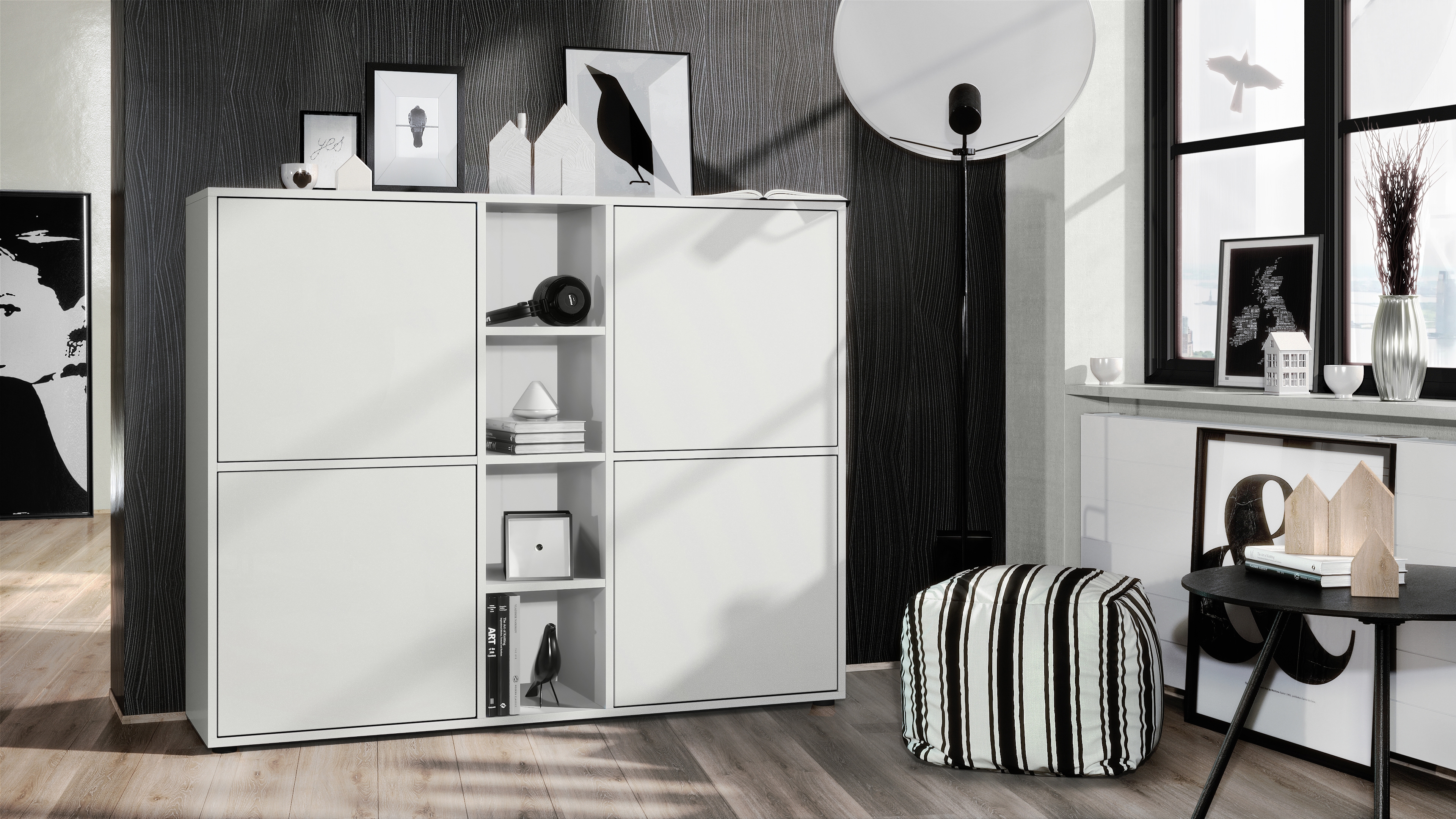 Die Besonderheit an dem Highboard ist die mittige Regaleinheit mit ihren vier offenen Fächern, die sich perfekt zum Präsentieren von Dekorationen, Büchern oder Fotos anbieten. Diese einsehbaren Fächer sind nicht nur praktisch, sondern haben auch einen ästhetischen Effekt: Durch das Hinzufügen eines neutralen Zwischenraums, welcher die vier großflächigen Schranktüren voneinander trennt, wird das Design des Highboards aufgelockert.
