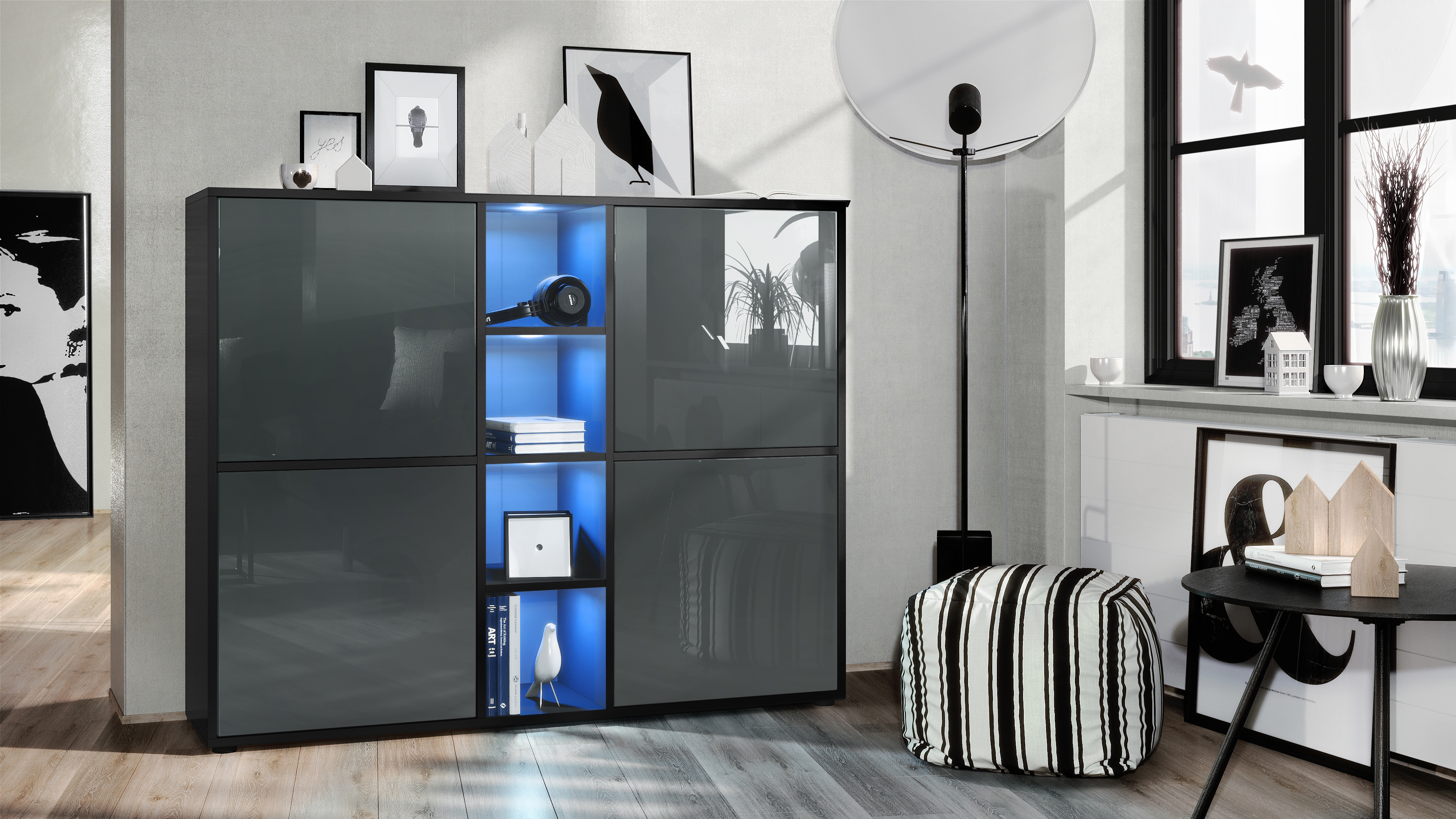Produktinformationen "Highboard Cuba V3 mit 12 Fächern, inkl. RGB LED Beleuchtung Korpus in Schwarz matt / in Grau glänzend (130,5x105,5x35,5 cm)"