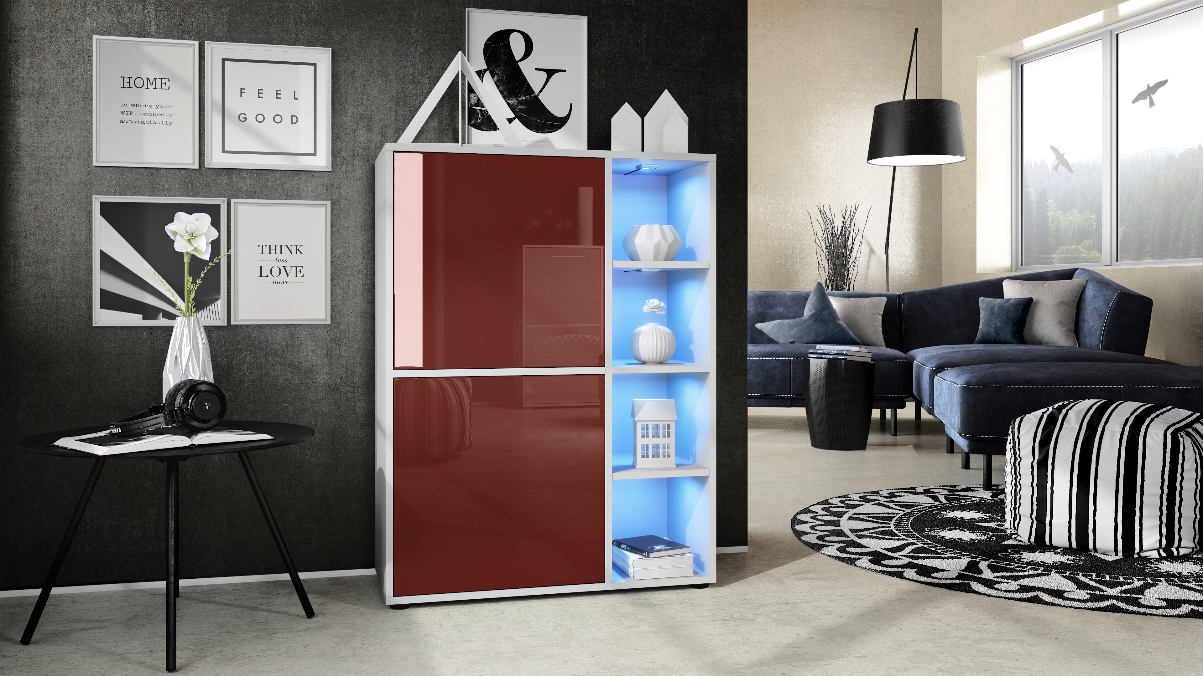 Produktinformationen "Highboard Cuba und 4 offene Fächer inkl. RGB LED Beleuchtung Weiß matt/Bordeaux Hochglanz (79 x 105,5 x 35,5 cm)"