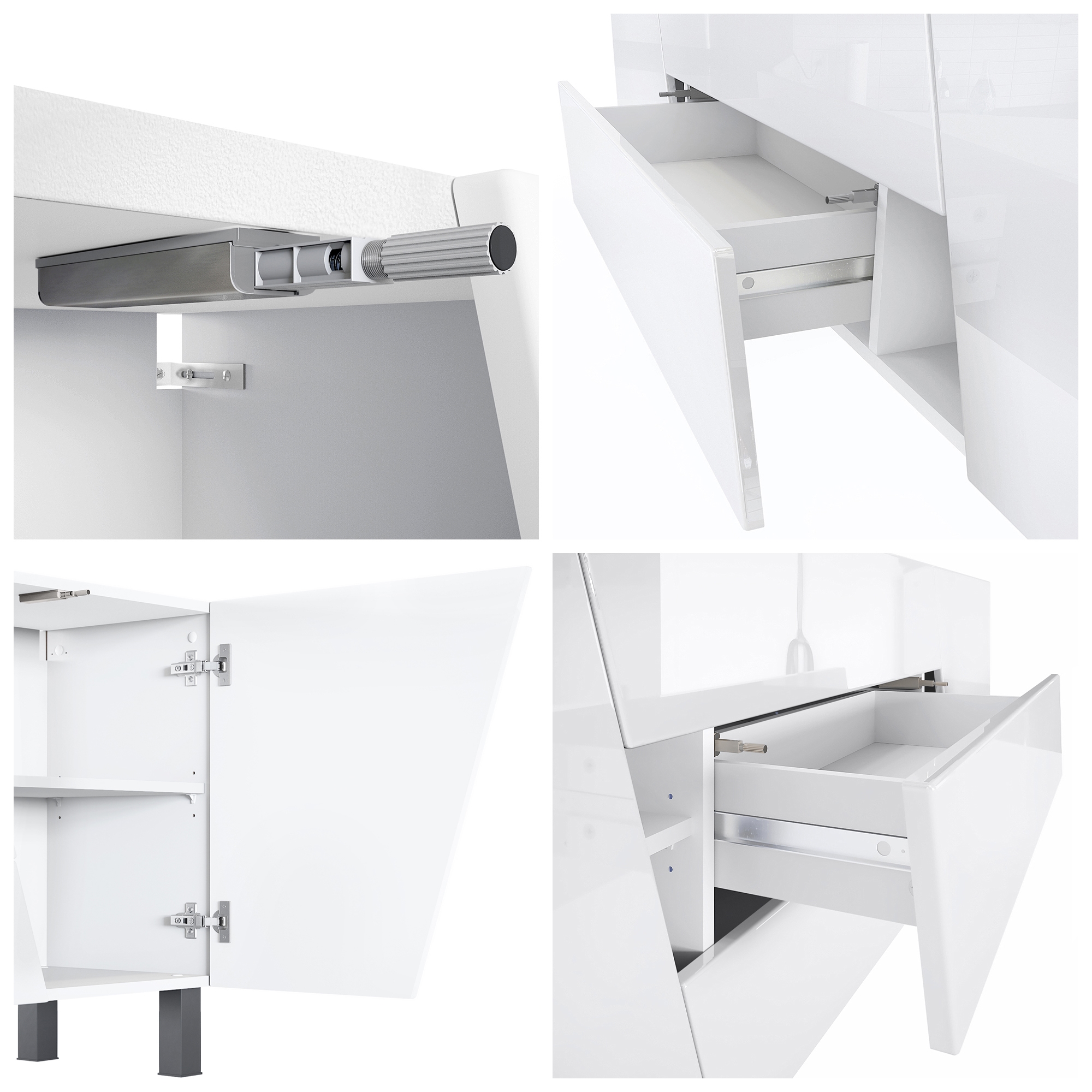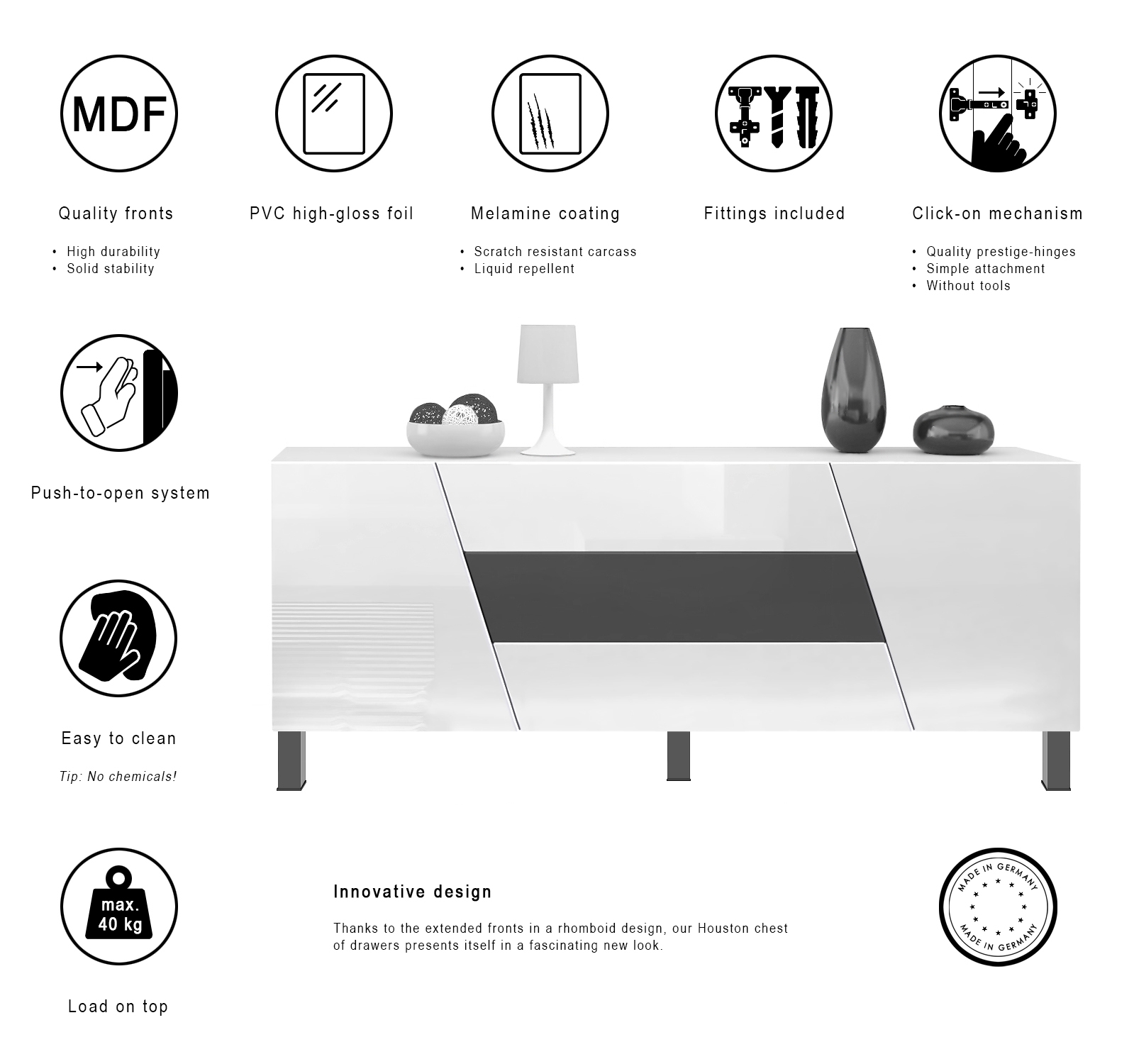 Ob als modernes Sideboard im Wohnzimmer, Kommodenschrank für's Schlafzimmer oder als Anrichte im Flur - das geräumige Sideboard Houston präsentiert sich als praktisches Möbelstück mit modernem Design, hergestellt in Deutschland. Der Beistellschrank ist mit zwei diagonal gefrästen Türen und drei leichtgängigen Schubladen ausgerüstet. Hinter den Türen befinden sich jeweils zwei geräumige Fächer mit Einlegeboden. Die Türen und Schubladen sind mit unserem Push-to-Open-System ausgestattet. Eine Rückwand in Holzoptik aus Hartfaserplatten ist im Lieferumfang enthalten.
