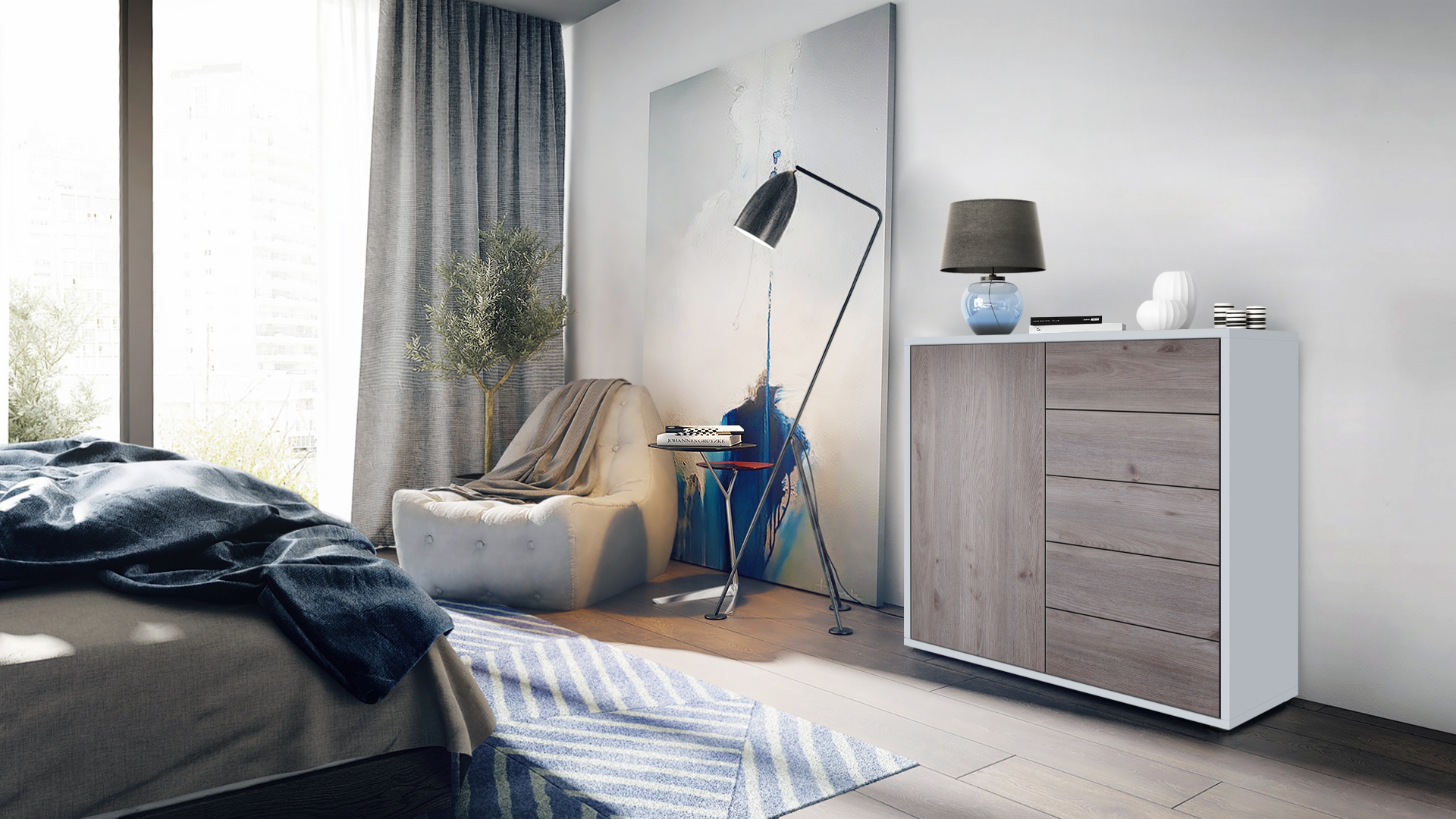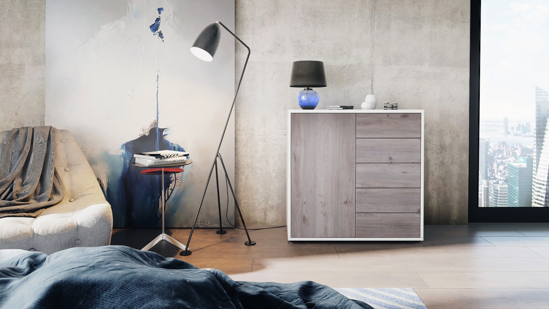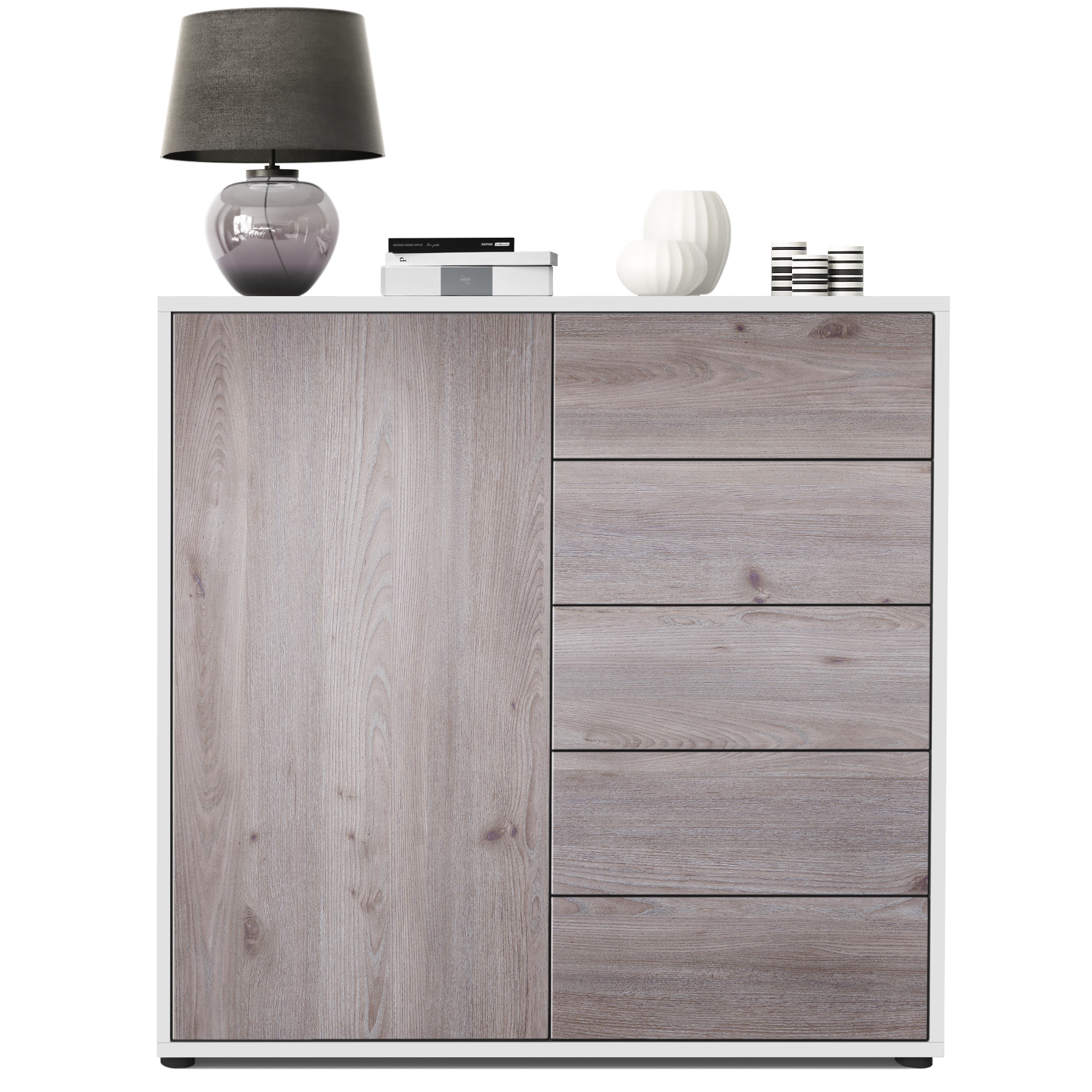 Produktinformationen "Kommode Ben V2 mit 1 Tür und 5 Schubladen Weiß matt/Eiche Nordic (79 x 74 x 36 cm)"