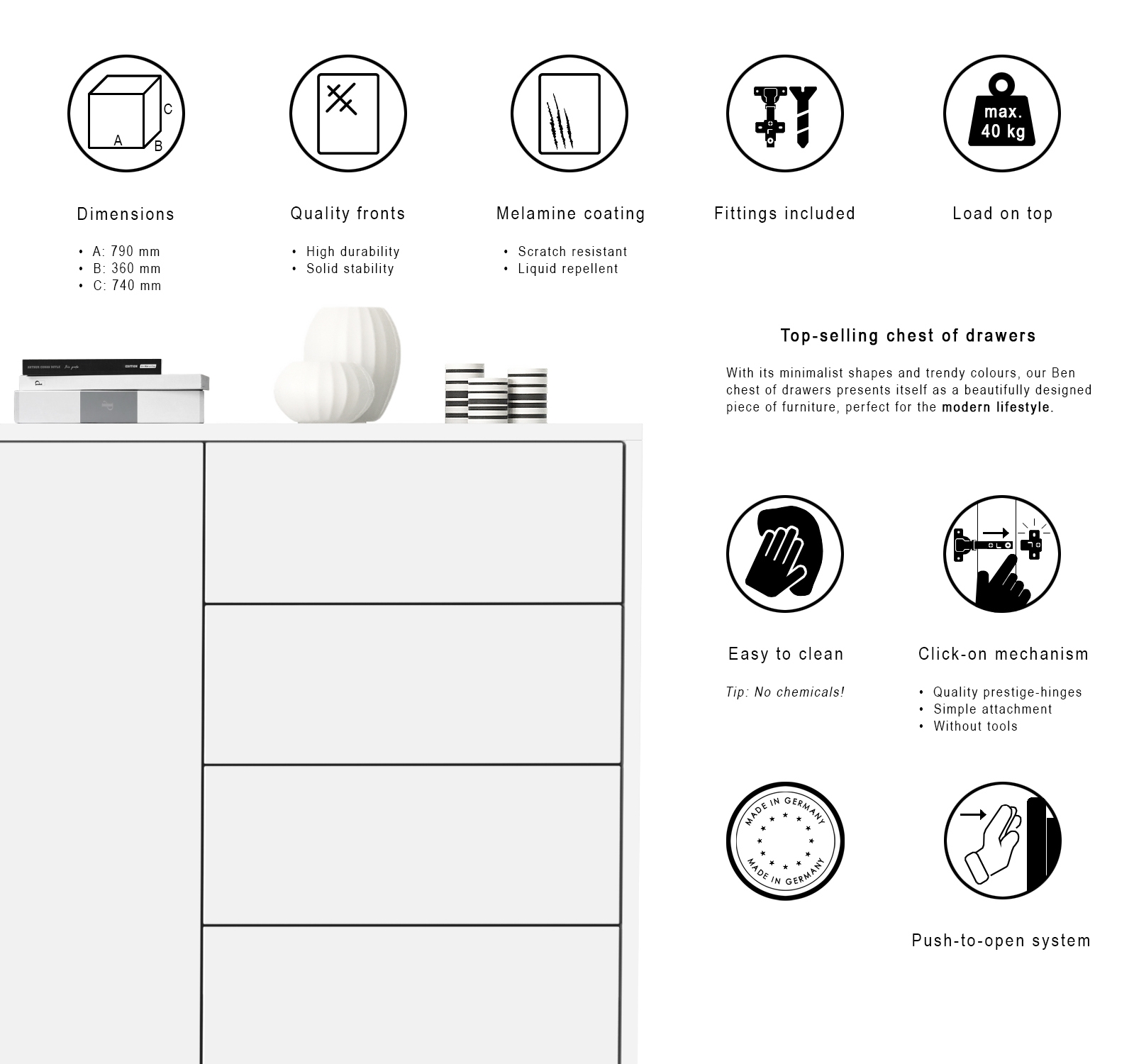 Ob als modernes Sideboard im Wohnzimmer, Kommodenschrank für's Schlafzimmer, Anrichte im Flur oder als Kommode im Kinderzimmer - die geräumige Kommode Ben V2 präsentiert sich als praktisches Möbelstück mit modernem Design, hergestellt in Deutschland. Der Beistellschrank ist mit einer großen Tür und fünf leichtgängigen Schubladen ausgerüstet. Hinter der Tür befinden sich zwei geräumige Fächer mit einem Einlegeboden. Die Tür und Schubladen sind mit unserem Push-to-Open-System ausgestattet.  Eine Rückwand in Holzoptik aus Hartfaserplatten ist im Lieferumfang enthalten.