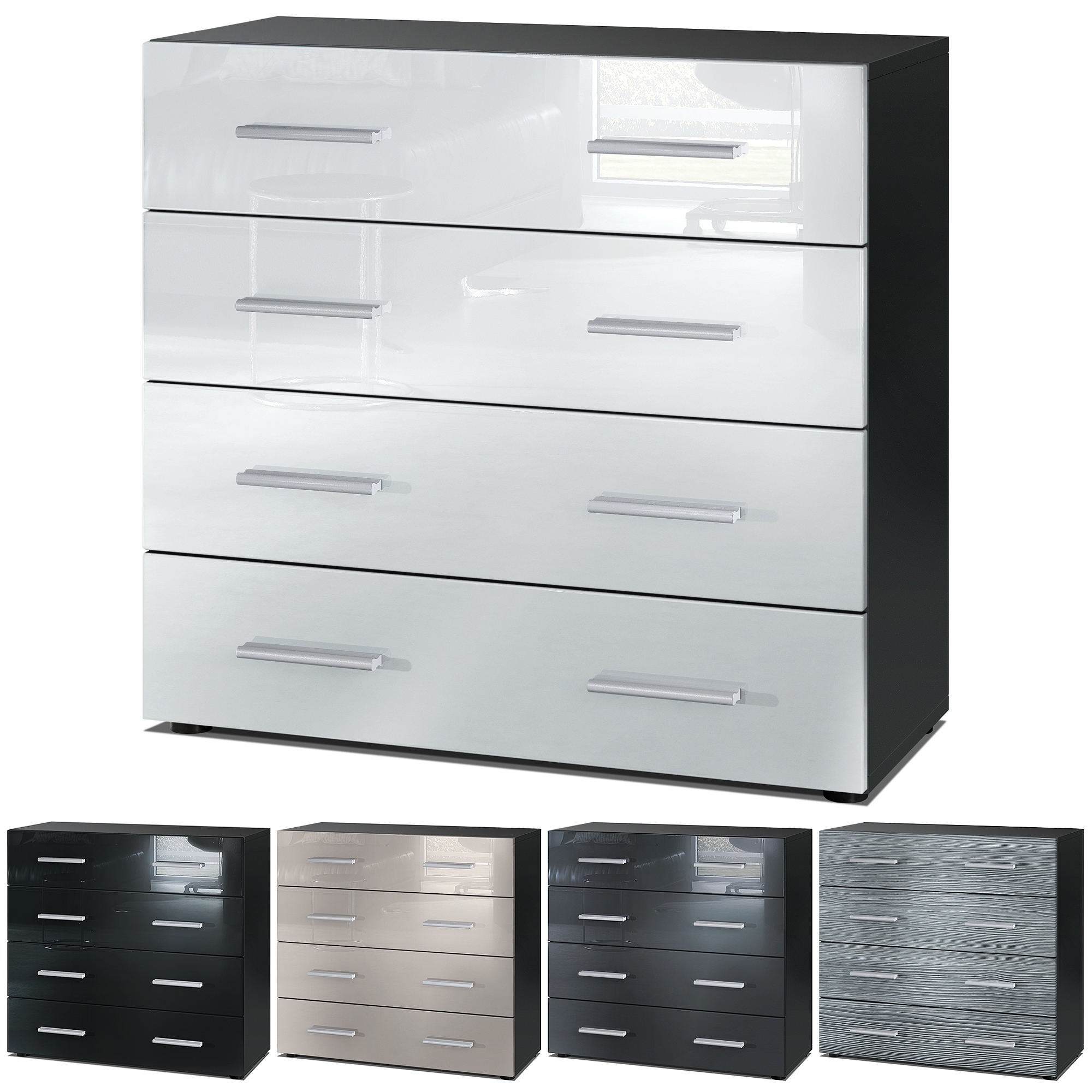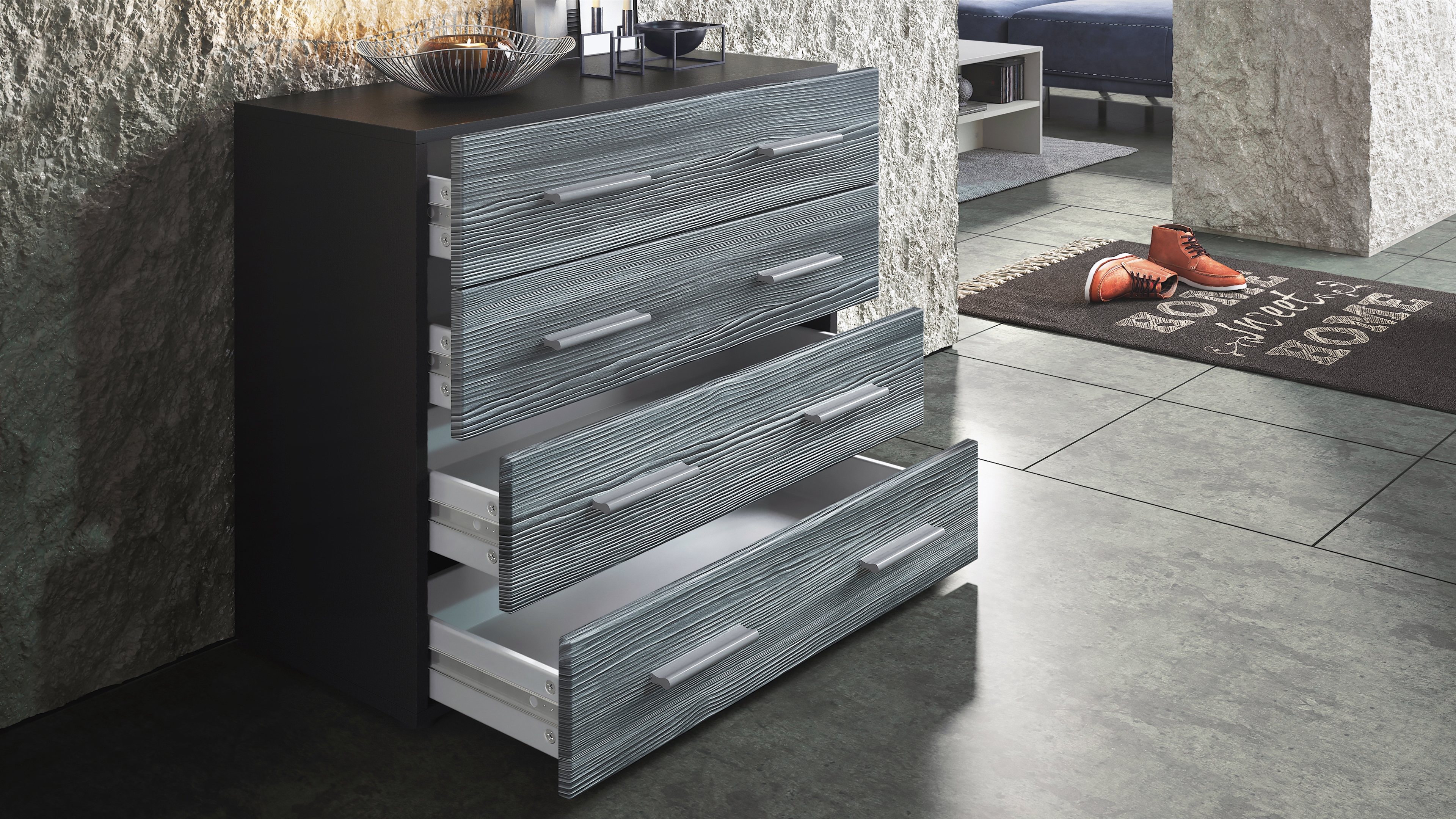 Ob als modernes Sideboard im Wohnzimmer, Kommodenschrank für's Schlafzimmer, Anrichte im Flur oder als Kommode im Kinderzimmer - die geräumige Kommode Pavos präsentiert sich als praktisches Möbelstück mit modernem Design, hergestellt in Deutschland. Der Beistellschrank ist mit vier leichtgängigen Schubladen ausgerüstet. Diese verlaufen dank Laufschienen aus Metall nahezu geräuschlos und sorgen für eine leichte Handhabung. Die Schubladen sind mit dezenten, silbernen Griffen ausgestattet. Optional können Sie zusätzlich eine aufgesetzte Glasablage für das Sideboard wählen. Der Glasaufsatz bietet weitere Ablagefläche und lädt zum Dekorieren ein. Eine Rückwand in Holzoptik aus Hartfaserplatten ist im Lieferumfang enthalten.