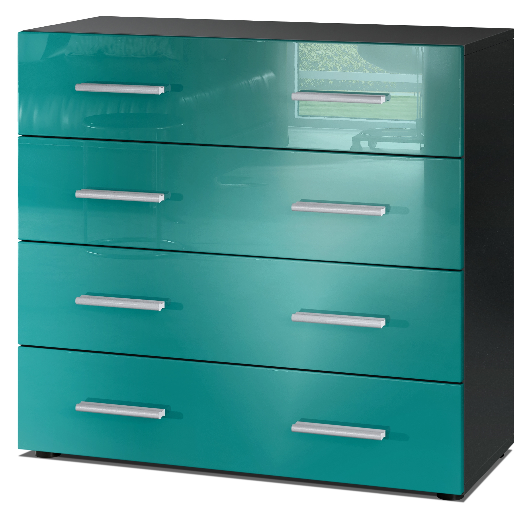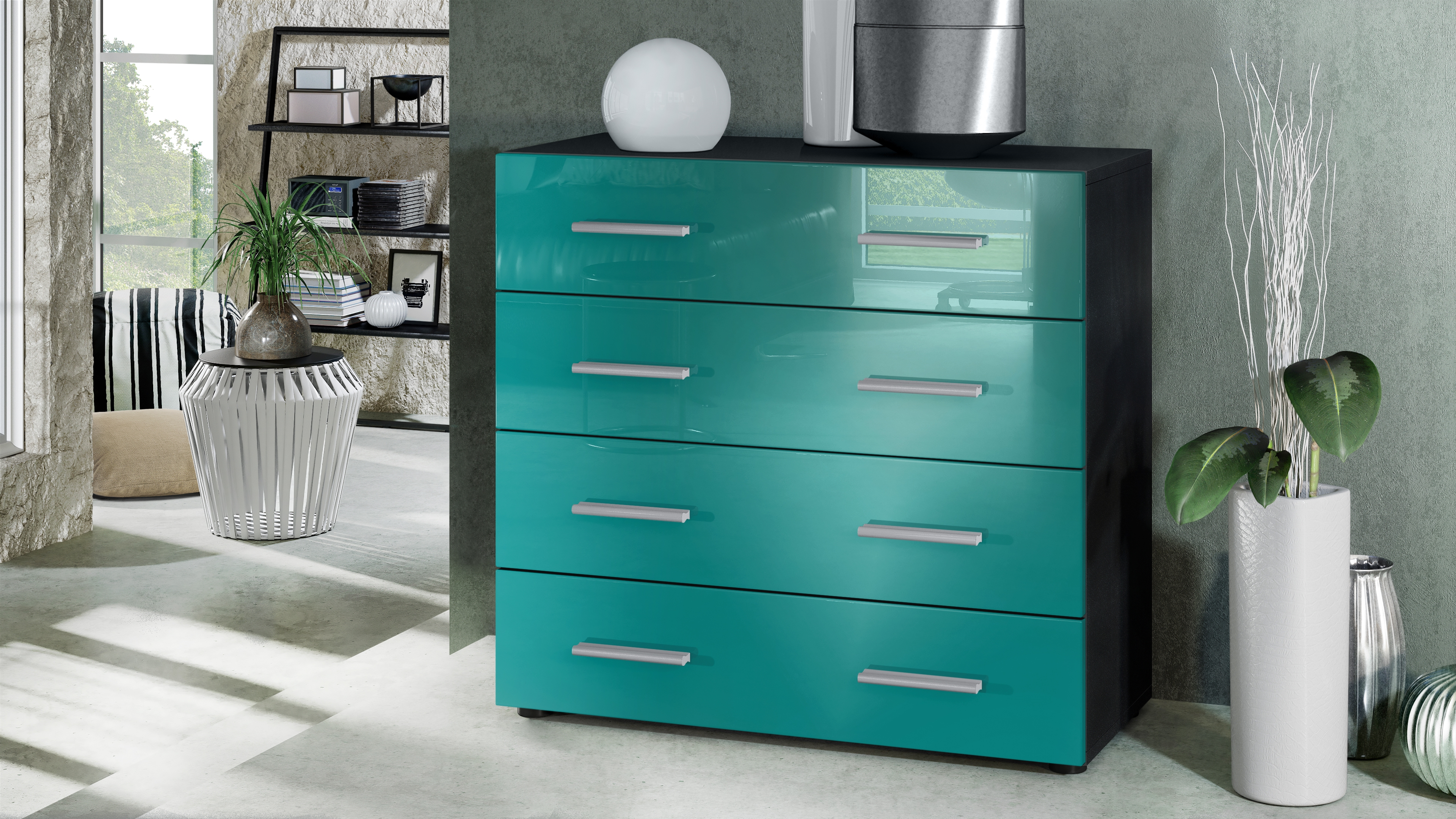 Produktinformationen "Kommode Pavos V1 mit 4 Schubladen Schwarz matt/Petrol Hochglanz (76 x 72 x 35 cm)"